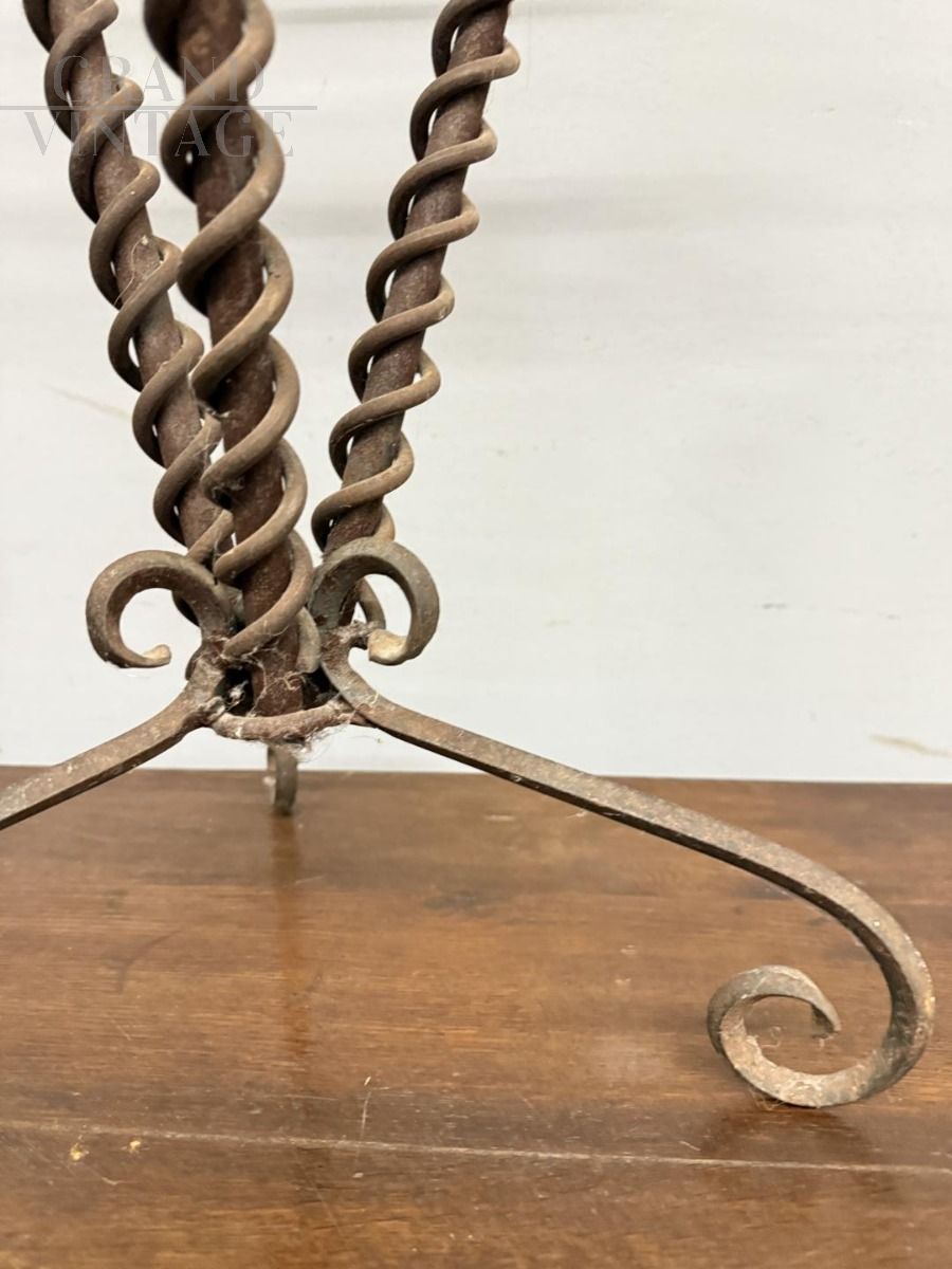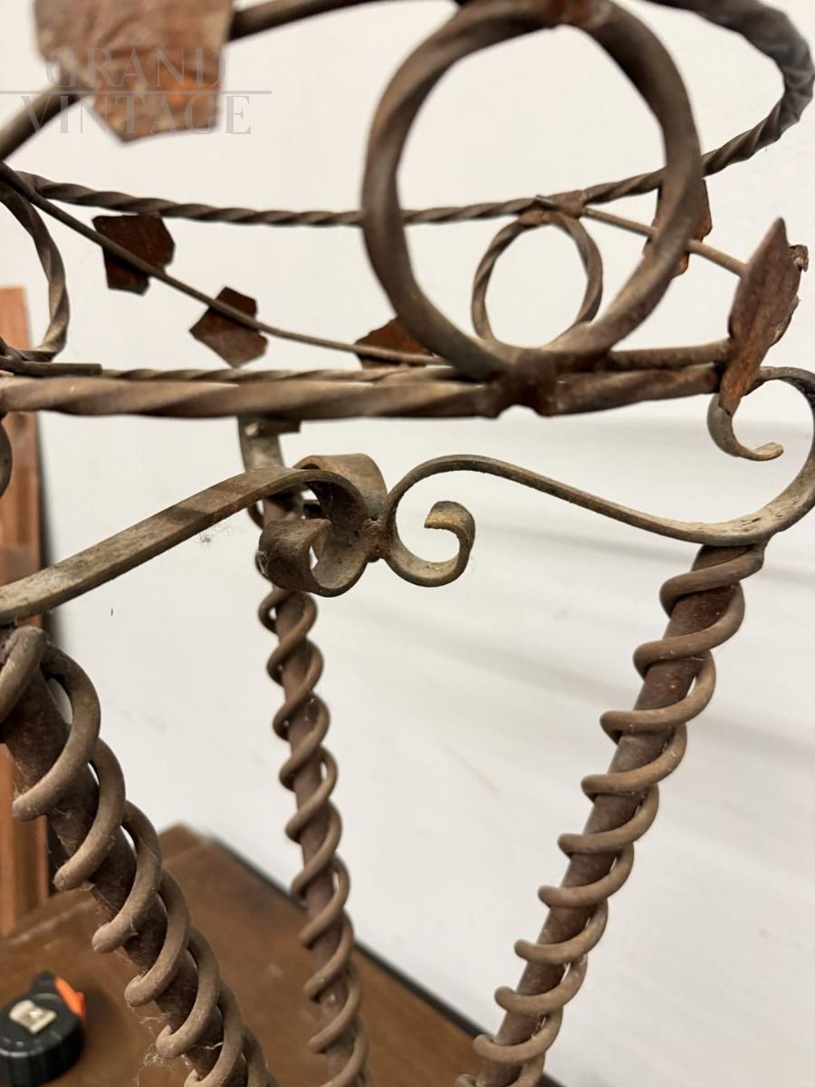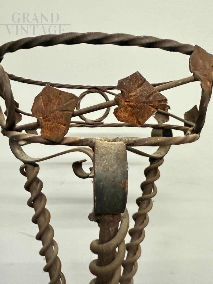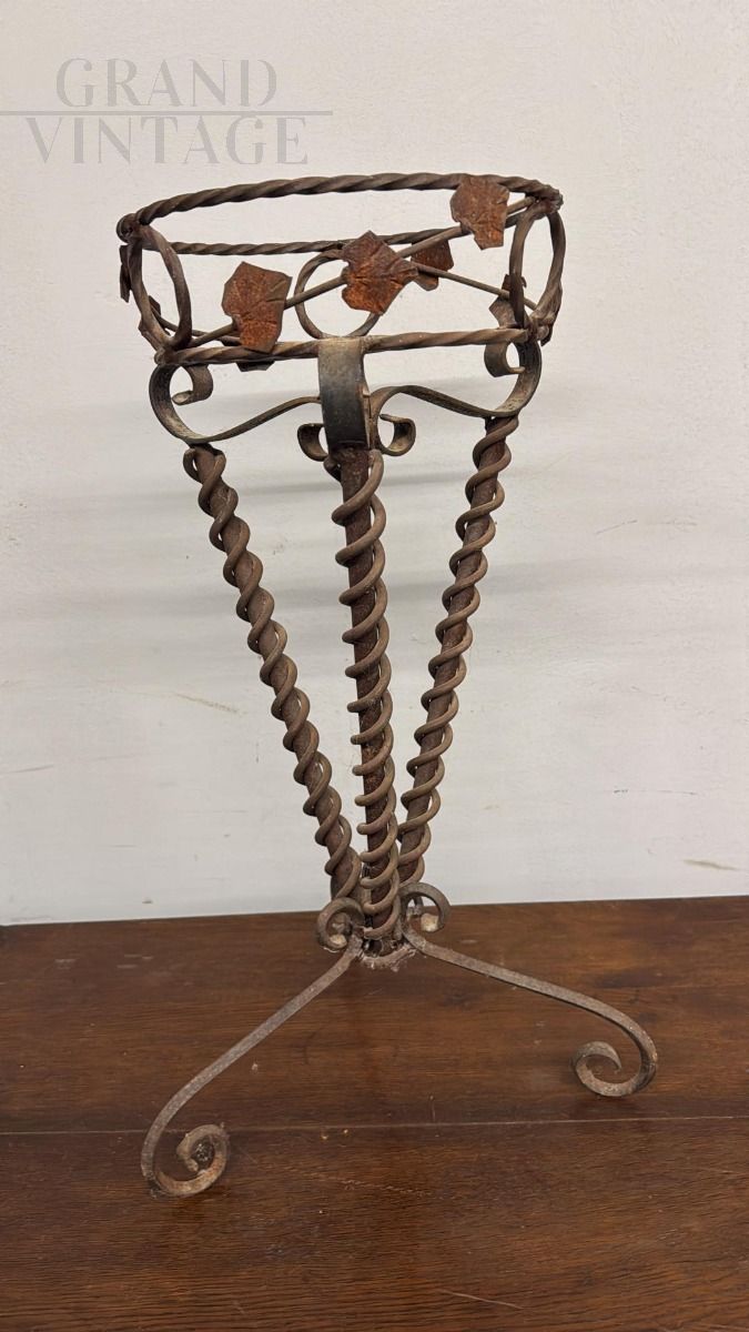 Fioriera porta vaso liberty in ferro battuto lavorato con motivi floreali, realizzato nei primi del '900, altezza 61 cm - diametro 29 cm. In buono stato di conservazione.