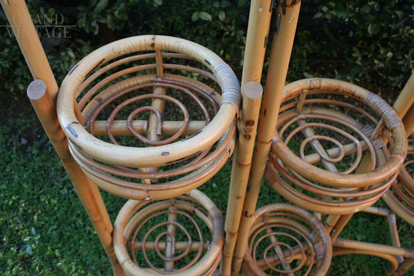 Fioriera vintage verticale in bamboo, richiudibile, organizzata in 3 sezioni e con 6 cesti portafiori, perfetta per piante rampicanti per formare un bel separé. Italia anni '60 - '70.