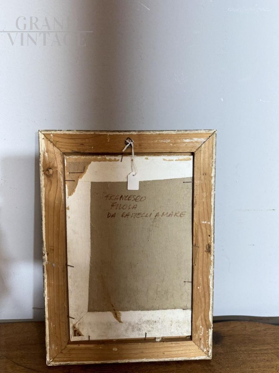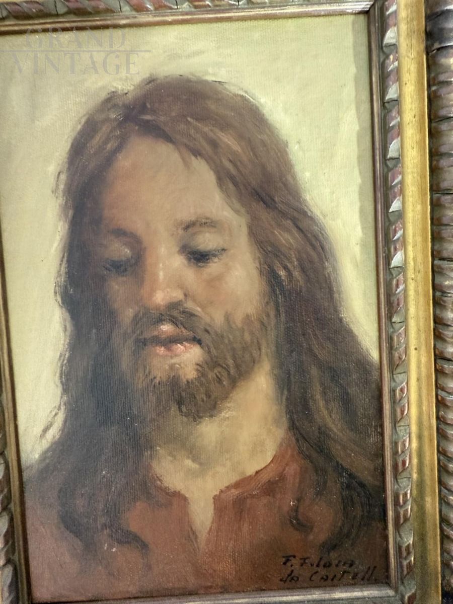 Antico dipinto ad olio raffigurante il ritratto di Gesù firmato da Francesco Filosa di Castellammare di Stabia, realizzato negli anni '50 - '60, in buono stato generale, completo di cornice coeva. Misure con cornice: 37 x 27 cm, misura solo dipinto su faesite 30 x 20 cm.