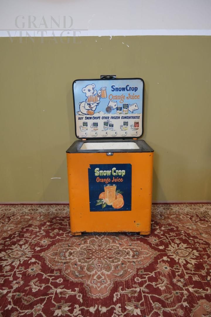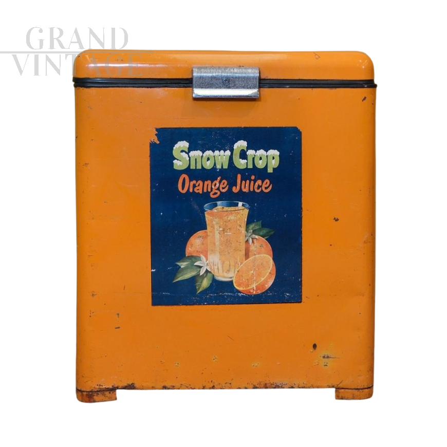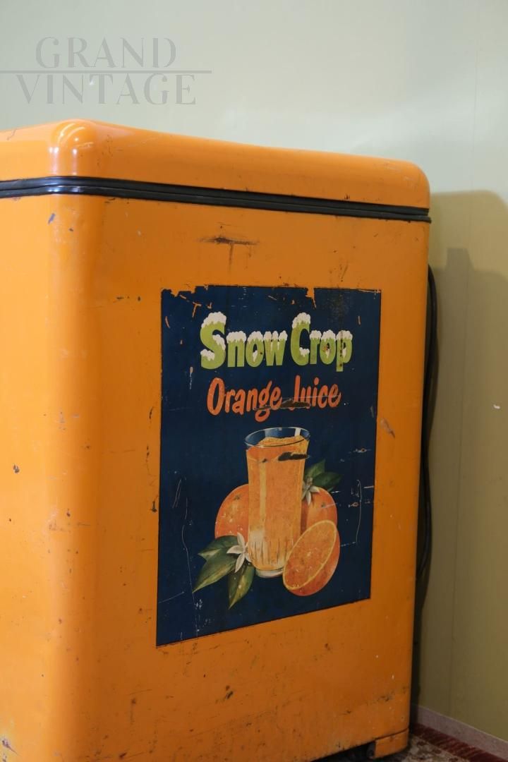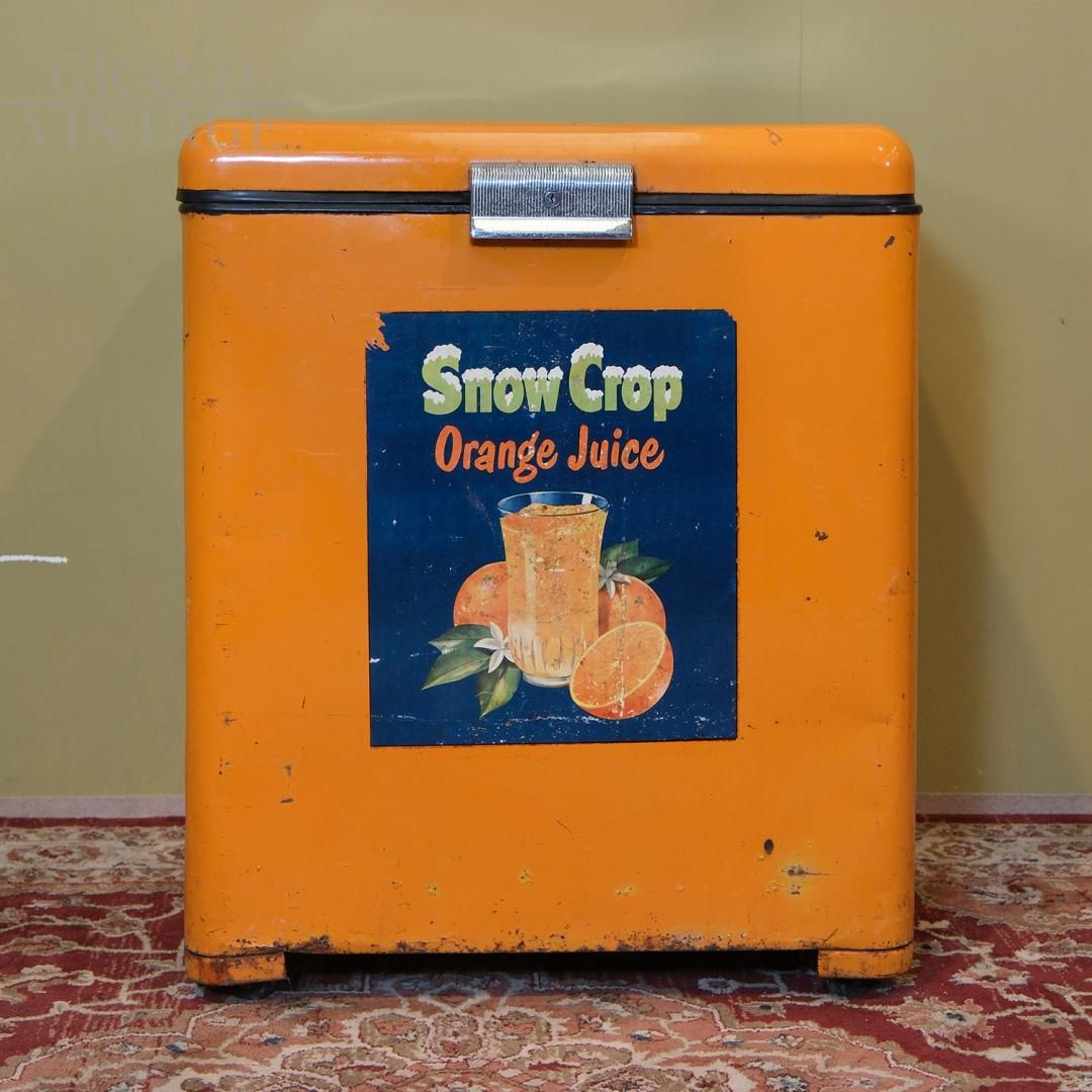 Vintage e coloratissimo, questo frigorifero freezer pubblicitario Snow Crop Orange Juice proviene dall'America ed era utilizzato per conservare al fresco le granite di arancia o di altri frutti, con la sua vivace tonalità arancione e la grafica storica è ideale per aggiungere una nota autentica e scenografica a cucine o locali.