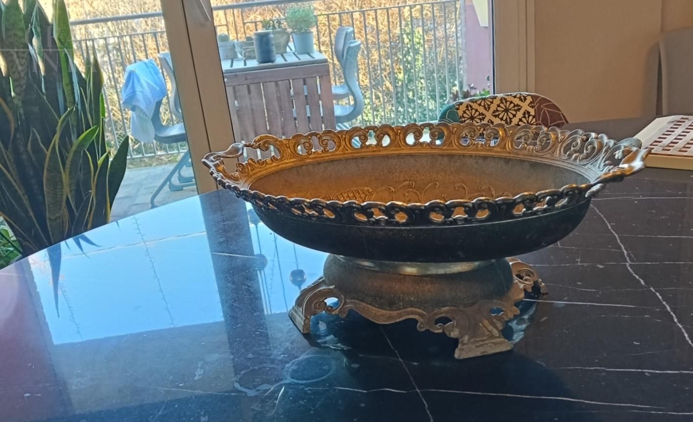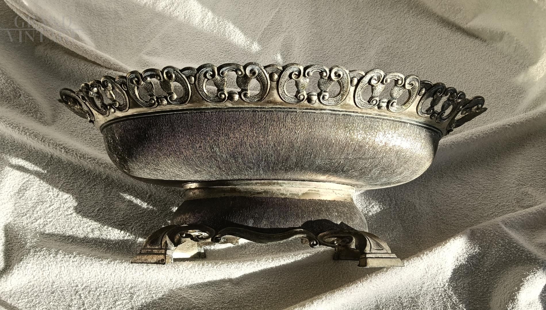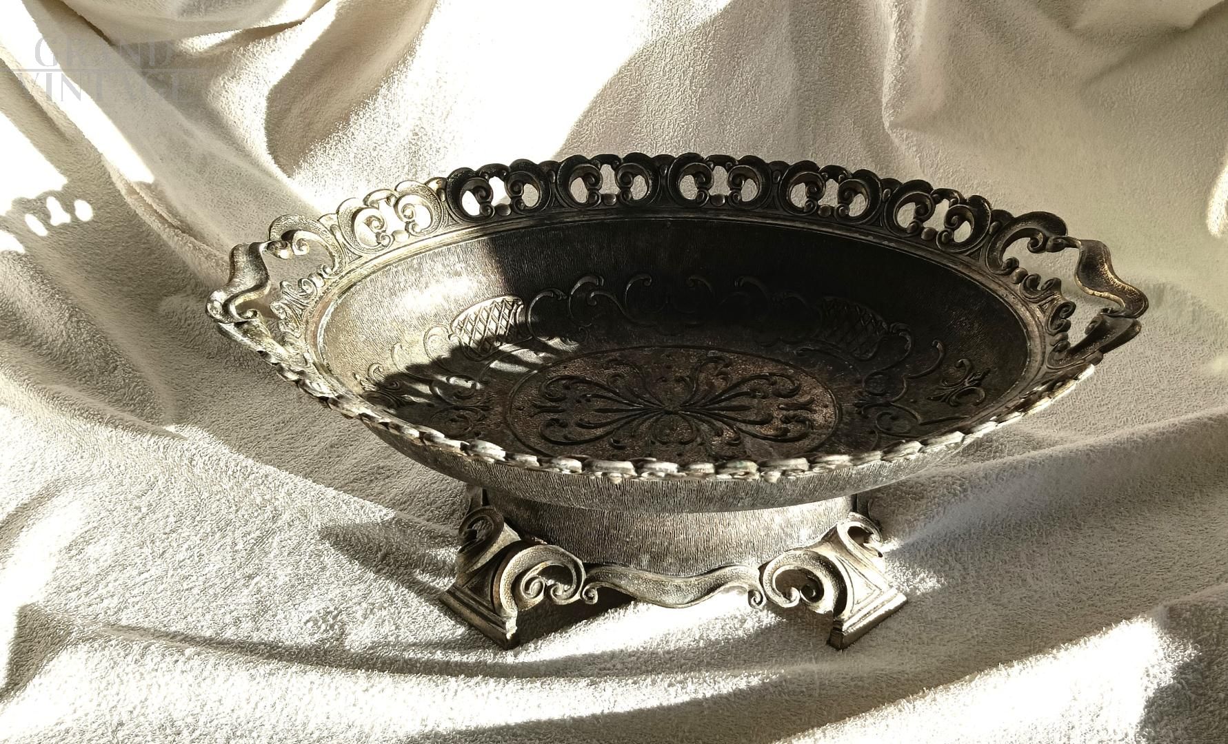 Grande fruttiera centrotavola vintage in peltro, finemente decorata in stile rinascimentale, realizzato in Italia nella Sicilia degli anni '50, è piuttosto pesante e di grandi dimensioni!