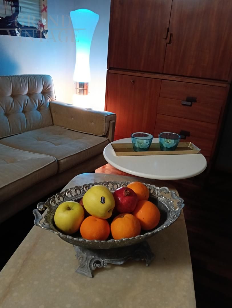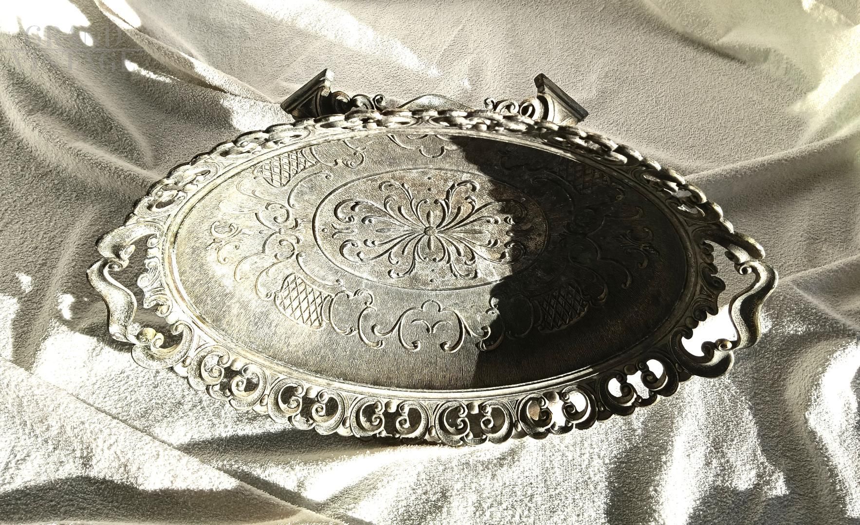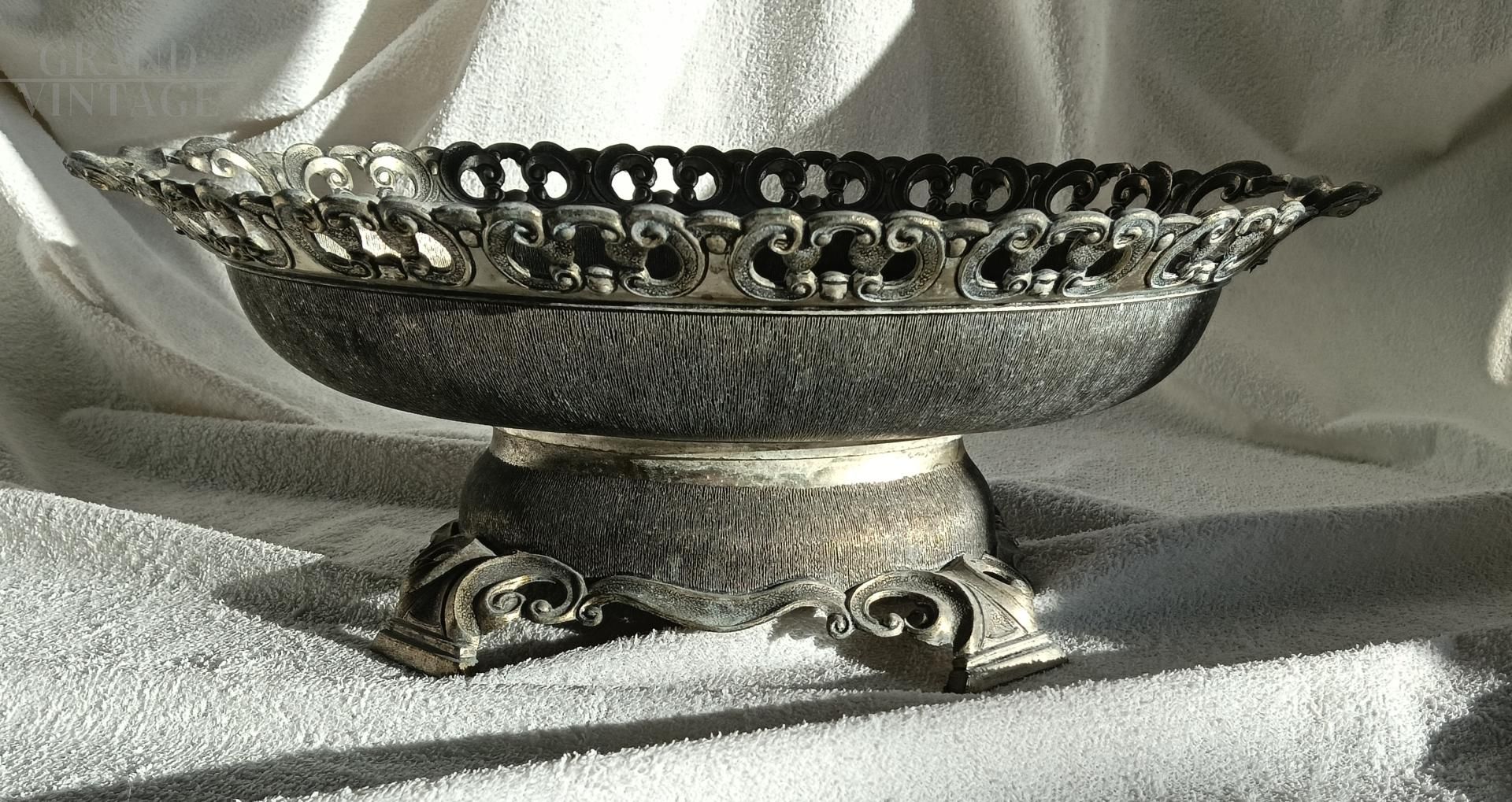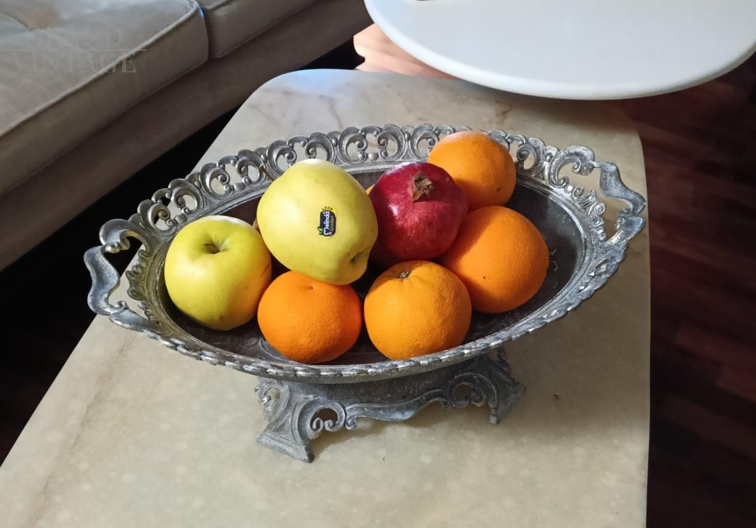 Grande fruttiera centrotavola vintage in peltro, finemente decorata in stile rinascimentale, realizzato in Italia nella Sicilia degli anni '50, è piuttosto pesante e di grandi dimensioni!