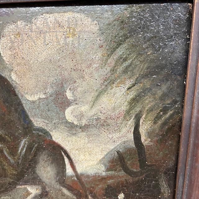 Dipinto antico olio su tela raffigurante Fuga d’ Egitto, di scuola italiana del XVII secolo. In buono stato di conservazione, non sono necessari interventi. Completo di cornice in legno di epoca successiva.