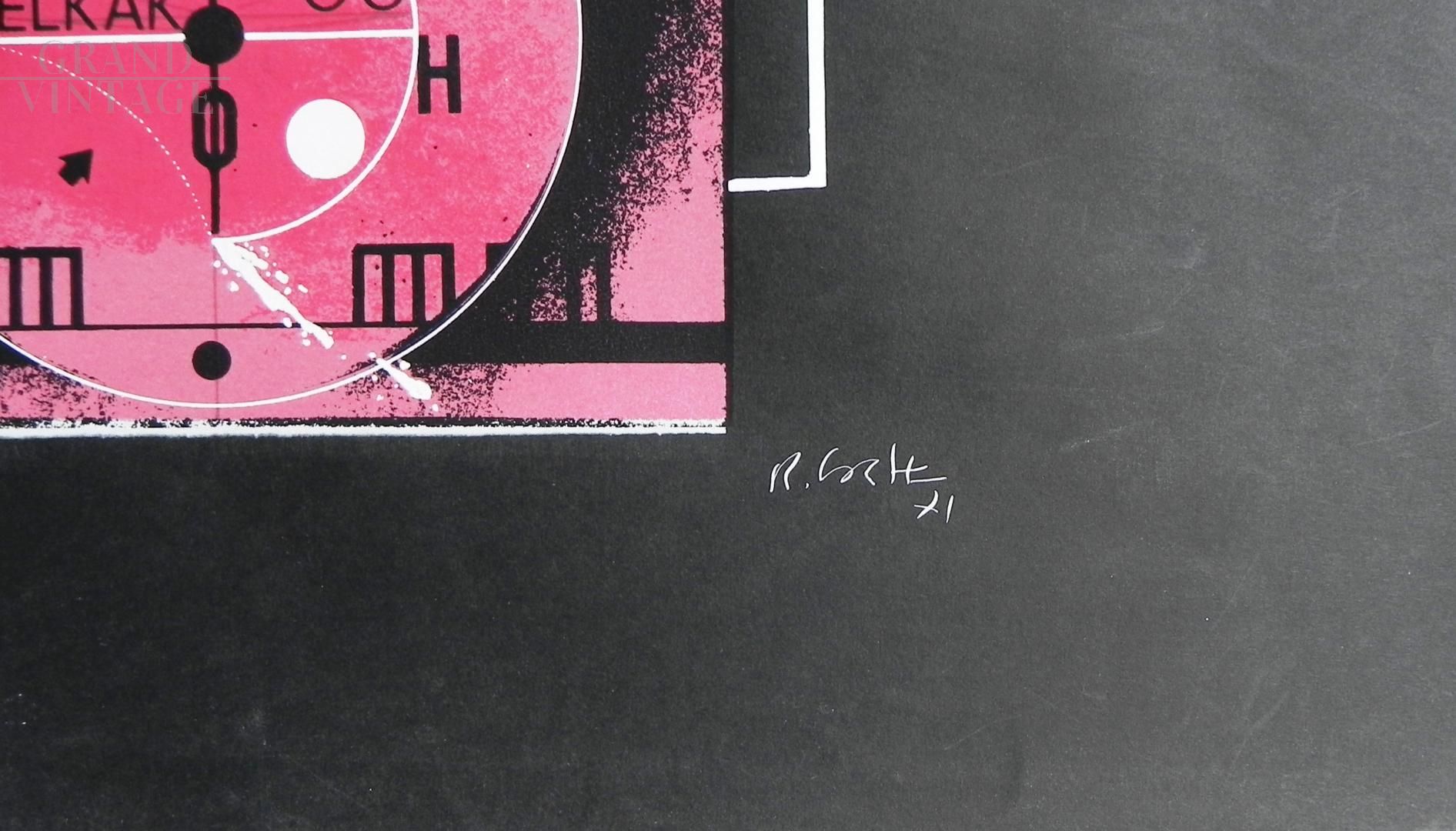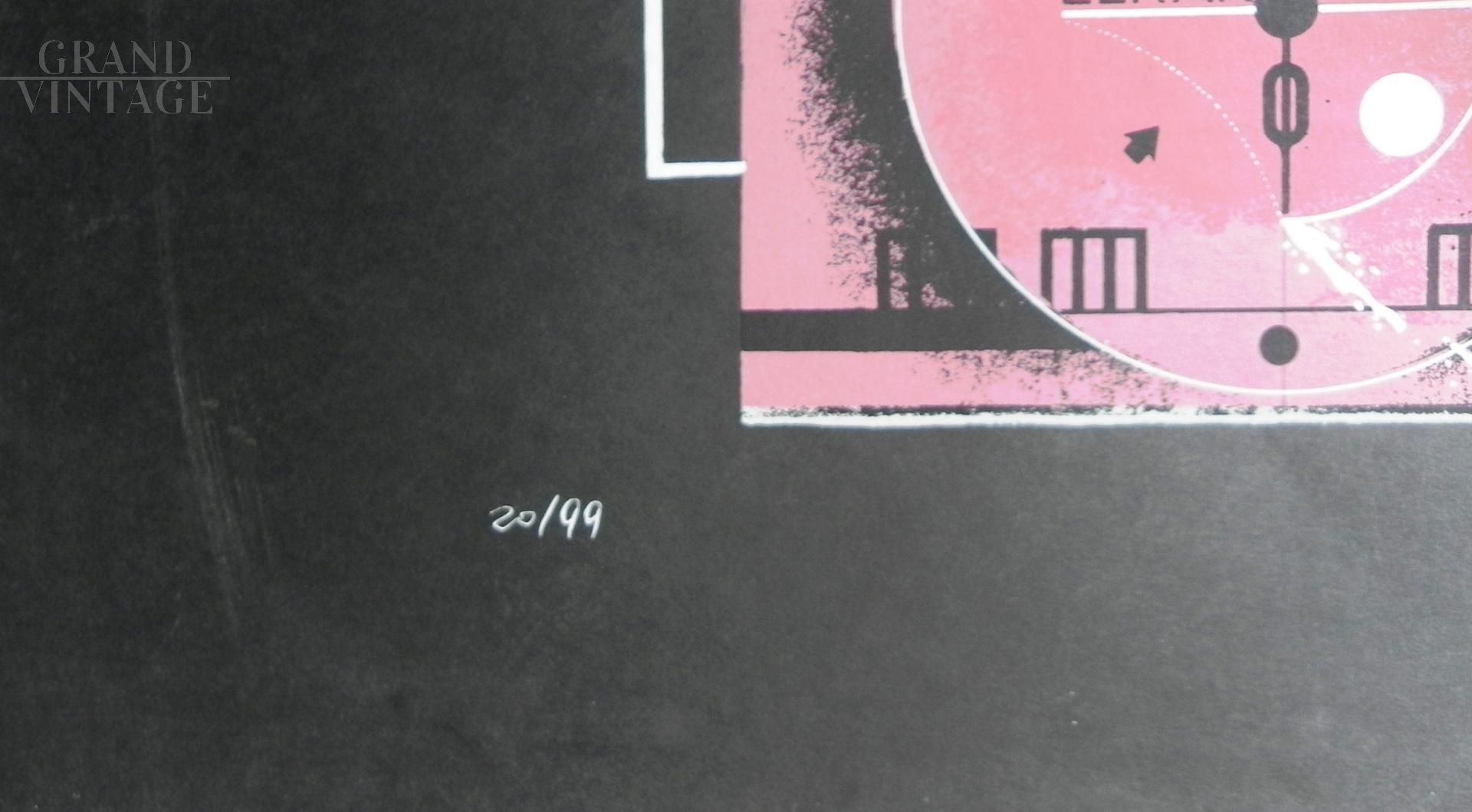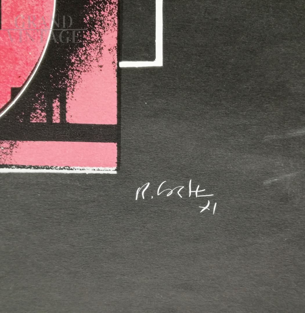 Serigrafia con soggetto Geometrie Falliche, firmato, datato 1971 e numerato 20/99, stampa su cartoncino nero incollata a un supporto tipo picoglass, senza vetro. La firma è in basso a destra. In buone condizioni.