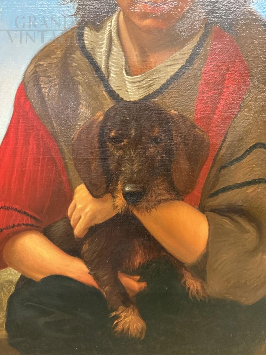 Giancarlo Pignataro, dipinto di ragazza con cagnolino, olio su tela del 1987
