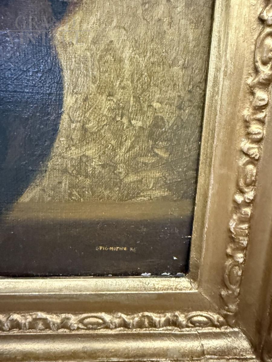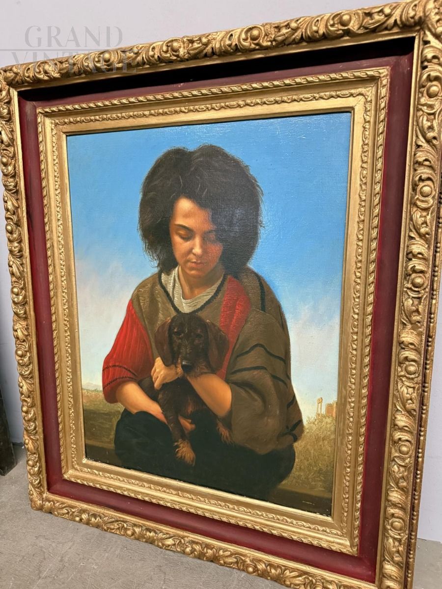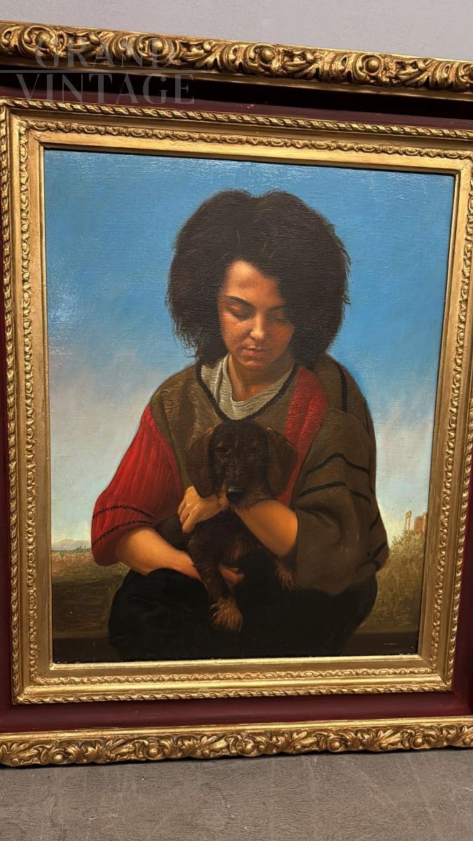 Dipinto di Giancarlo Pignataro raffigurante una ragazza con cagnolino, olio su tela firmato e datato 1987. Il dipinto è completo di cornice dorata con misure 98 x 82 cm, misure solo tela 71 x 55 cm. Si tratta di un'opera di importante qualità pittorica. Giancarlo Pignataro nato nel 1958 ad Albanella, vicino Paestum, si è formato a Roma dove si diploma al Liceo Artistico. Studia all'Accademia di Belle Arti di Roma e di Perugia. Da giovanissimo ha ricevuto l'apprezzamento e la spinta a continuare il proprio lavoro da vari artisti già affermati quali Annigoni, Ziveri e Riccardo Tommasi Ferroni. Giancarlo Pignataro , artista molto apprezzato ,si dedica alla pittura, eseguita con varie tecniche che spaziano dall'affresco, alla tempera, olio e alla scultura realizzata con vari materiali tra cui la terracotta, il marmo e il bronzo.