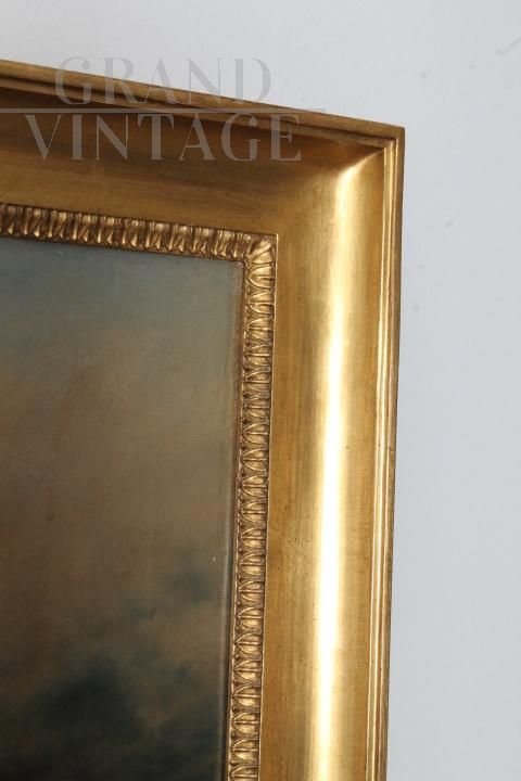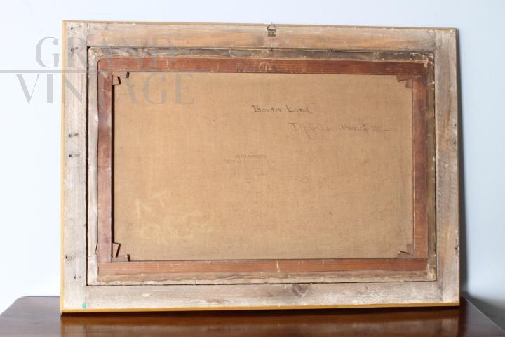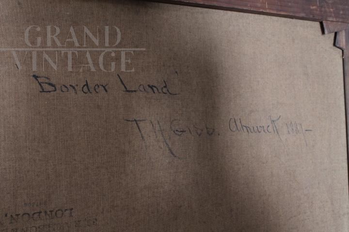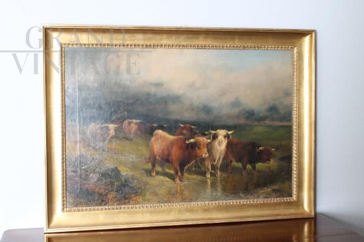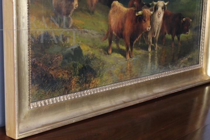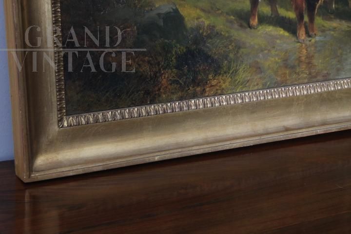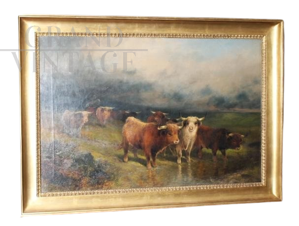 Splendido dipinto antico di Gibb Thomas Henry raffigurante una paesaggio con mucche al pascolo, olio su tela firmato e datato 1887, sua sulla tela in basso a destra che sul retro. Di importante qualità pittorica, il dipinto è in ottimo stato, completo di cornice dorata.