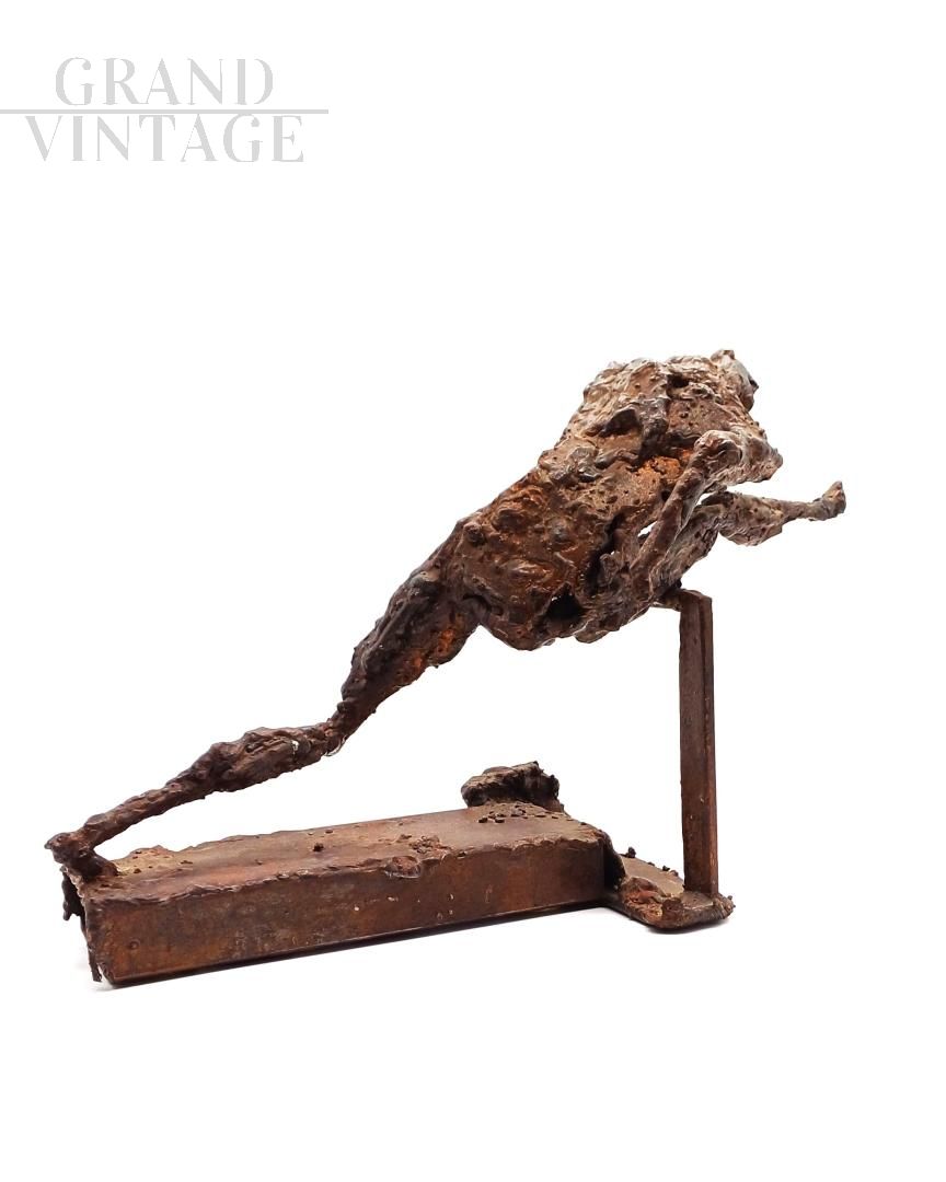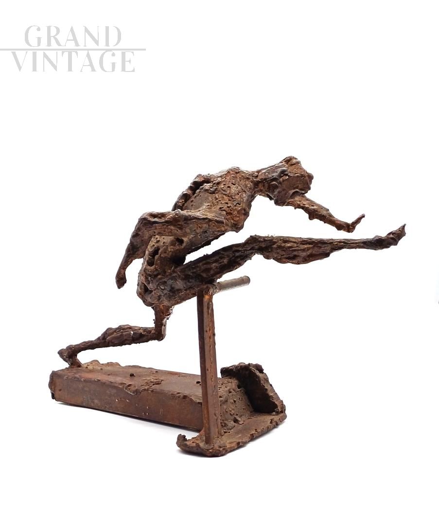 Scultura in bronzo a patina bruna ad opera di Giovanni Naglia (Ravenna 1895-1968) artista, scultore, pittore attivo nel corso del XX sec. Raffigurante figura umana stilizzata in movimento dinamico, poggiante su base rettangolare. L'opera presenta una composizione moderna con forme geometrizzanti e superfici lavorate che evidenziano il contrasto tra zone lisce e texturizzate. La figura sembra rappresentare un atleta o corridore in azione con linguaggio scultoreo che risente delle influenze del futurismo e dell'art déco. Firmata alla base. Condizioni originali, integra.