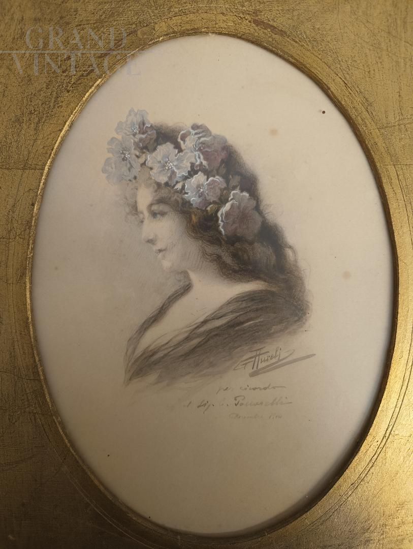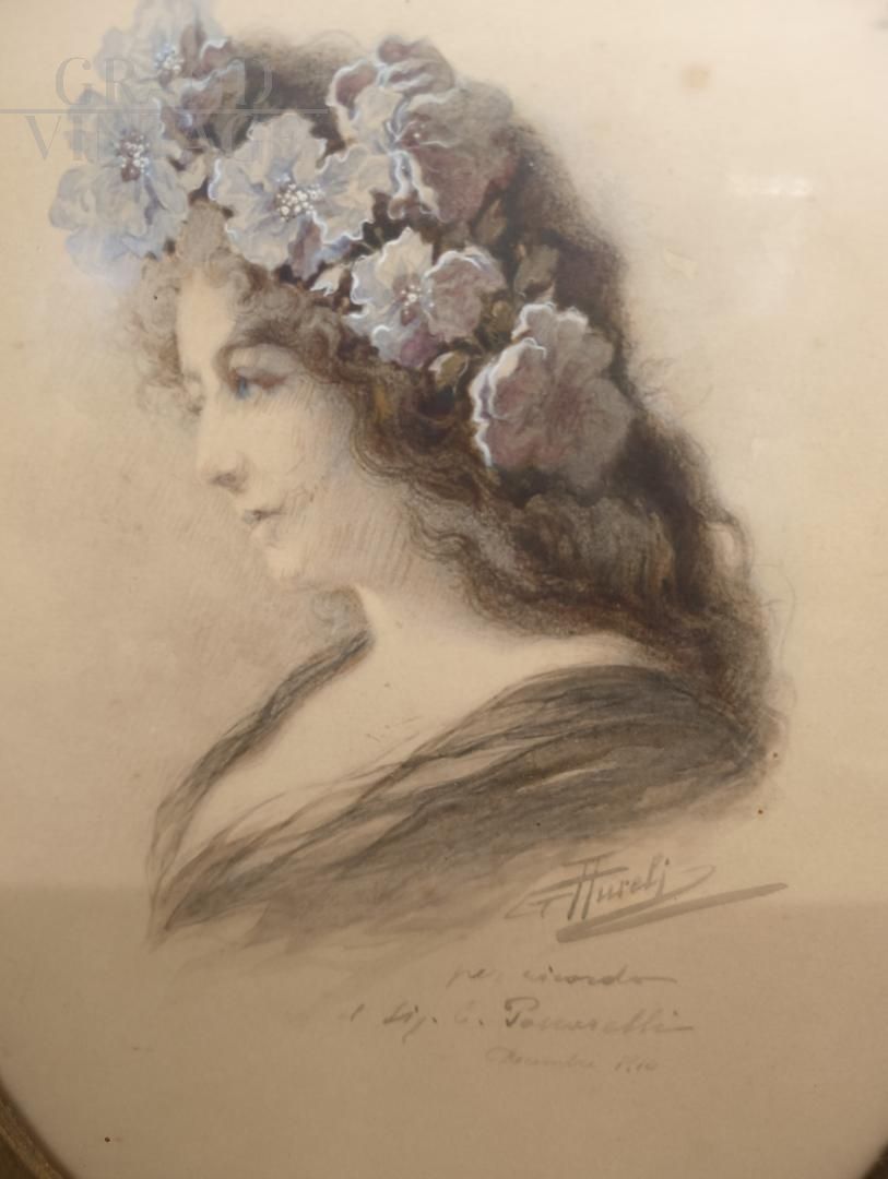 Dipinto ad acquerello su carta, di grande qualità, raffigurante volto di fanciulla di gusto Liberty, firmato e datato in basso a destra con dedica: Giuseppe Aureli, Roma, 1910, in cornice antica dorata.