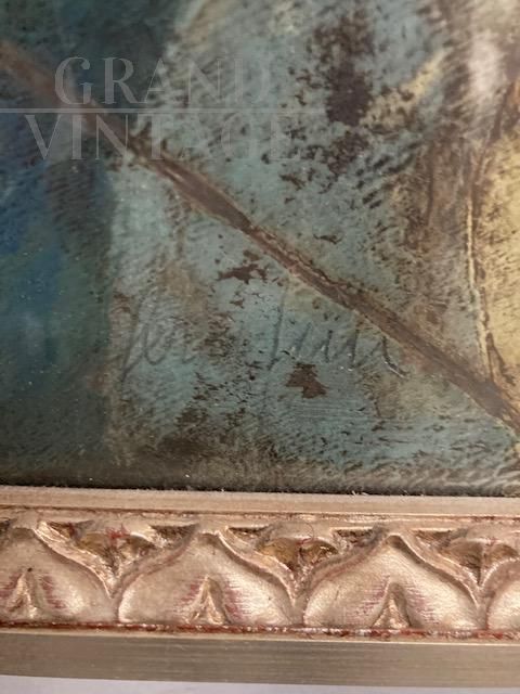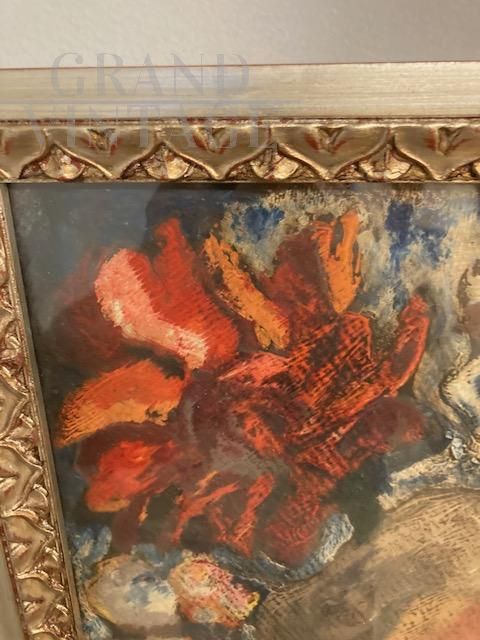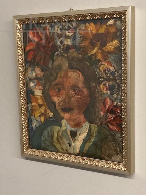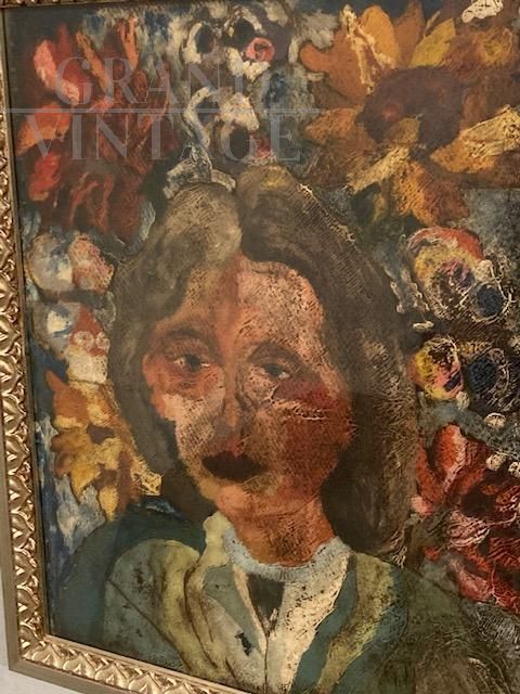 Dipinto contemporaneo ritratto di ragazza con fiori di Giuseppe Serafini, olio su cartone anni '60, firmato in pasta alla base.