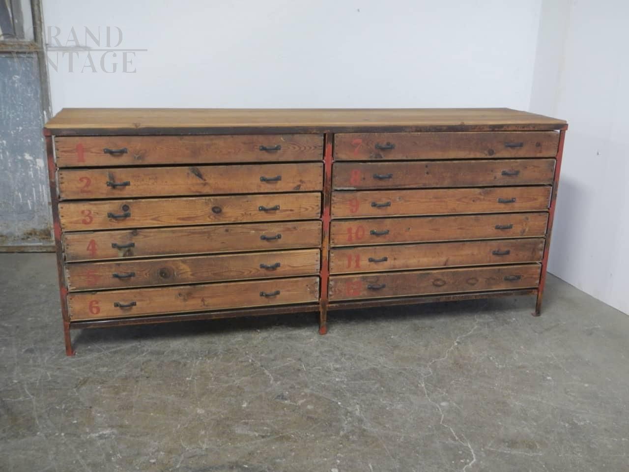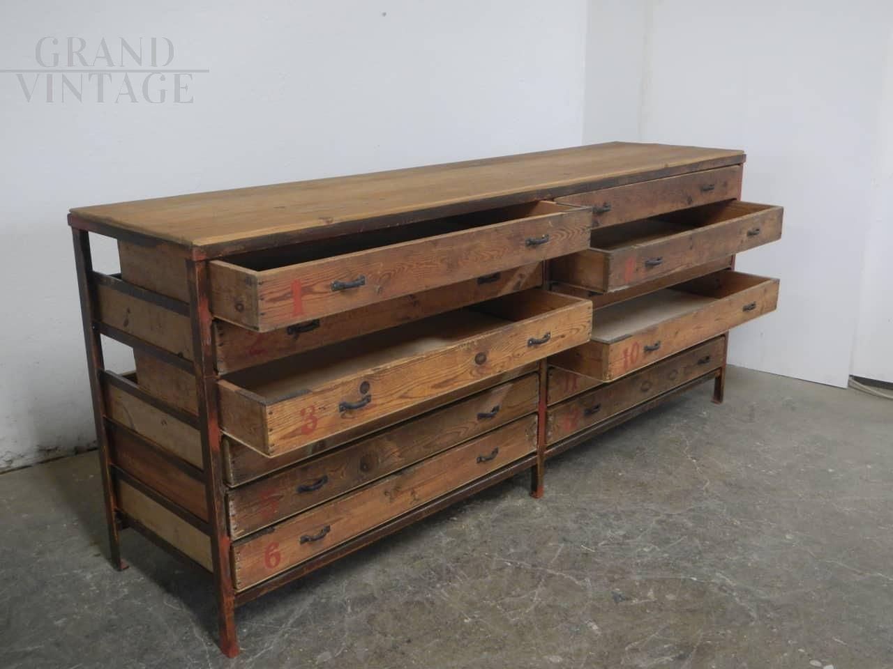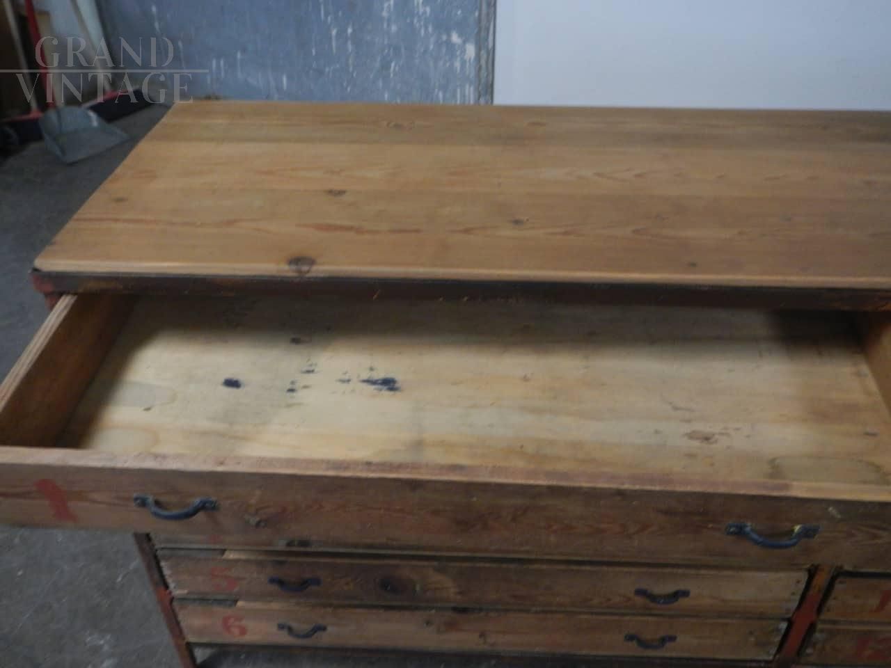Grande bancone industriale con 12 cassetti numerati, 1960