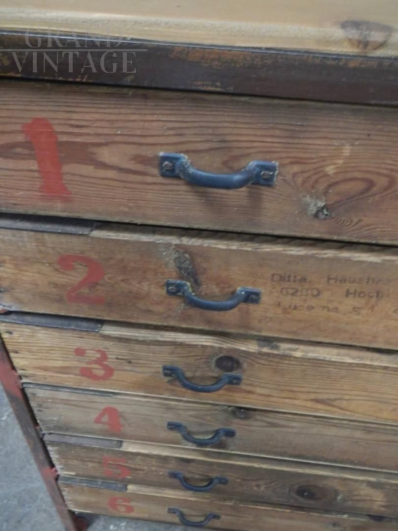 Grande bancone industriale con struttura in ferro e cassettiera con 12 cassetti in legno di abete numerati in colore rosso, i cassetti misurano internamente cm 90 x 47 x h9. Restaurata e rifinita con cera da legno.
