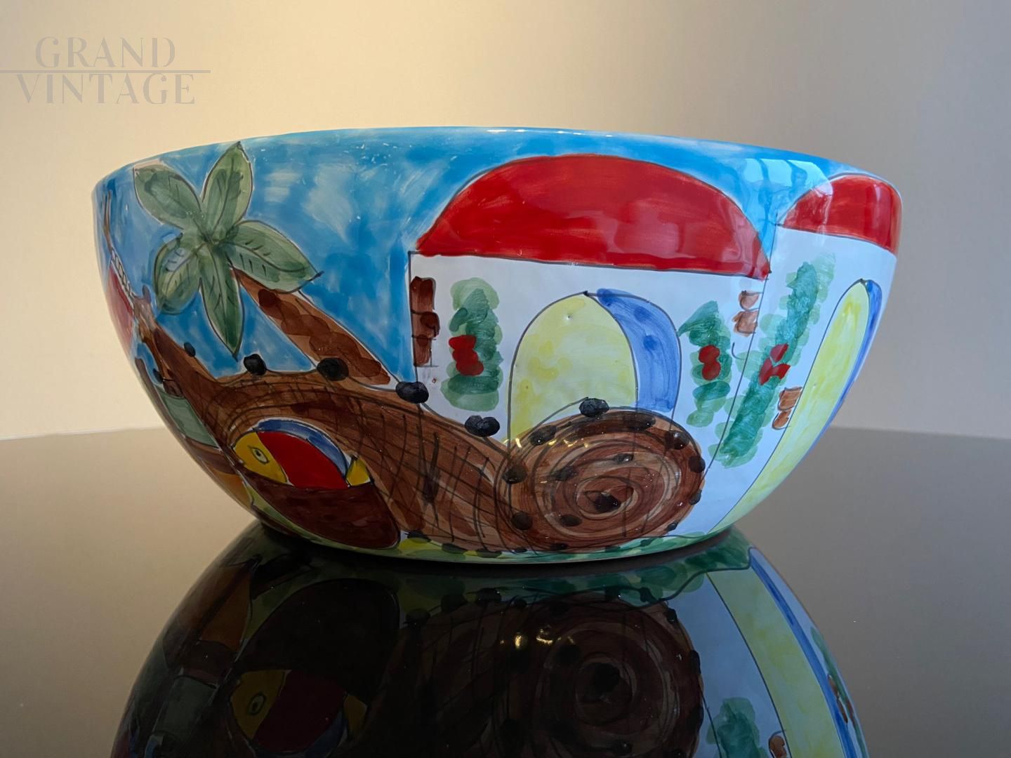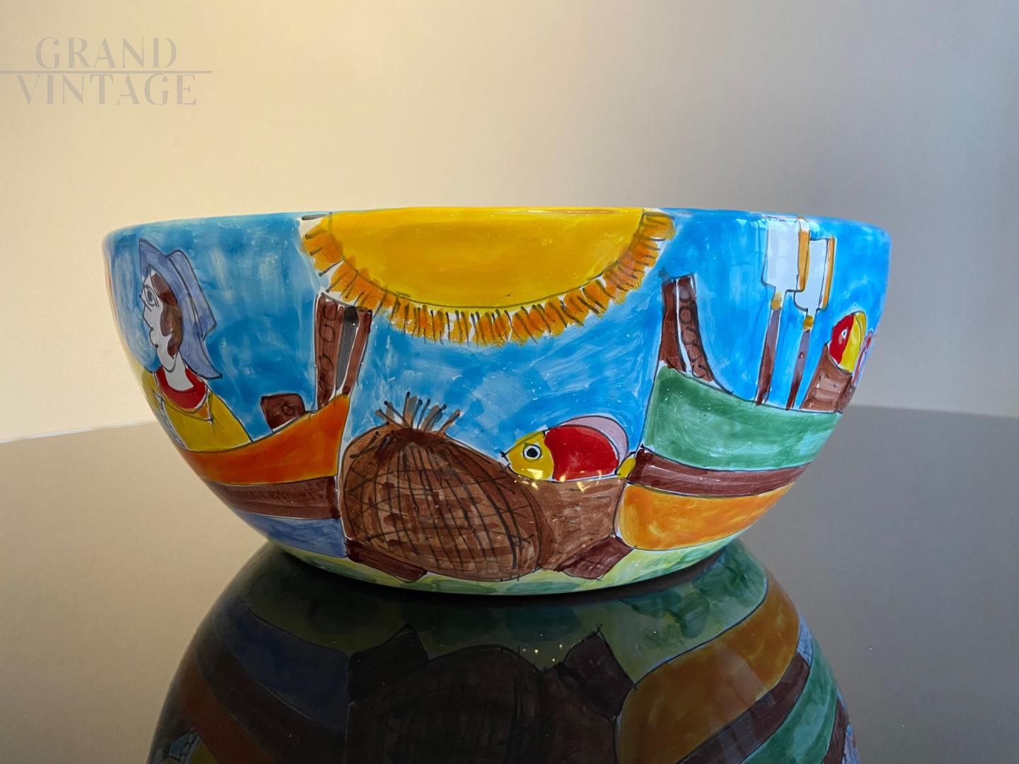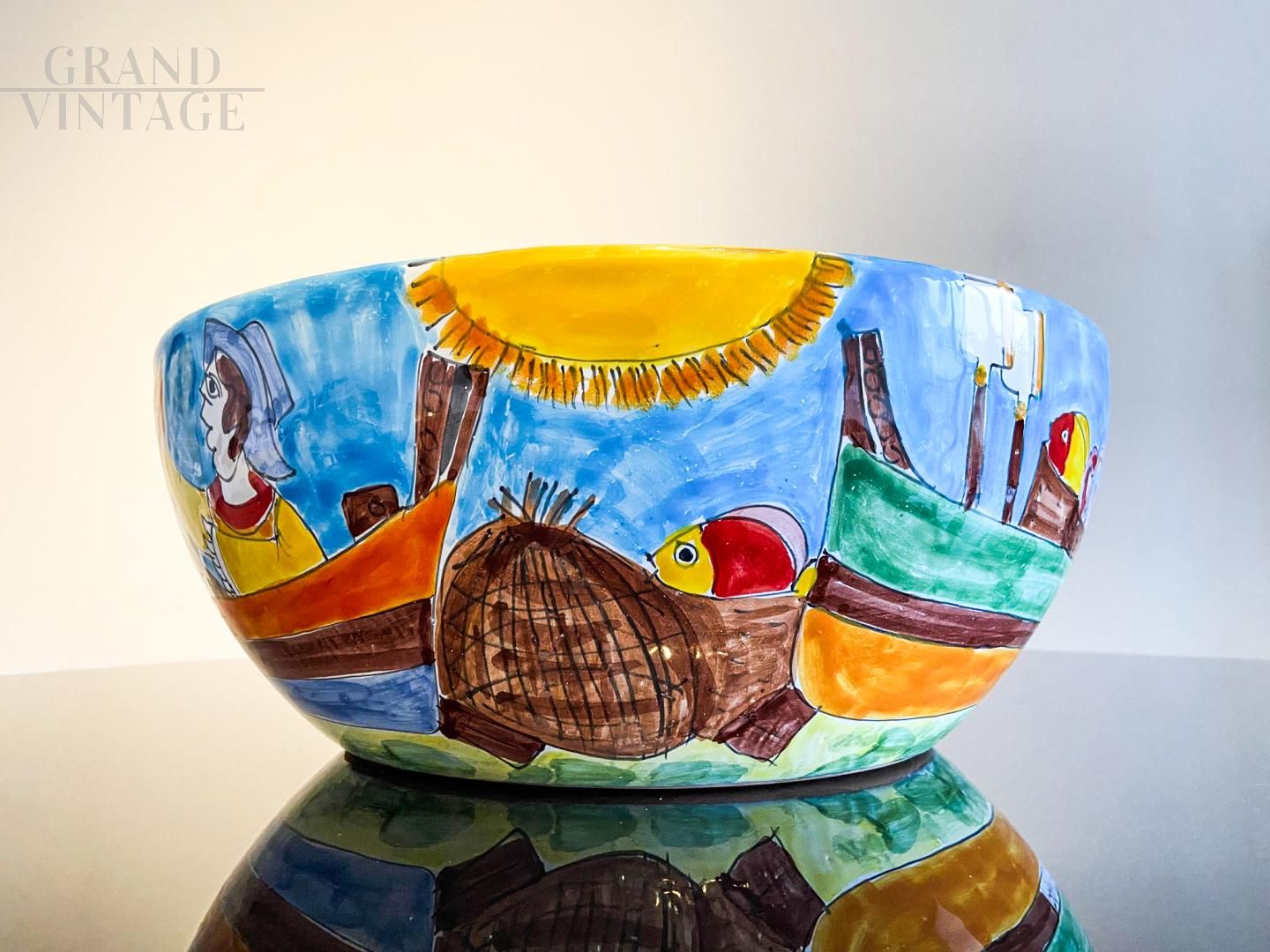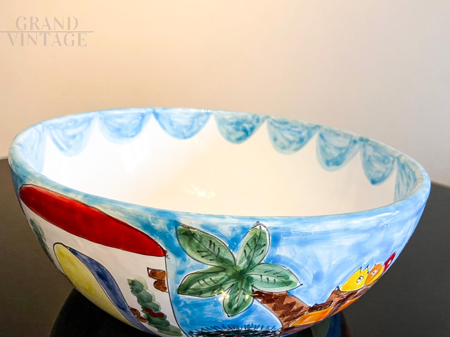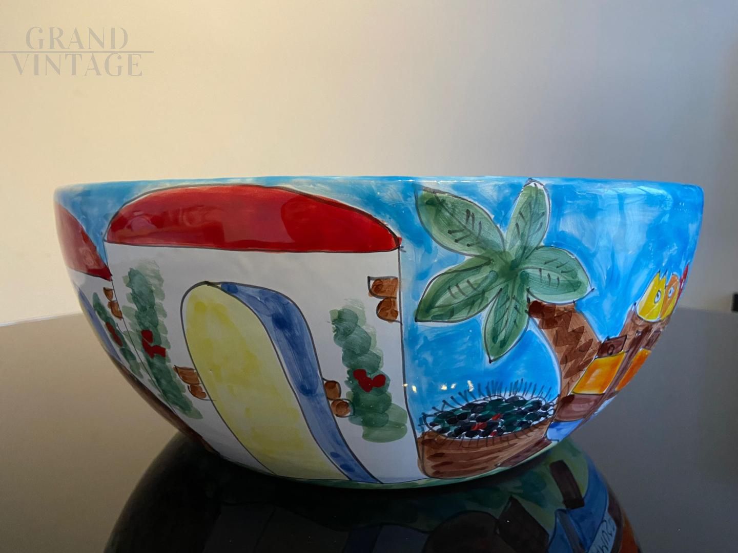 Grande ciotola in ceramica di Pantelleria dipinta a mano con colori vivaci e soggetti tipici del Mediterraneo, molto capiente e di grande effetto scenografico, firmata Made in Italy, in ottimo stato di conservazione.
