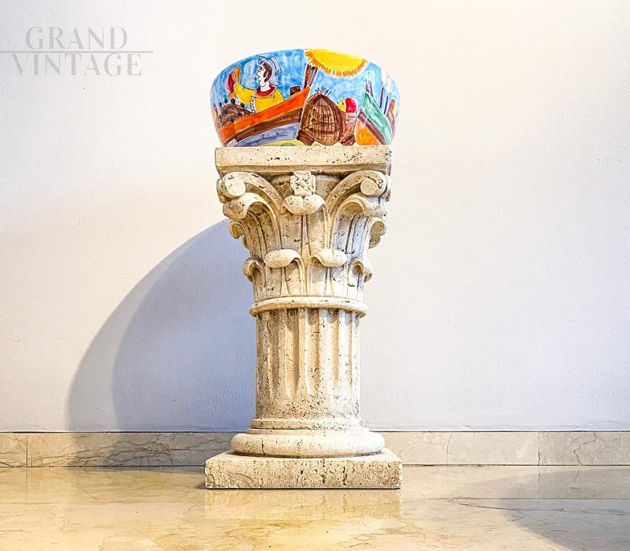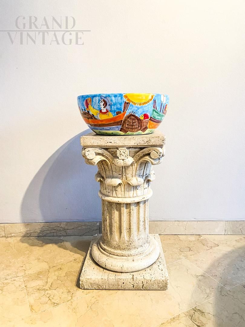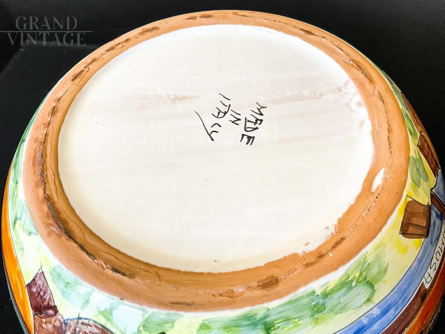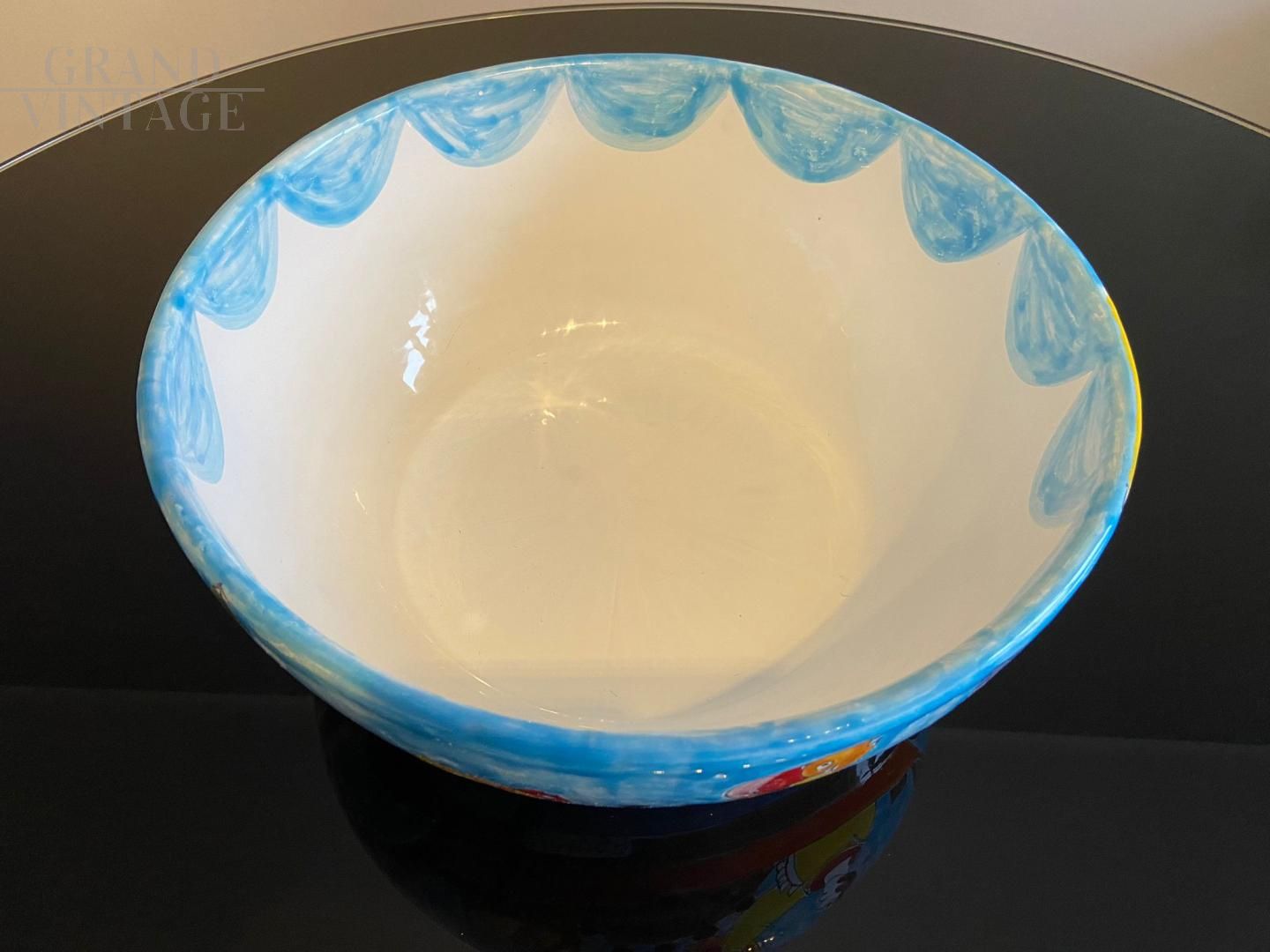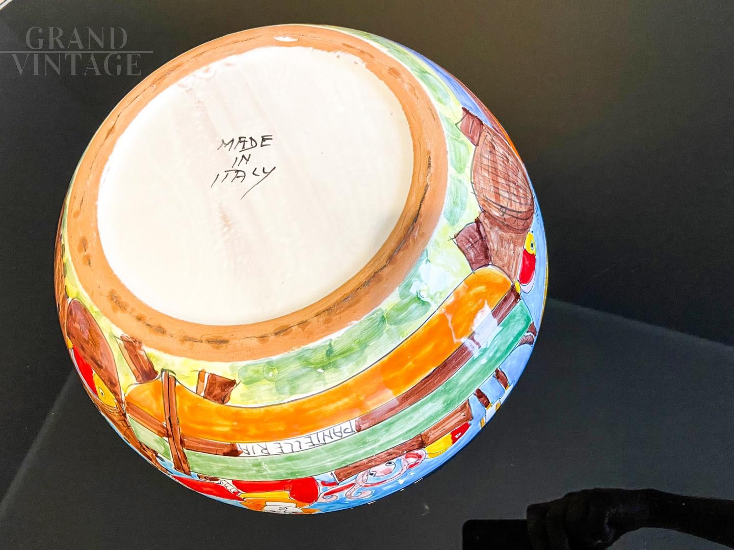 Grande ciotola in ceramica di Pantelleria dipinta a mano con colori vivaci e soggetti tipici del Mediterraneo, molto capiente e di grande effetto scenografico, firmata Made in Italy, in ottimo stato di conservazione.