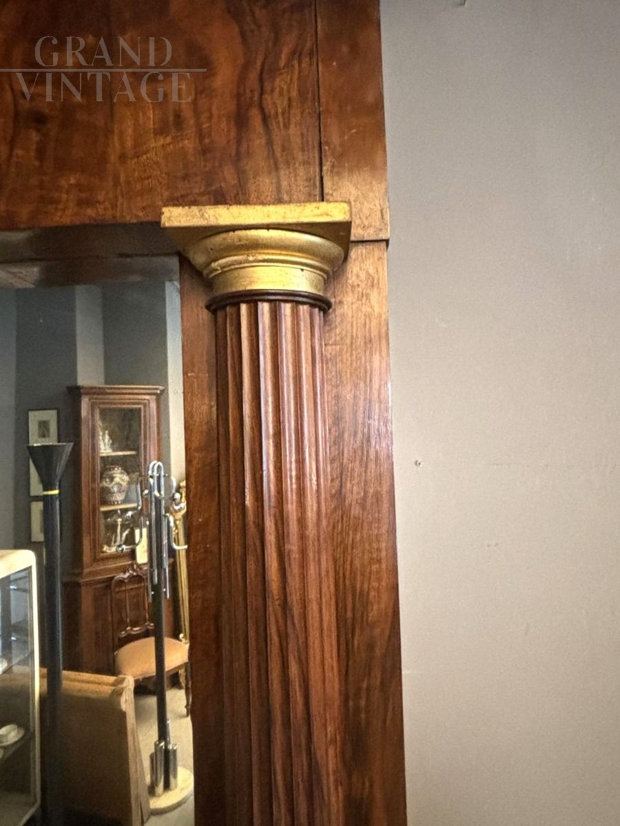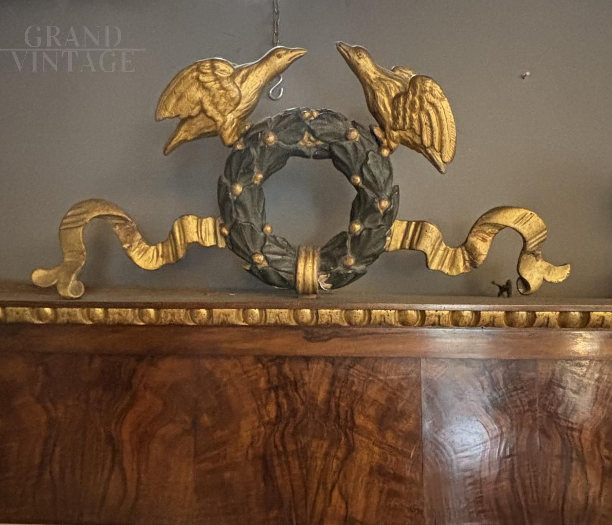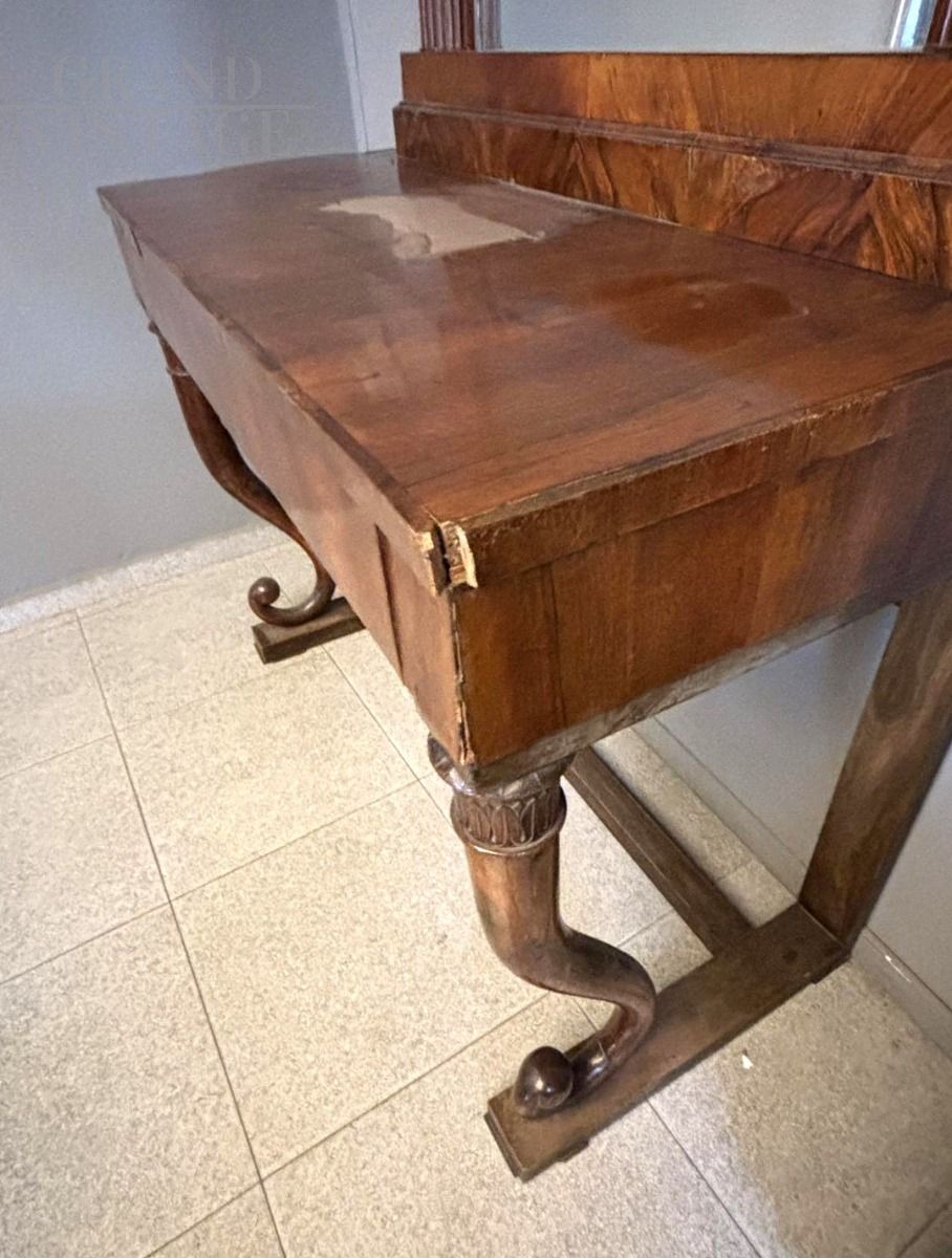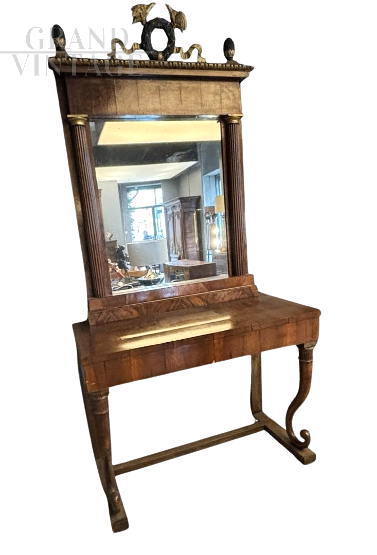 Consolle antica di epoca Impero Lucchese dell'800, con grande specchiera sul piano e cimasa con decorazioni dorate. Mobile bellissimo, necessita di qualche restauro e di ripresa della lucidatura.