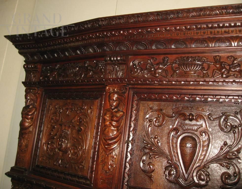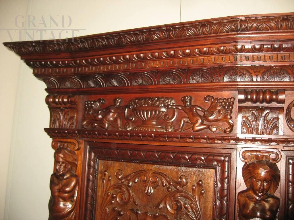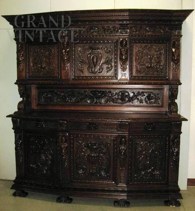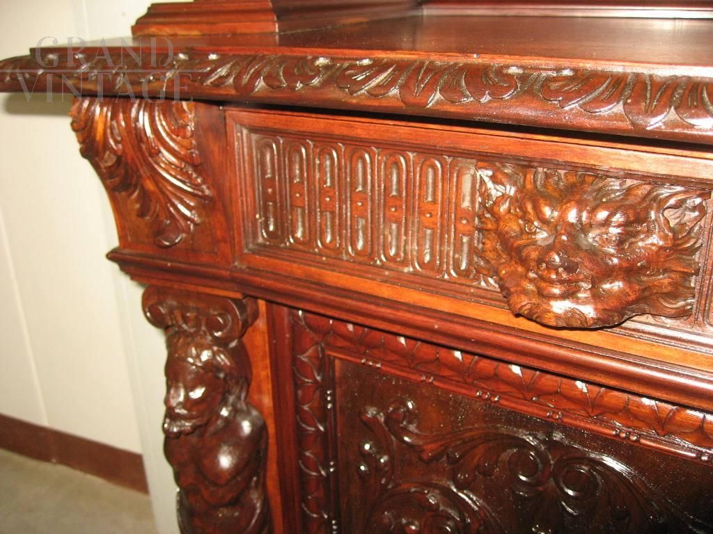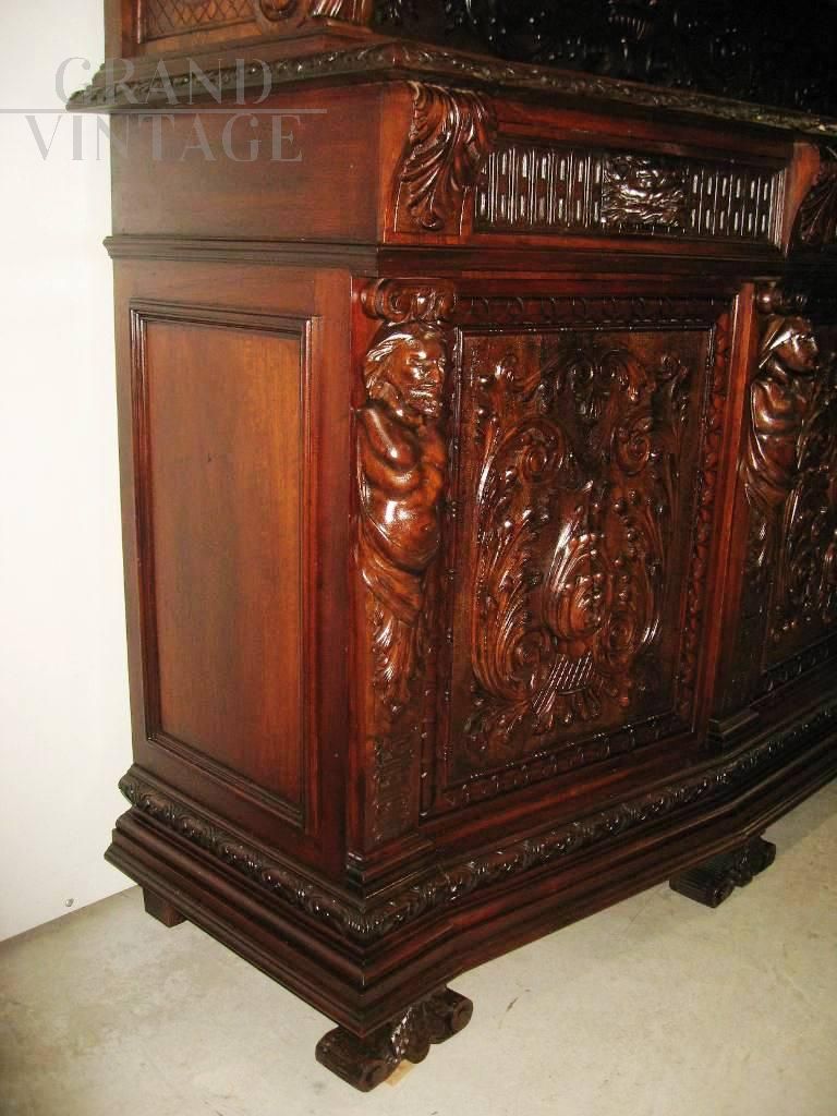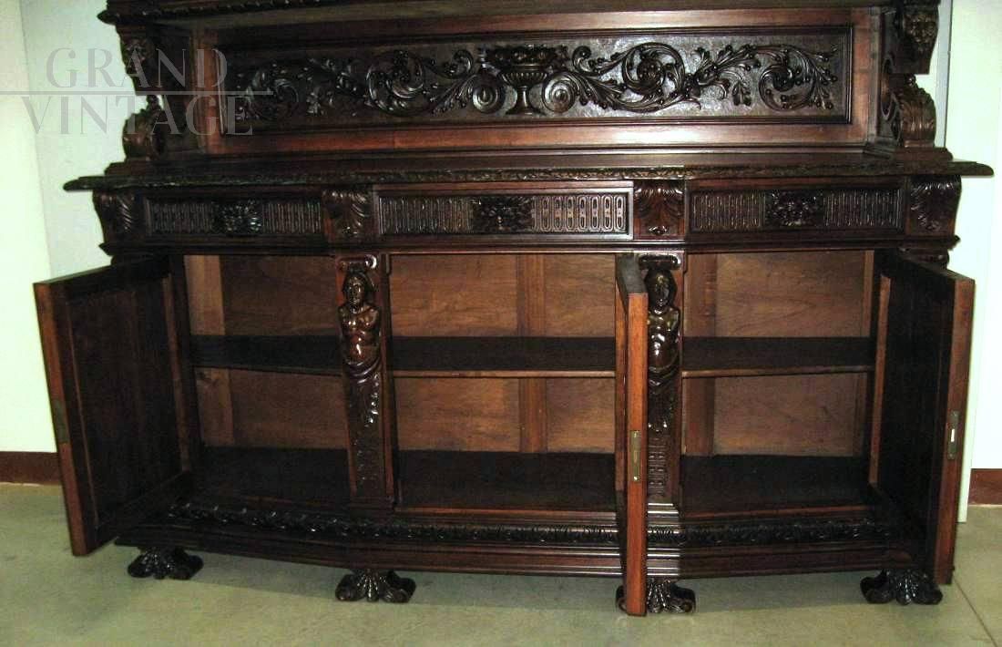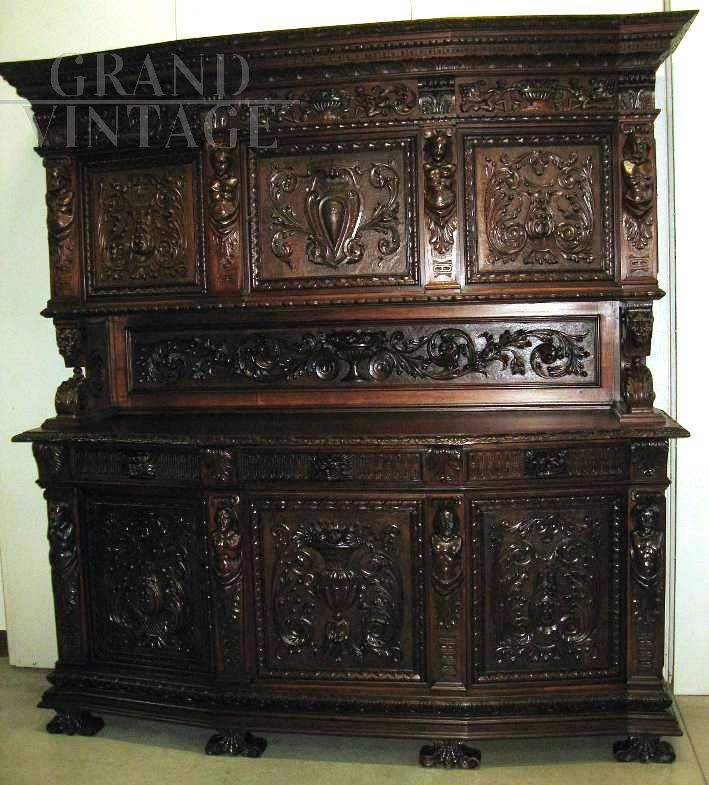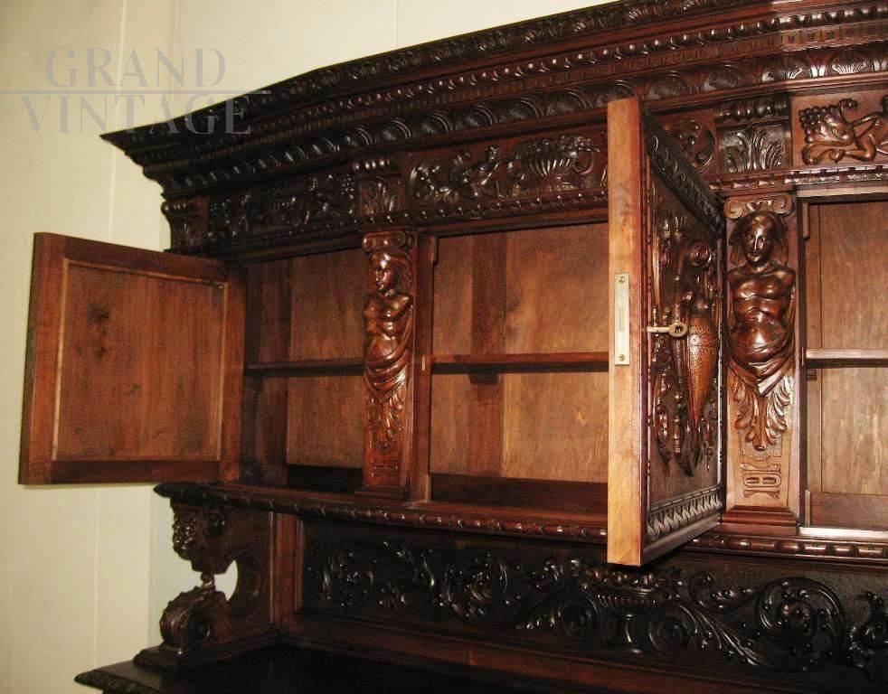 Credenza in stile antico rinascimentale finemente intagliata, con alzata, costruita agli inizi del ‘900. Legno di noce, parti a massello, parti impiallacciate, fondi e schiene in compensato. Grande buffet, di ottima ebanisteria, cariatidi in rilievo scolpite e raffinati intagli, maestoso cornicione. Mobile composto da tre pezzi: