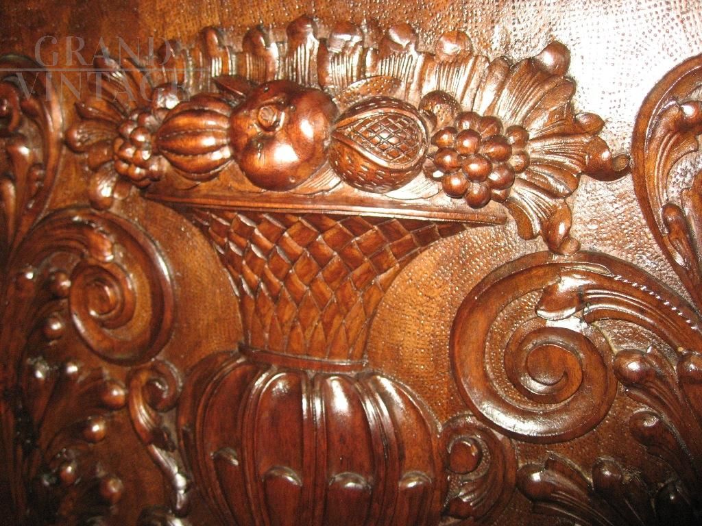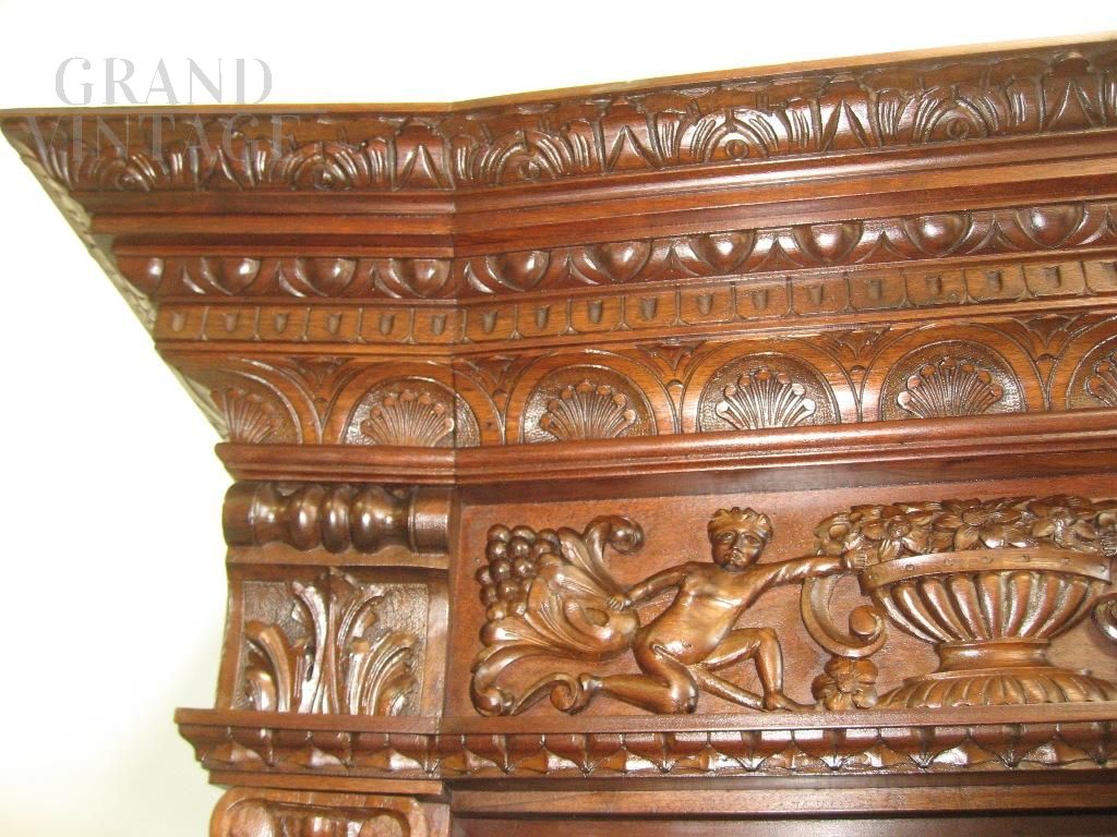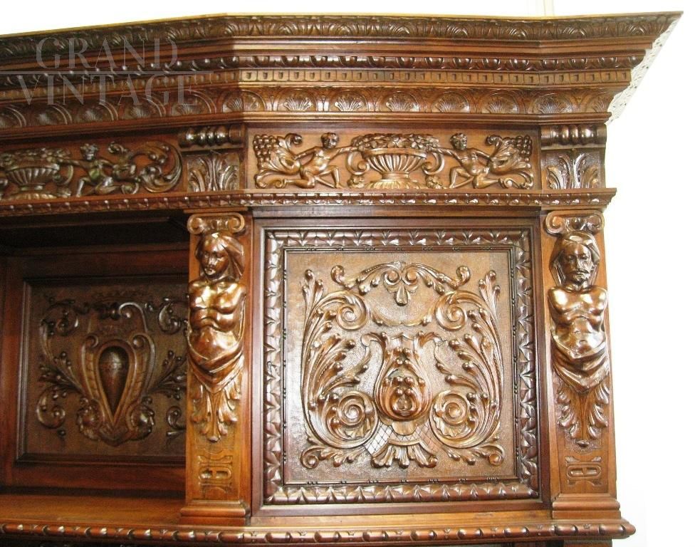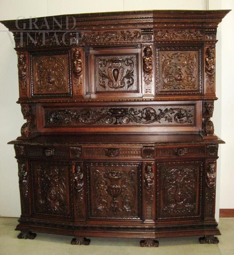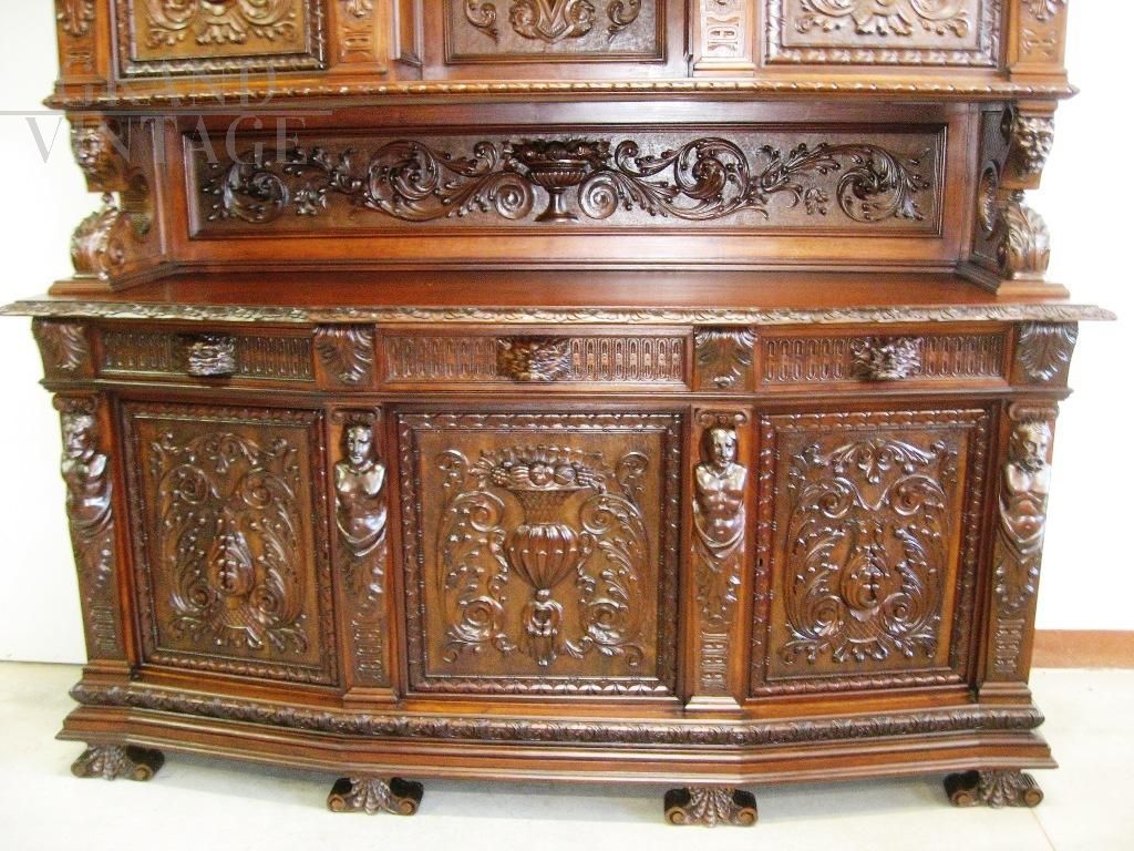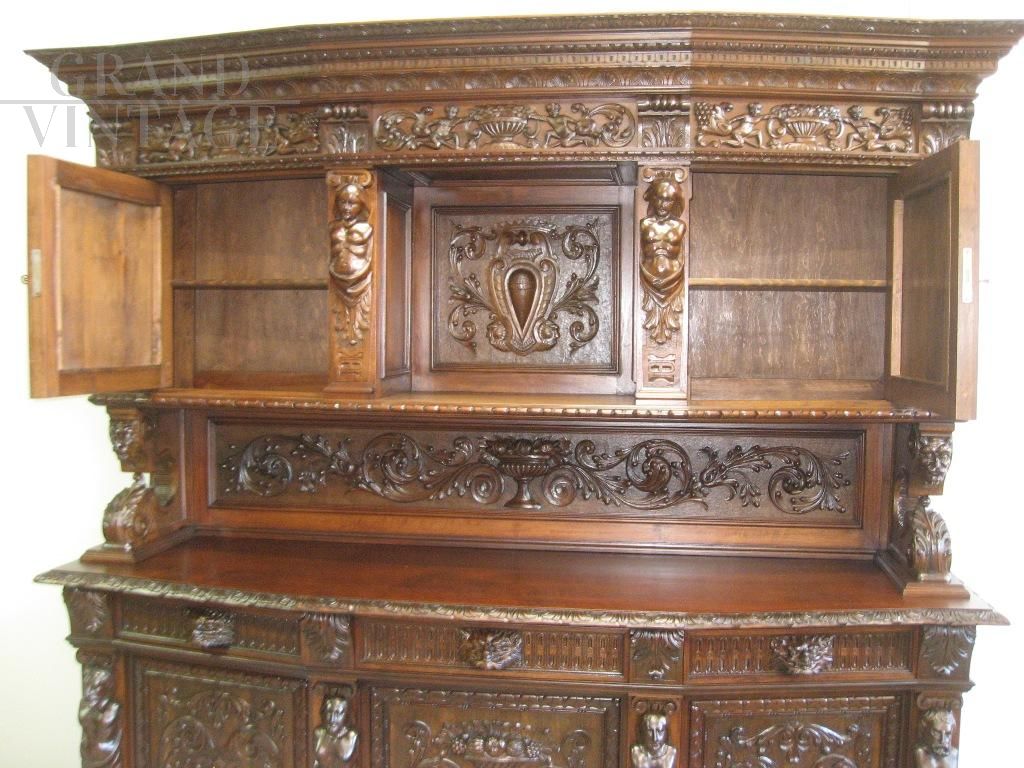Maestosa credenza a due corpi in stile antico del '600, realizzata nei primi del ’900. Credenza antica con alzata in stile rinascimentale in legno di noce con parti a massello e parti impiallacciate, fondi e schiene in compensato. Grande piano buffet di ottima ebanisteria. Cariatidi in rilievo scolpite, raffinati intagli e maestoso cornicione.