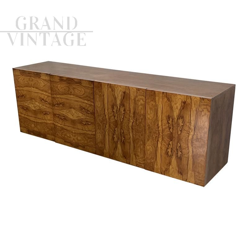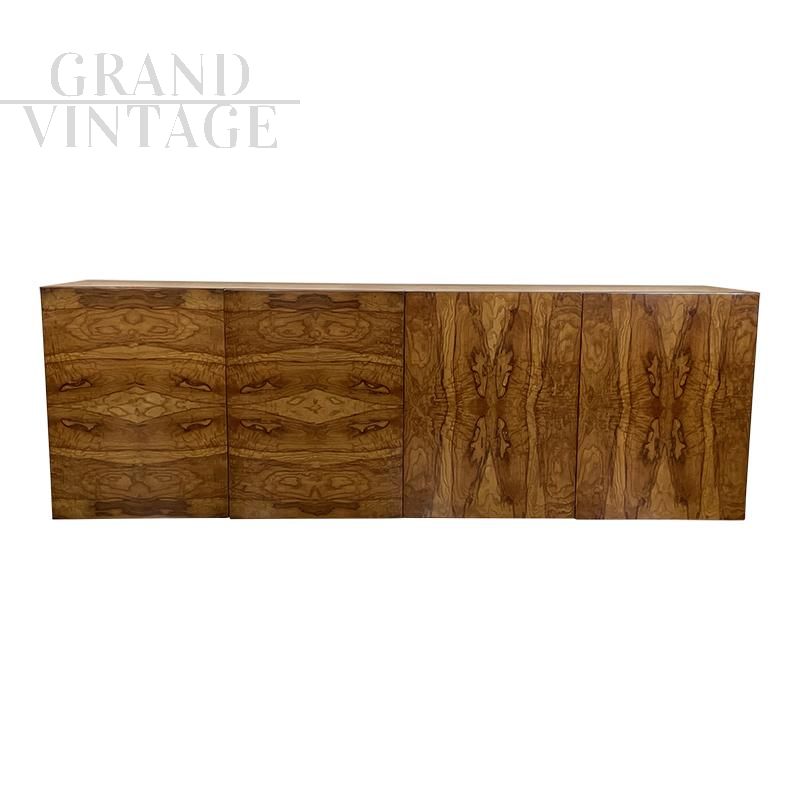Grande credenza in stile art déco in radica con 4 ante push pull, due vani interni dotati ciascuno di 5 cassetti.
