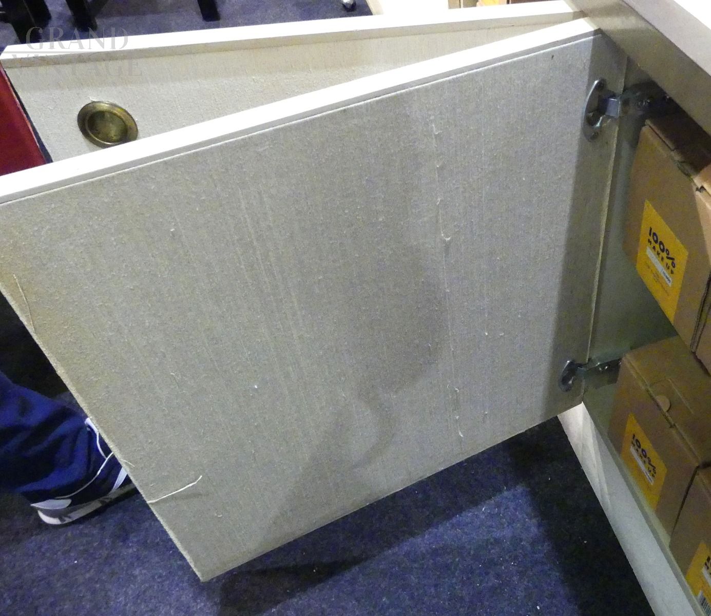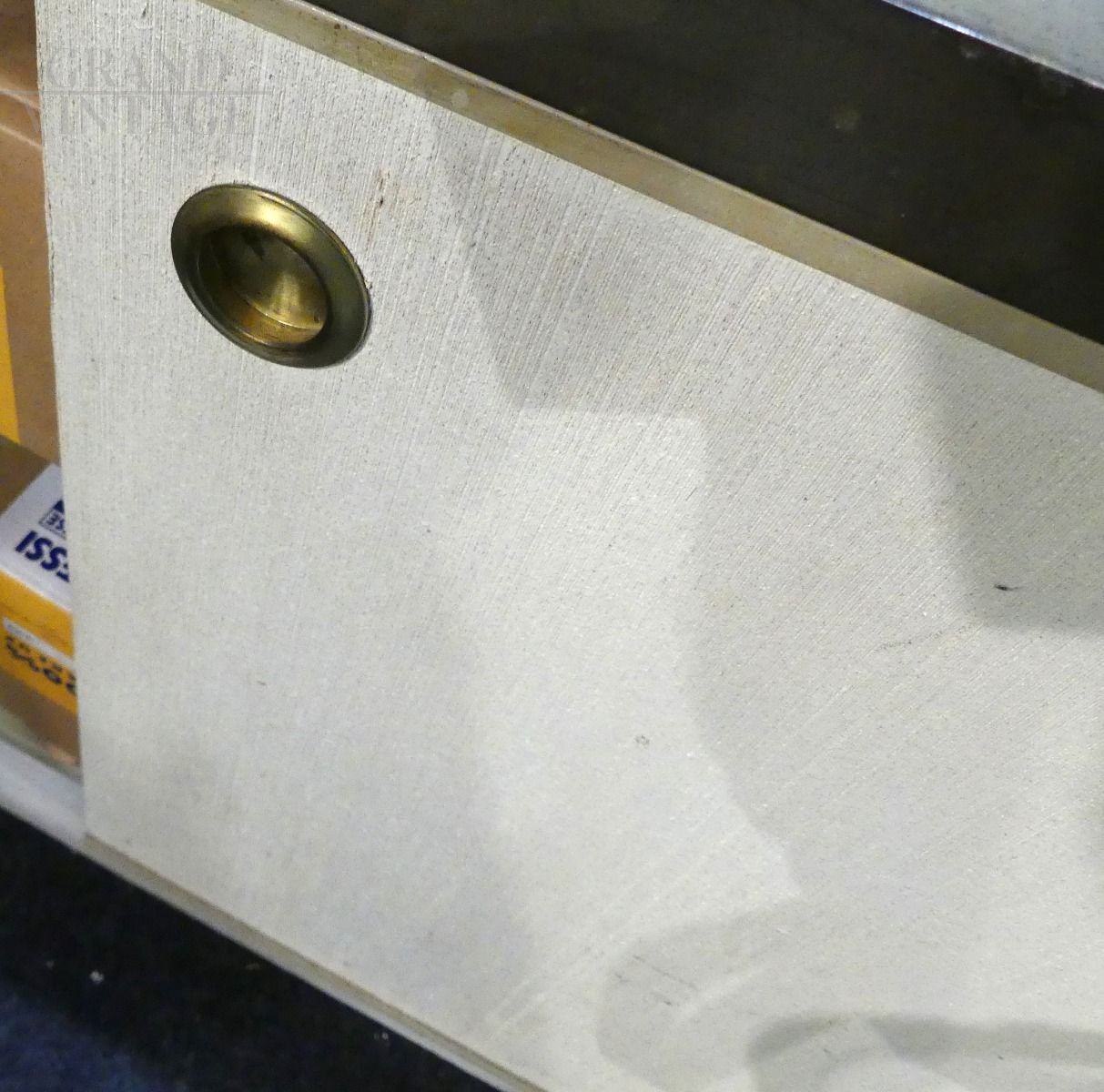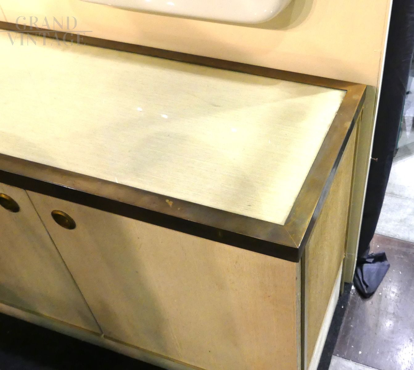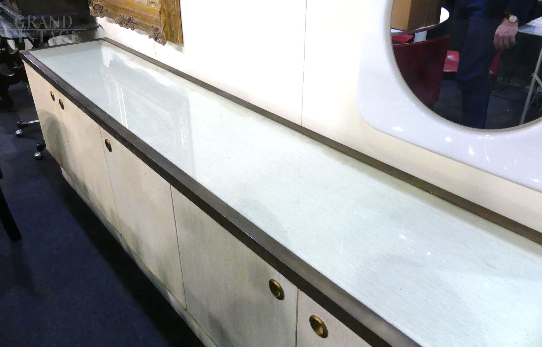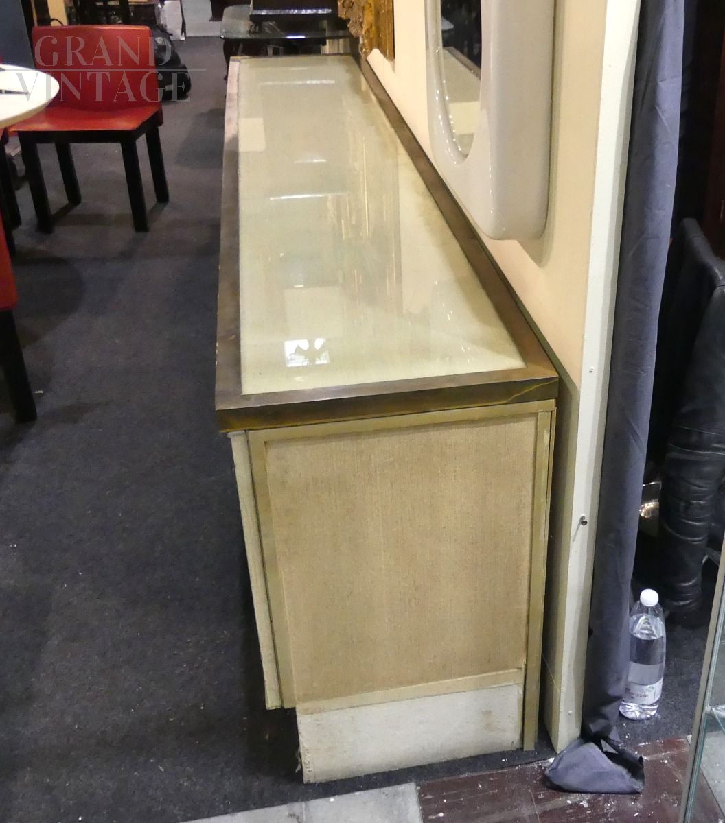 Grande credenza vintage in stile Liwans rivestita in tessuto, con piano in vetro e con profili e maniglie in ottone. Il piano del mobile sotto il vetro è anch'esso in stoffa.