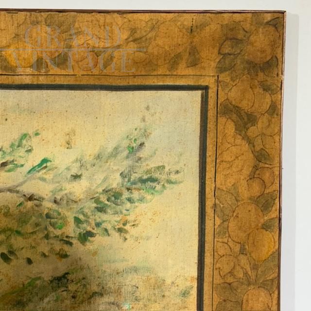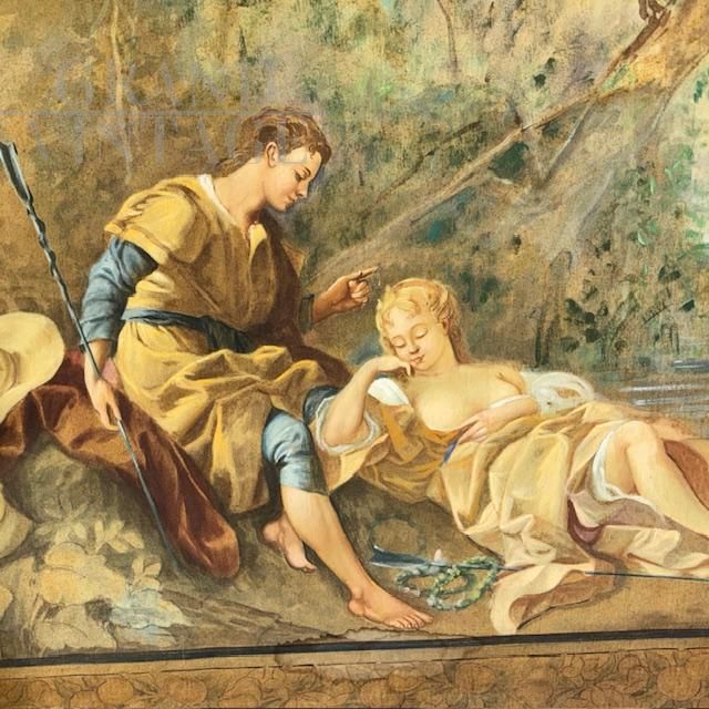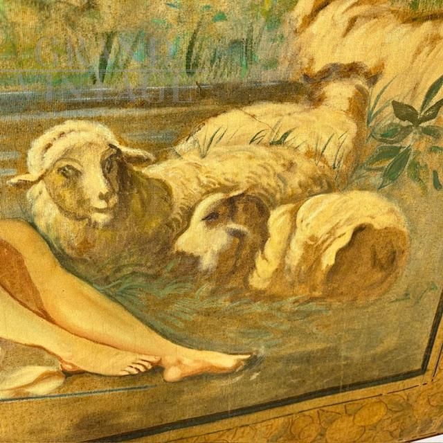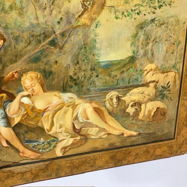 Antico grande dipinto a succo d'erba del XIX secolo su tela raffigurante scena galante con gregge, bellissima la qualità e buono lo stato di conservazione, con piccoli naturali segni del tempo.