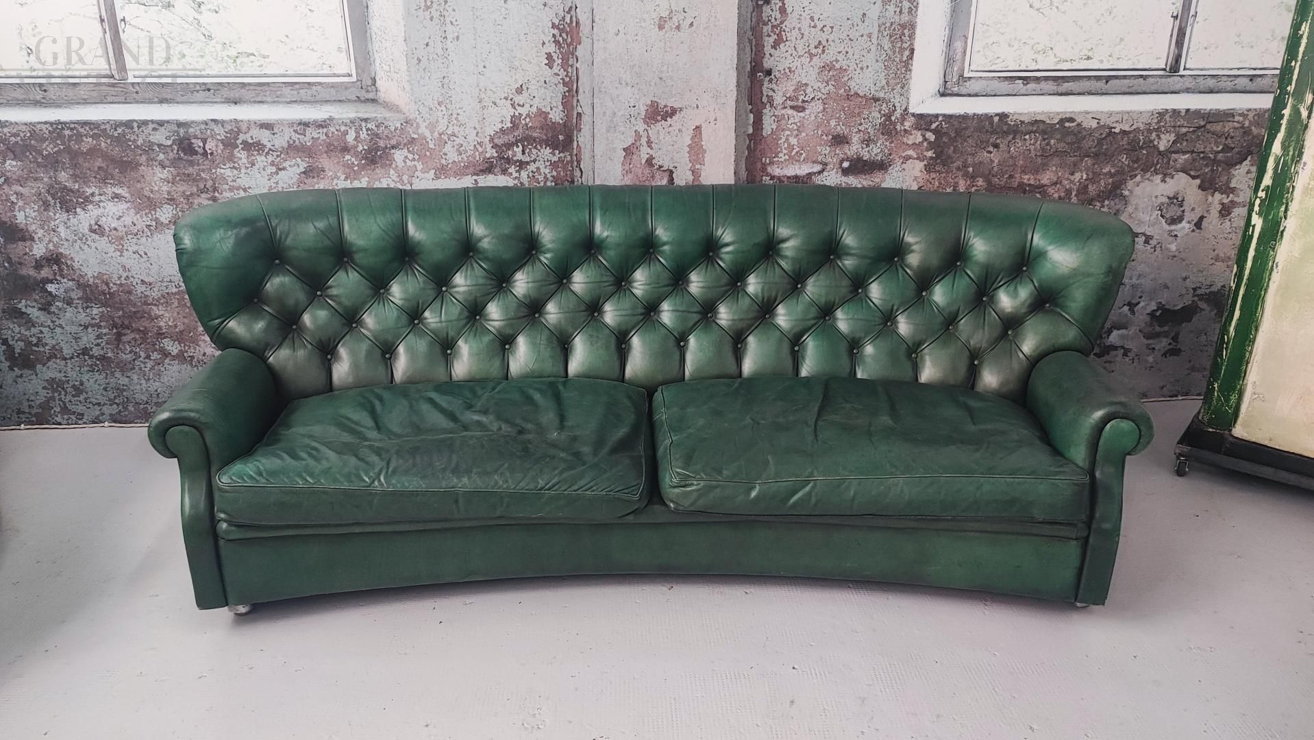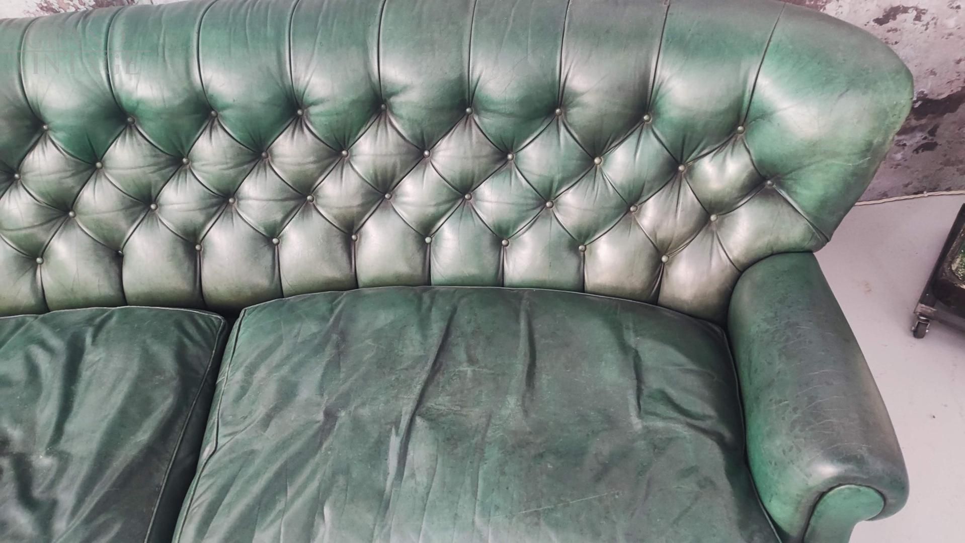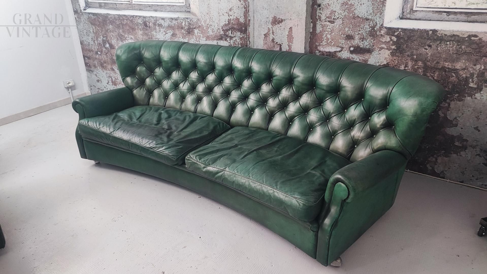 Grande divano Chesterfield in vera pelle verde degli anni '70, é in buone condizioni pur presentando i naturali segni del tempo. Perfetto anche per un ambiente in stile industriale!
