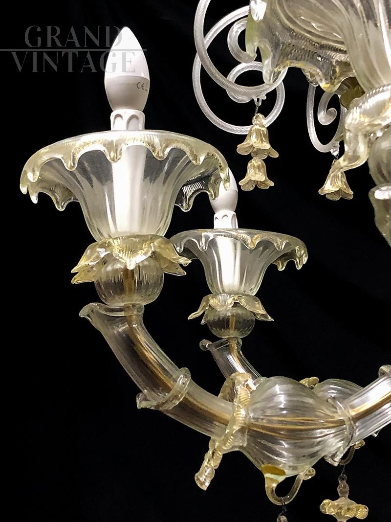 Grande e sontuoso lampadario in vetro di Murano trasparente e oro