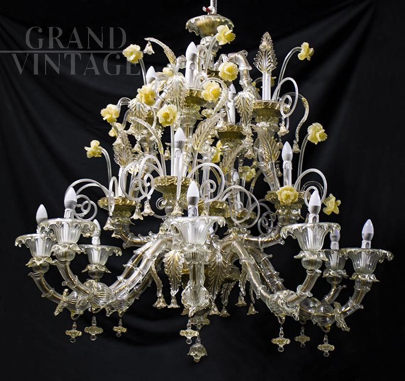Grande e sontuoso lampadario in vetro di Murano con architettura a triplo palco configurata con 16 luci, telaio metallico rivestito in vetro con finiture e dettagli in oro e bianco. Allestimento con elementi floreali e roselline di colore giallo. Impianto luci perfettamente funzionante.