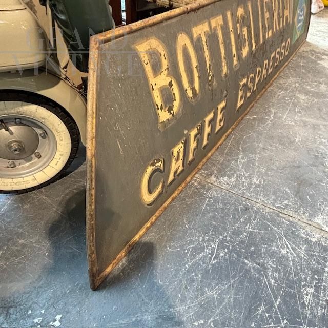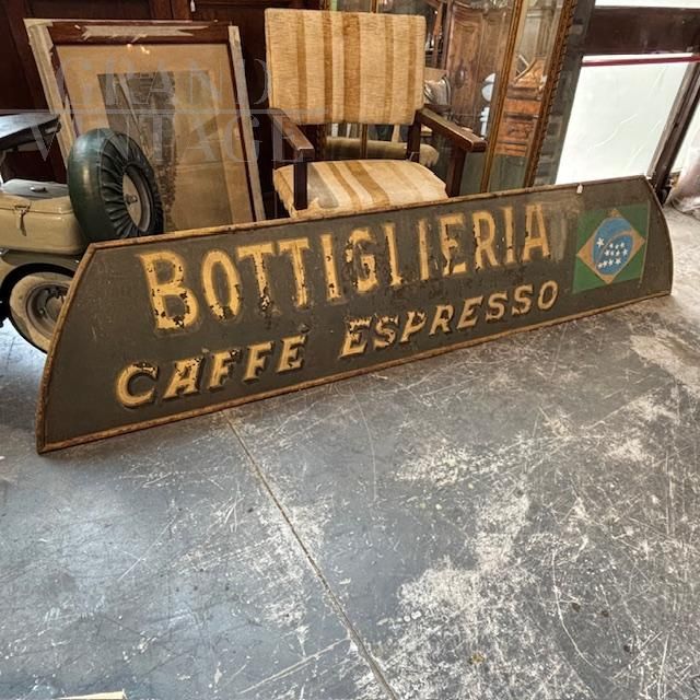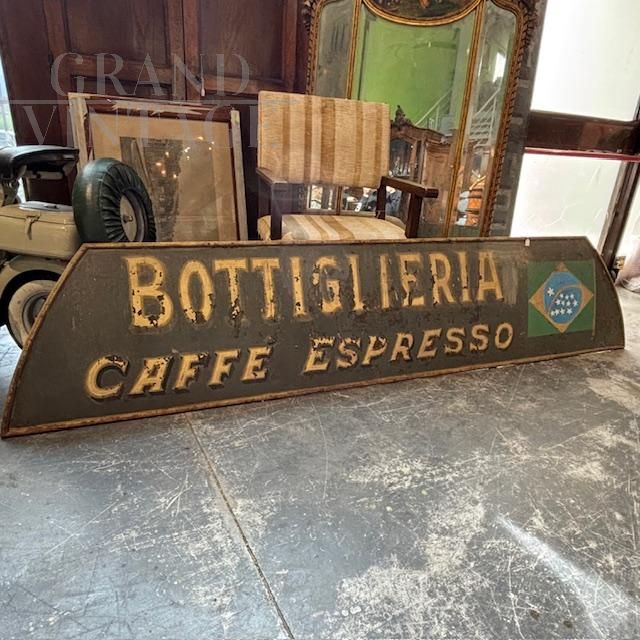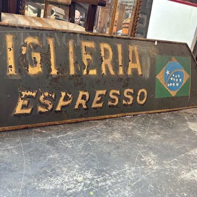 Grande insegna antica in ferro dipinta a mano con scritta Bottiglieria - Caffè Espresso, con la bandiera del Brasile, molto rara, realizzata alla fine dell'800, presenta i naturali segni del tempo.