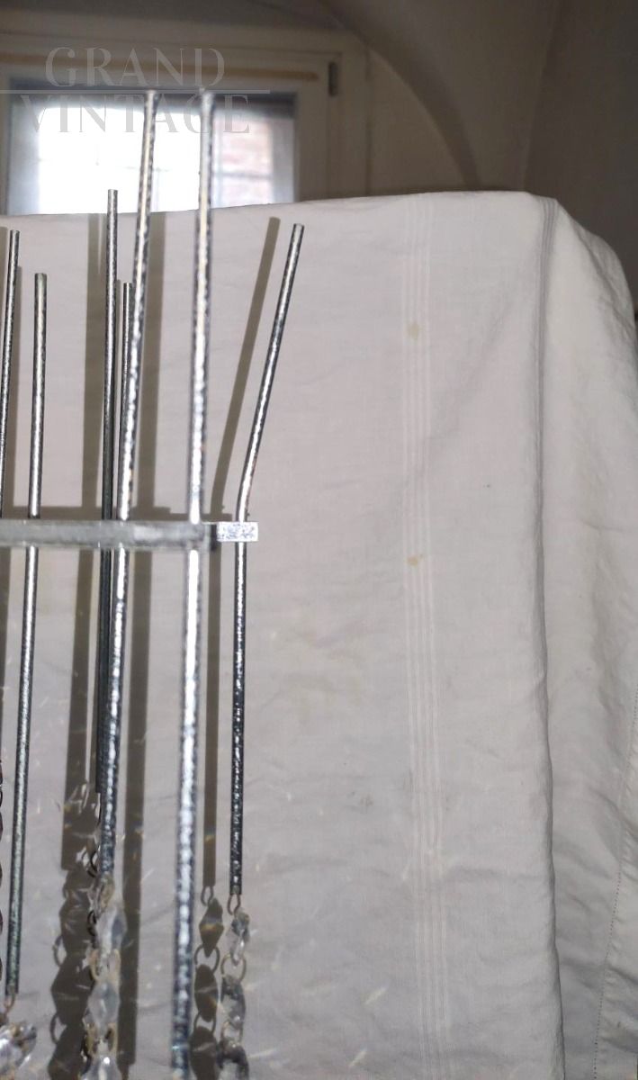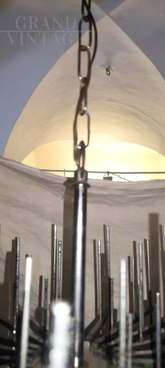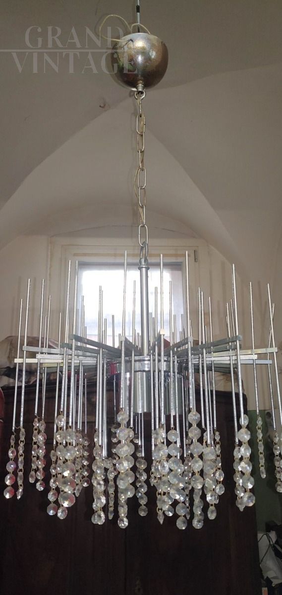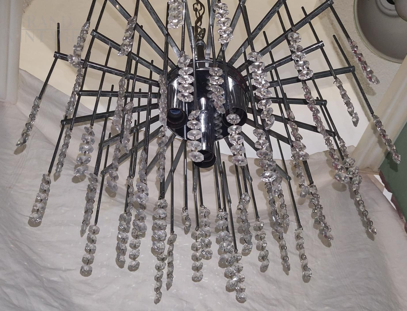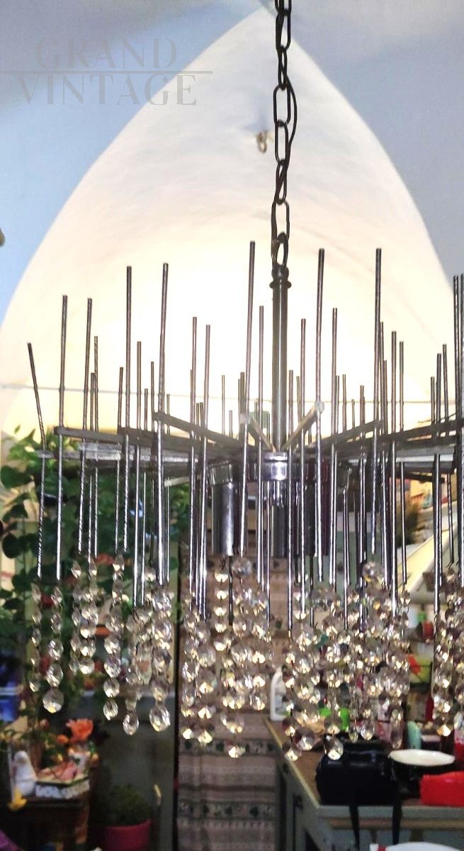 Grande lampadario design di Gaetano Sciolari, modernariato Italiano stile space age, in acciaio cromato con gocce di cristallo. In buone condizioni, con i naturali segni del tempo sulle cromaturee, un'asticella è piegata come in foto.