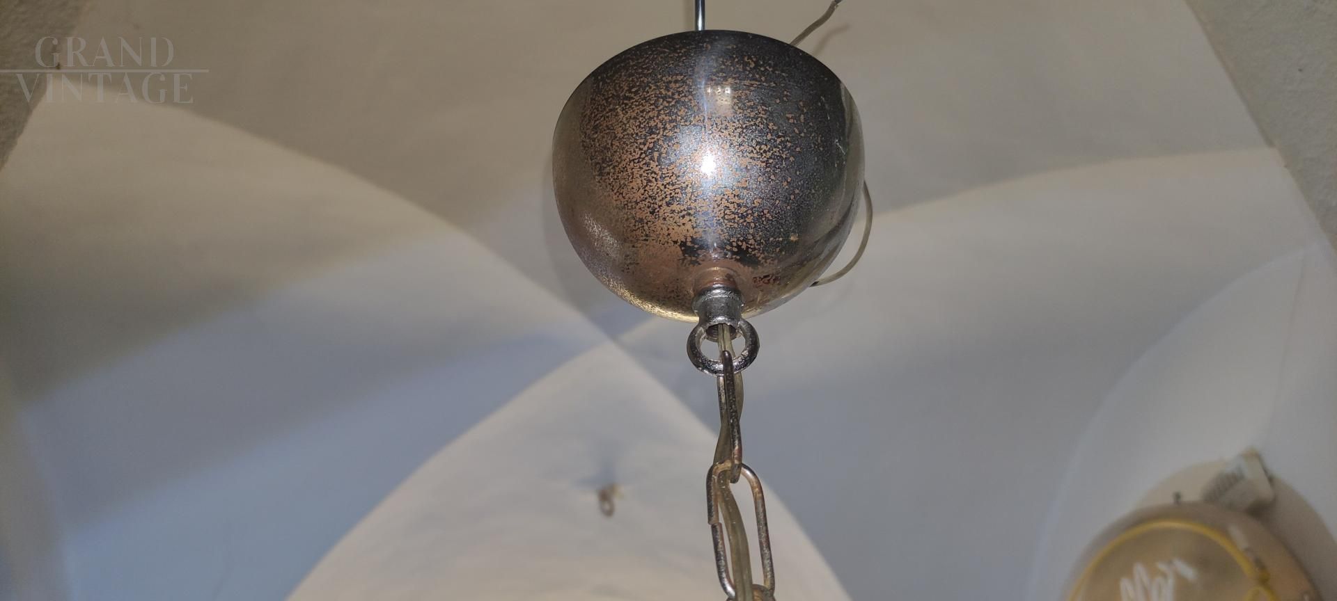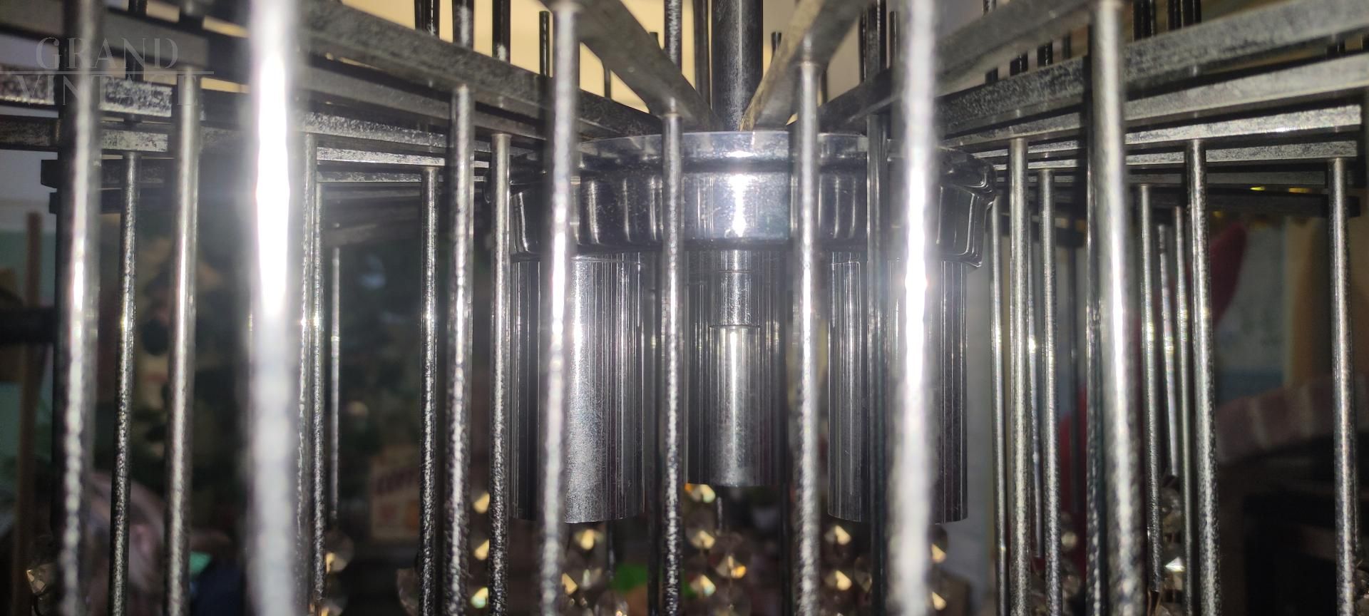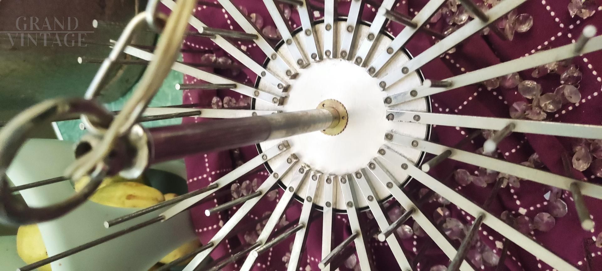 Grande lampadario design di Gaetano Sciolari, modernariato Italiano stile space age, in acciaio cromato con gocce di cristallo. In buone condizioni, con i naturali segni del tempo sulle cromaturee, un'asticella è piegata come in foto.