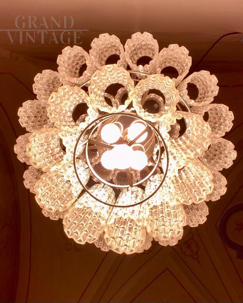 Grande lampadario vintage con tubi in vetro di Murano lavorato a corteccia, disegnato da Toni Zuccheri e prodotto da Venini a Venezia negli anni Sessanta. Il lampadario è composto da 38 tubi in vetro di Murano e da una struttura in ferro a più livelli. Ricablato e restaurato, in ottime condizioni, con solo una piccola crepa su uno dei vetri, come da foto. Su richiesta, l'altezza dell'asta può essere regolata in base alle esigenze.