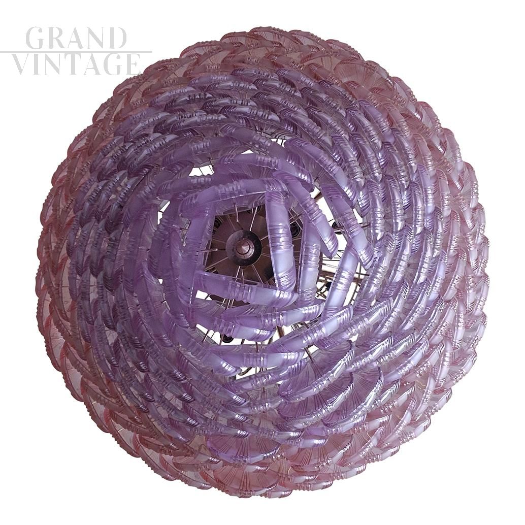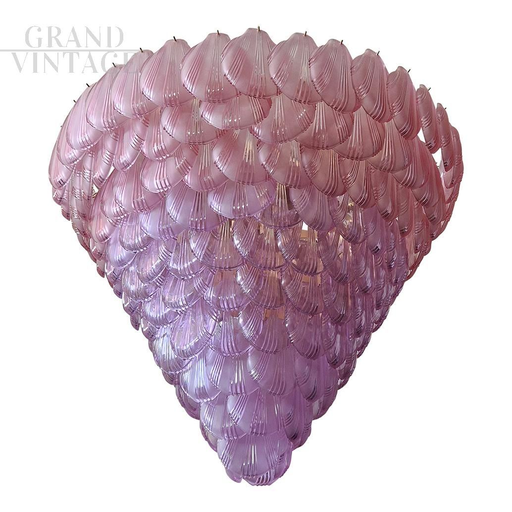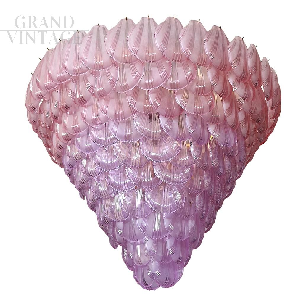 Splendido grande lampadario con conchiglie in vetro di Murano artistico color ambra sfumato lilla, Italia anni '50. La struttura in ottone regge 204 magnifiche conchiglie in vetro di Murano.