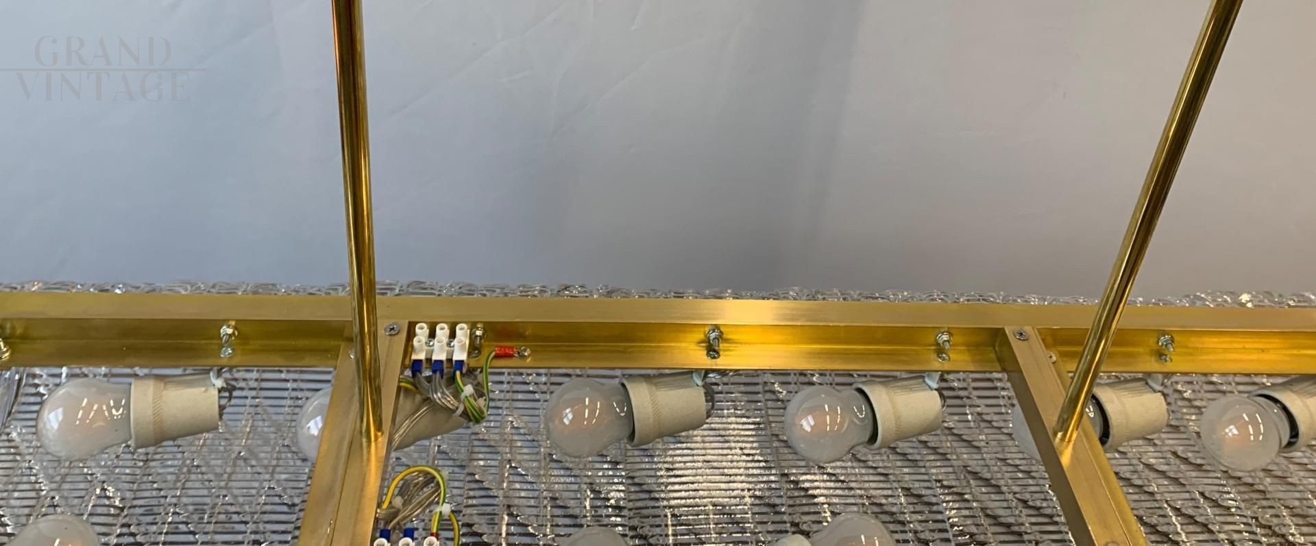 Fantastico e raro lampadario orizzontale in vetro di Murano finemente lavorato su struttura in ottone dorato, realizzato in tempi recenti rispettando gli standard alti di design e qualità dei materiali, può essere personalizzato nelle dimensioni, rendendolo più lungo o più corto. Il lampadario è tutto originale made in Italy, con vetri fantastici color cristallo trasparente fatti a Murano e struttura in ottone con coppette anni '50, ed è composto da diversi moduli in vetro. Si tratta di un pezzo raro e molto particolare e importante, questo modello ha 12 punti luce con attachi per lampadine in ceramica di tipo E27, su richiesta si può fare l'impianto elettrico anche per l'America. Struttura portante del lampadario in ottone e filetti in interni in ferro.