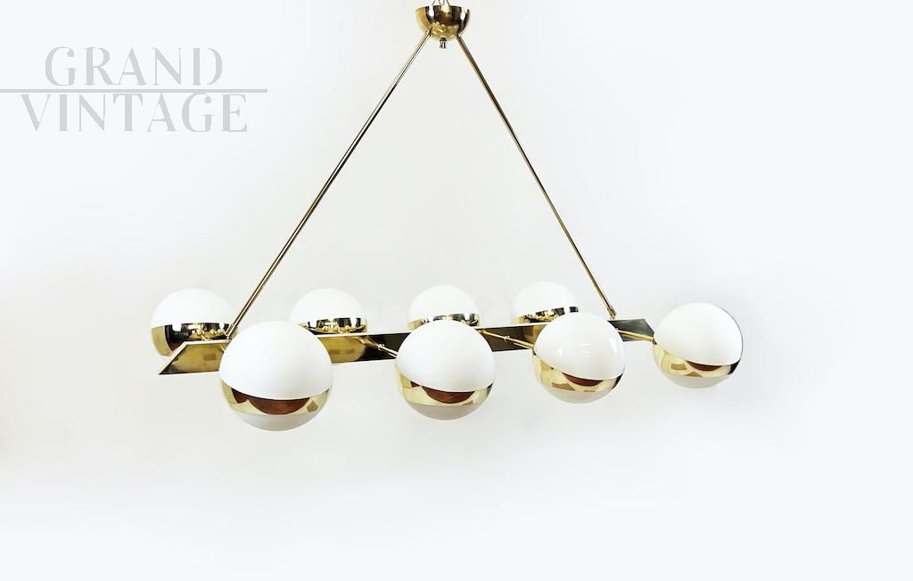Elegante lampadario orizzontale vintage luxury degli anni '70 con struttura in ottone e otto punti luce a sfera in vetro opalino bianco disposti simmetricamente, perfetto per illuminare un grande tavolo.