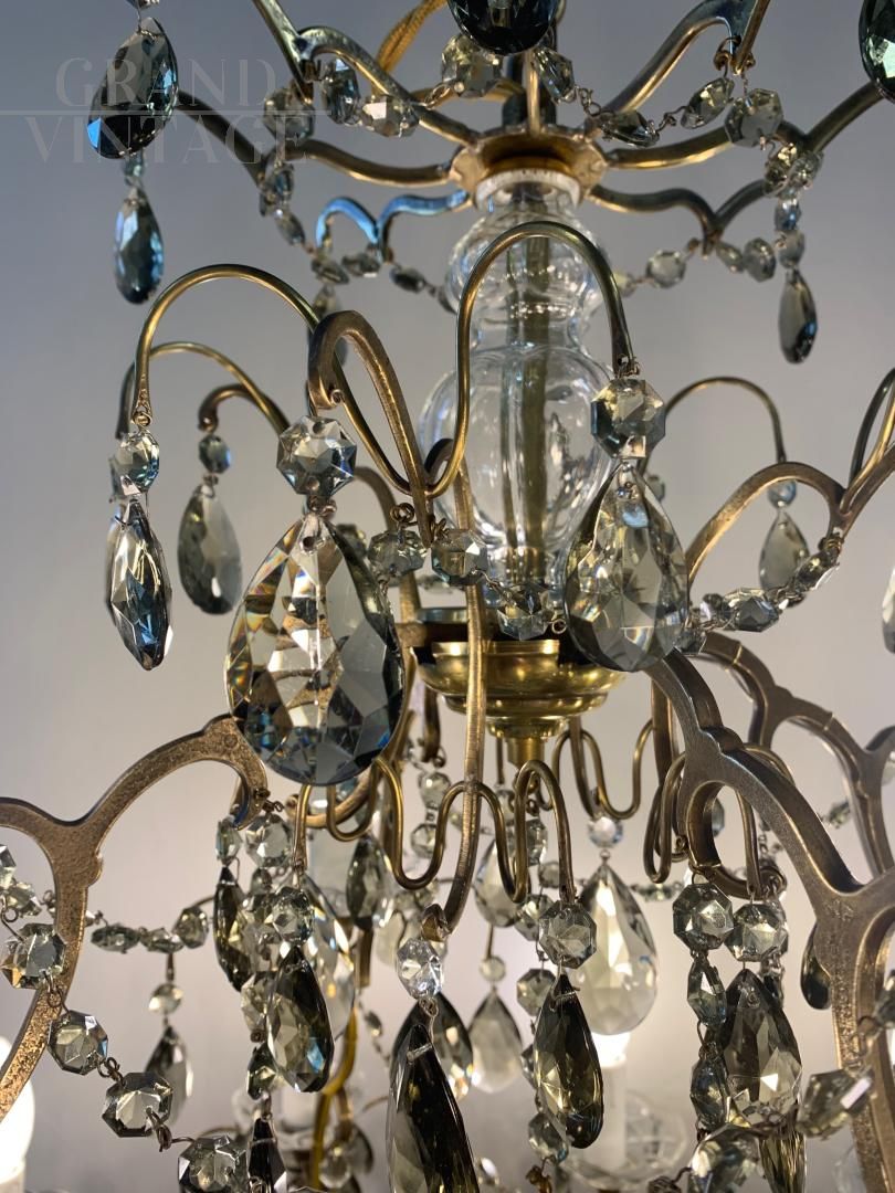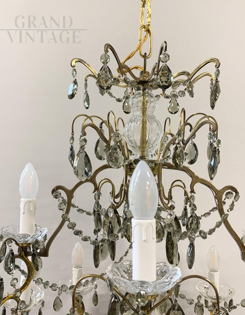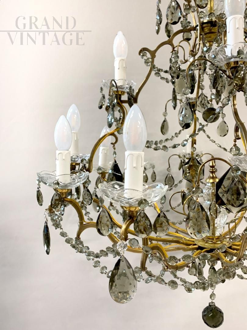 Bellissimo e maestoso lampadario classico con gocce in vetro fumé e 16 punti luce con piattini in vetro di Murano soffiato, su struttura in ottone. Particolare il colore delle gocce. Il lampadario è un fondo di magazzino, non è mai stato usato e quindi non ha molti segni del tempo. I piatti e parte della struttura sono di vetro trasparente di Murano. Si tratta di una versione moderna del classico lampadario con gocce di cristallo, ed è adatto ad arredamenti attuali. Completo di 16 attacchi per lampadine di tipo E14, impianto elettrico nuovo, si consigliano le lampadine al Led. Su richiesta si può montare un impianto elettrico adatto per l'America.