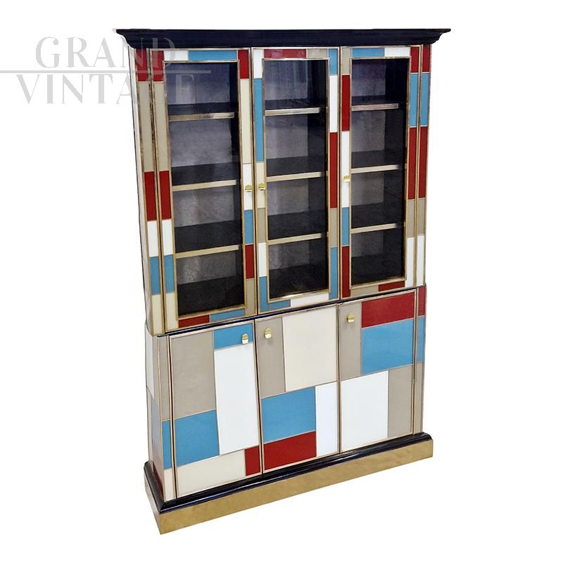 Grande libreria design con tre ante a vetrate, con tre ripiani in legno. Arricchita internamente da specchio illuminato. Interamente realizzata a mano, con struttura in legno rivestita in vetro colorato. Profili in ottone dorato. Base e cornicione in legno laccato nero. Nella parte inferiore tre ante colorate. La struttura si illumina con il telecomando.