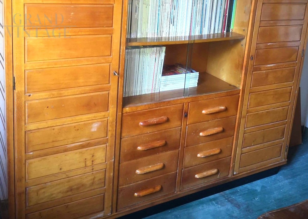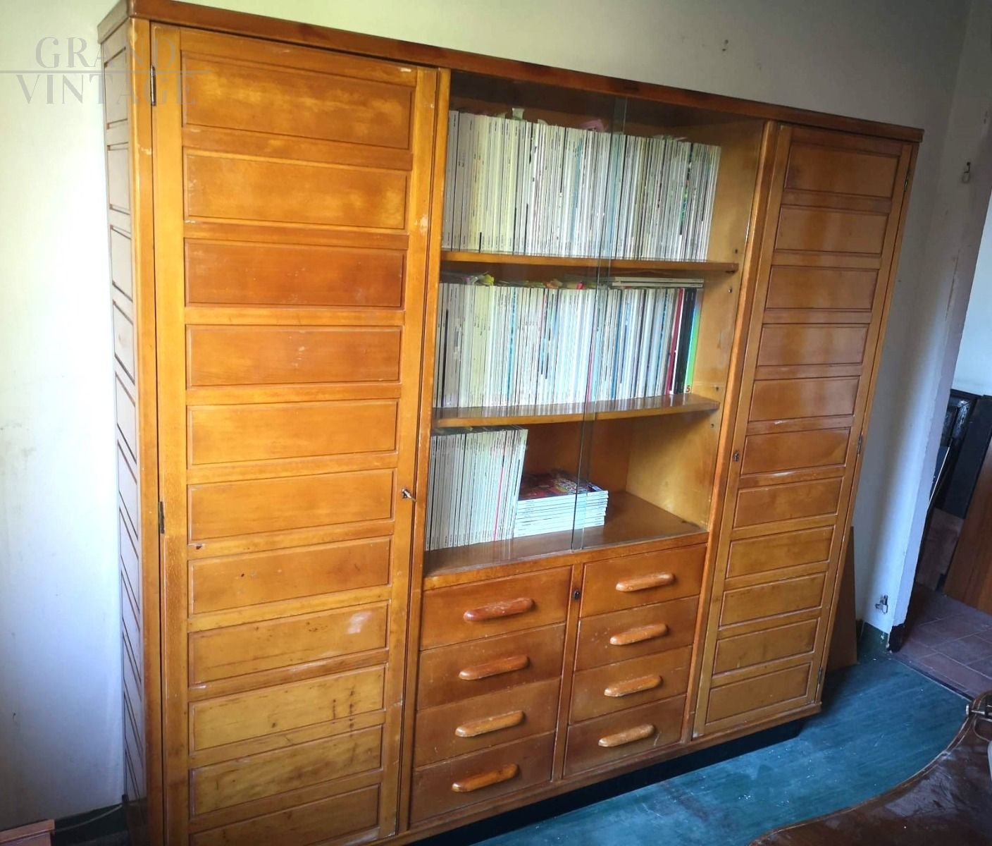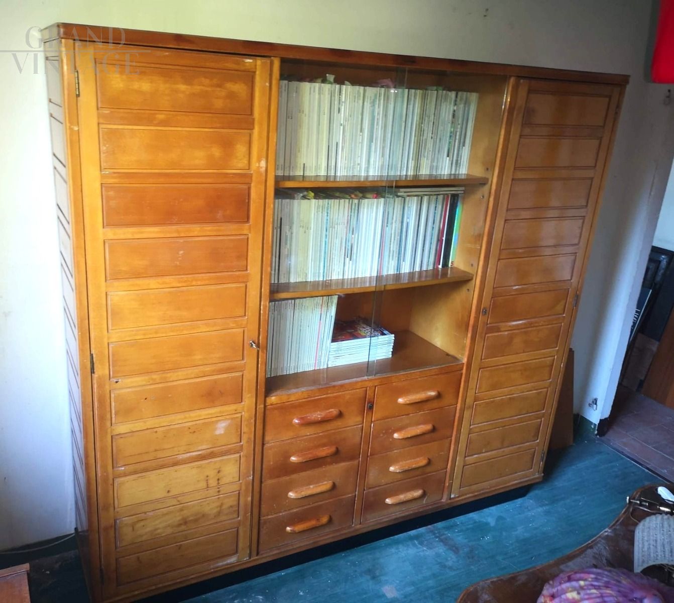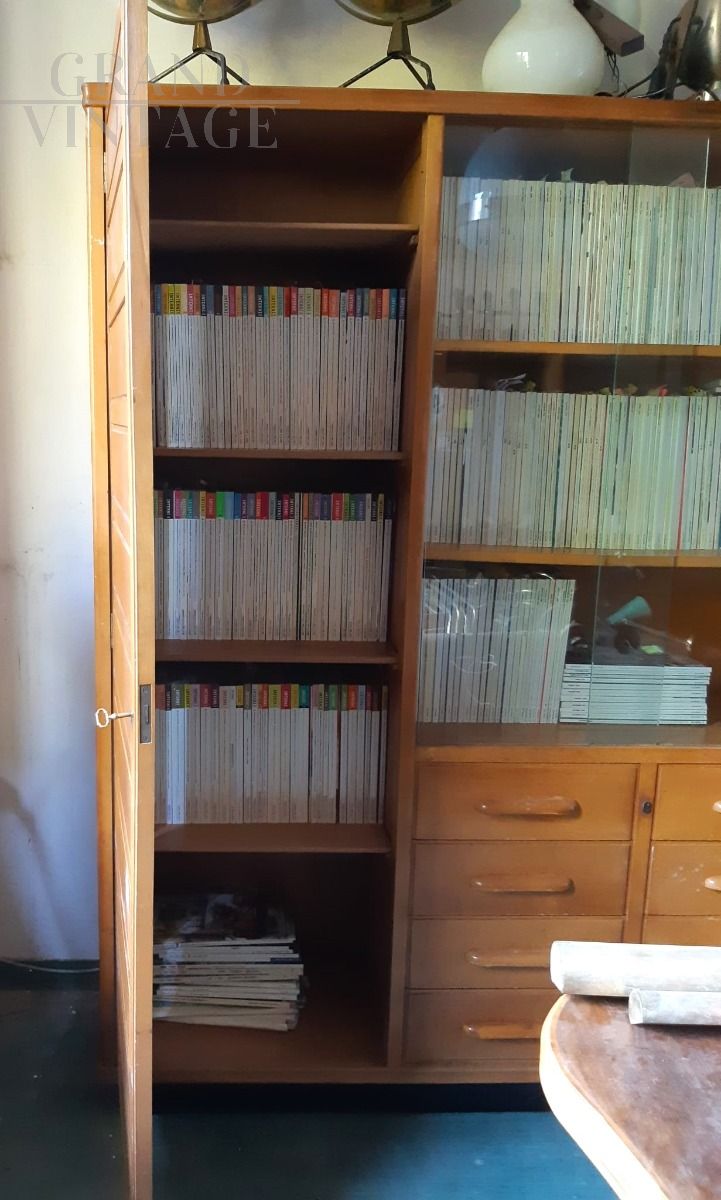 Grande libreria da ufficio Anonima Castelli anni '60 in legno con tre vani centrali a vetrina, con antine a scorrimento. La parte inferiore è caratterizzata da 8 cassetti, e nelle parti laterali due ante che celano vani a ripiani. Completa di chiavi.