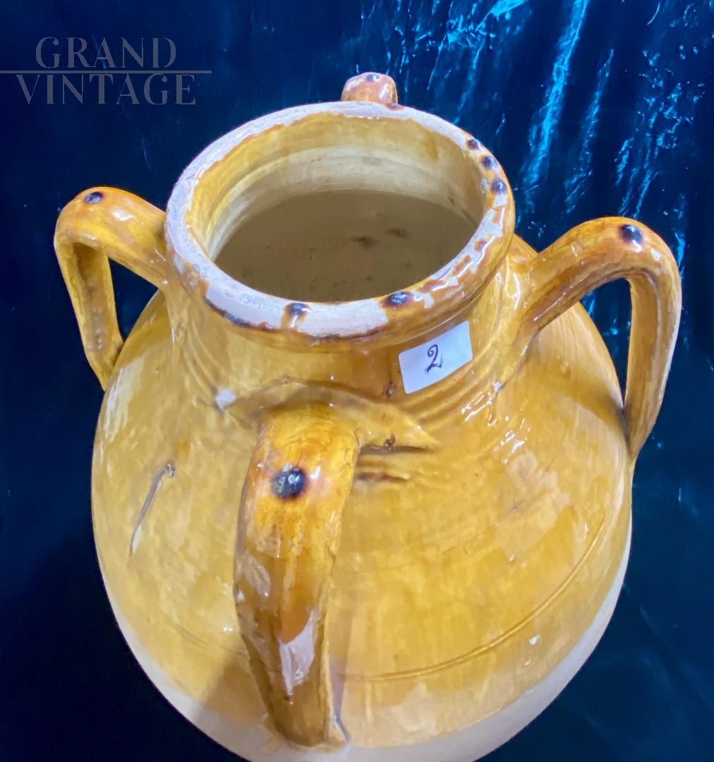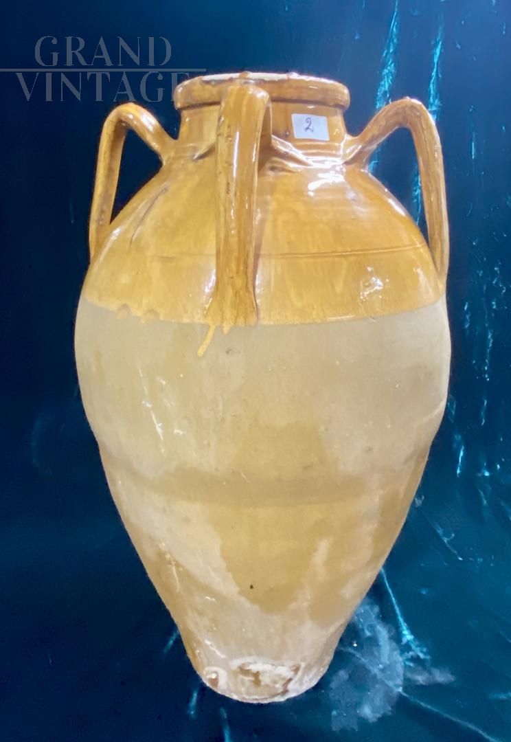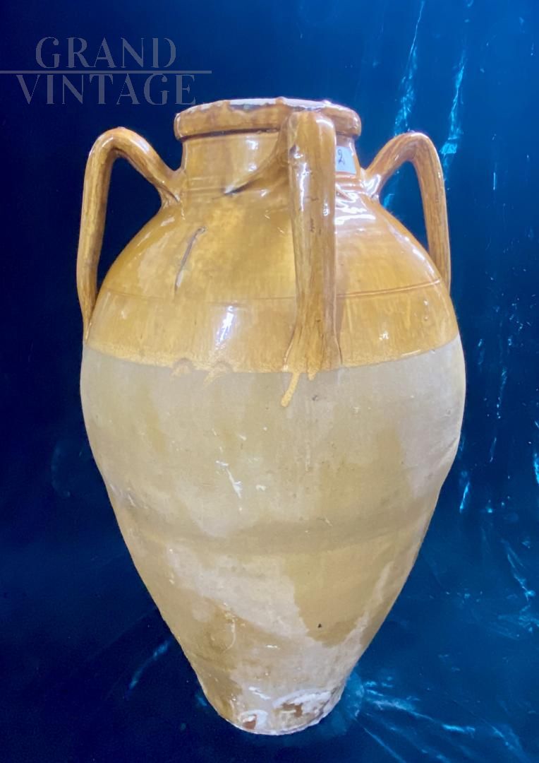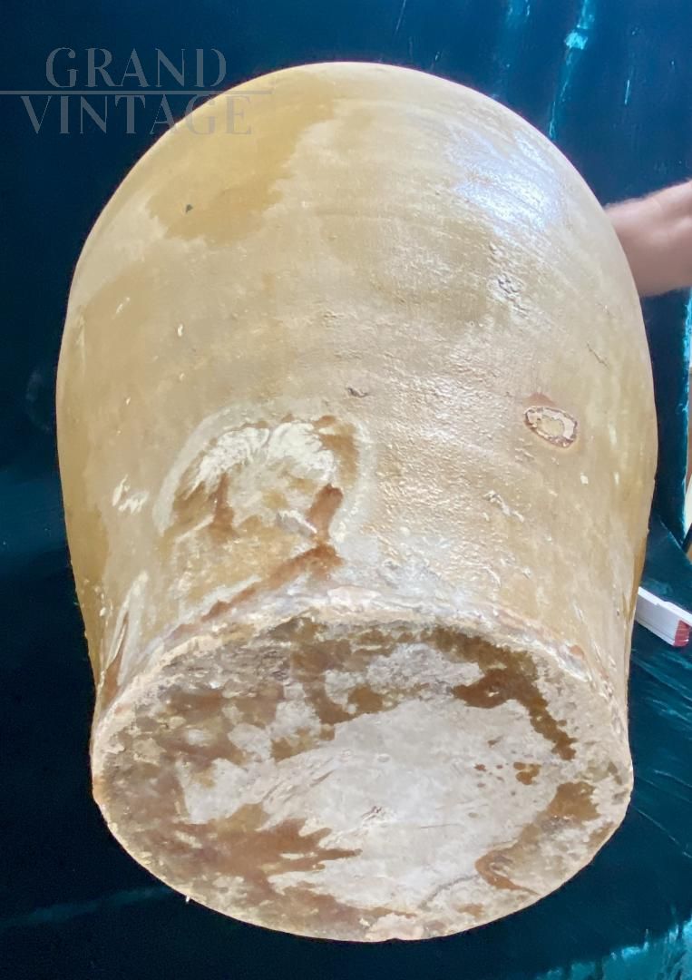 Il capasone presenta 4 anse robuste per facilitarne la movimentazione, lo smalto color miele nella parte alta presenta belle colature naturali che ne esaltano l’autenticità. La parte del corpo non smaltata nella parte inferiore è tipica della manifattura originale. Pezzo autentico di arte contadina pugliese, ideale per collezionisti, arredamento rustico, masserie, agriturismi o come elemento decorativo dal forte impatto scenico. In buono stato di conservazione, con i naturali segni del tempo che ne testimoniano l’autenticità.