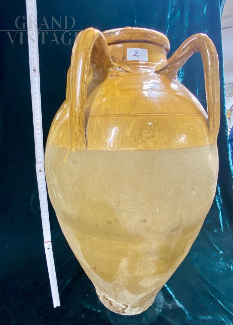 Splendido esemplare di capasone tradizionale pugliese realizzato in terracotta smaltata nella parte superiore, con la caratteristica finitura bicolore. Questo recipiente veniva utilizzato nelle masserie e nelle case contadine per la conservazione di vino, olio e altri alimenti.