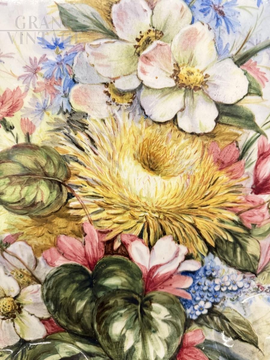 Grande piatto da portata antico in maiolica della fine dell'800 di manifattura Nove di Bassano, con magnifica forma a fazzoletto e finemente dipinto con motivi florali e farfalle, diametro 60 cm. Di splendida qualità pittorica, il piatto è in stato molto buono. Firmato sul retro.