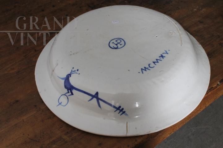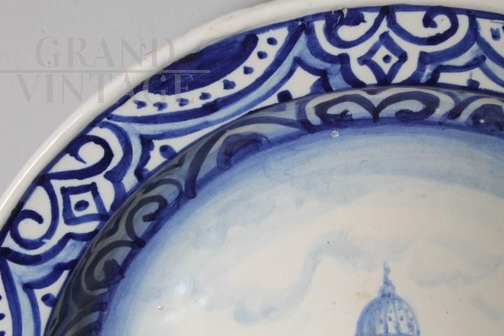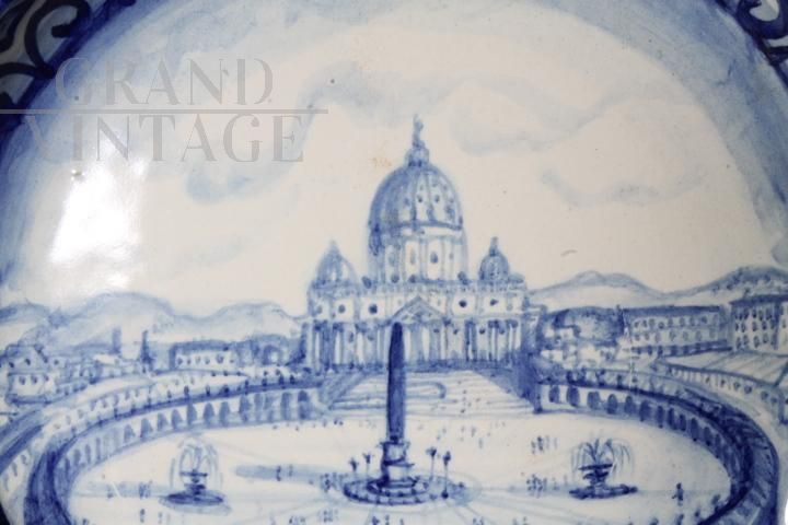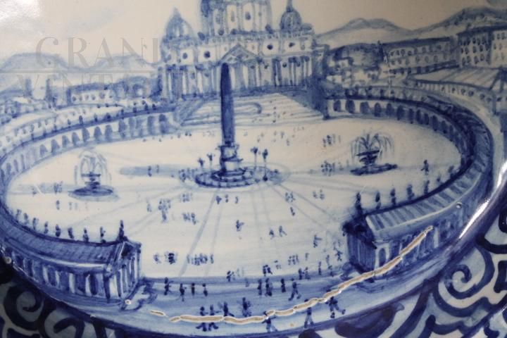 Grande piatto antico in maiolica art déco del 1915 raffigurante Roma - Piazza San Pietro, dipinta in blu su sfondo bianco, di manifattura francese, firmata e datata sul retro. Diametro 45 cm.