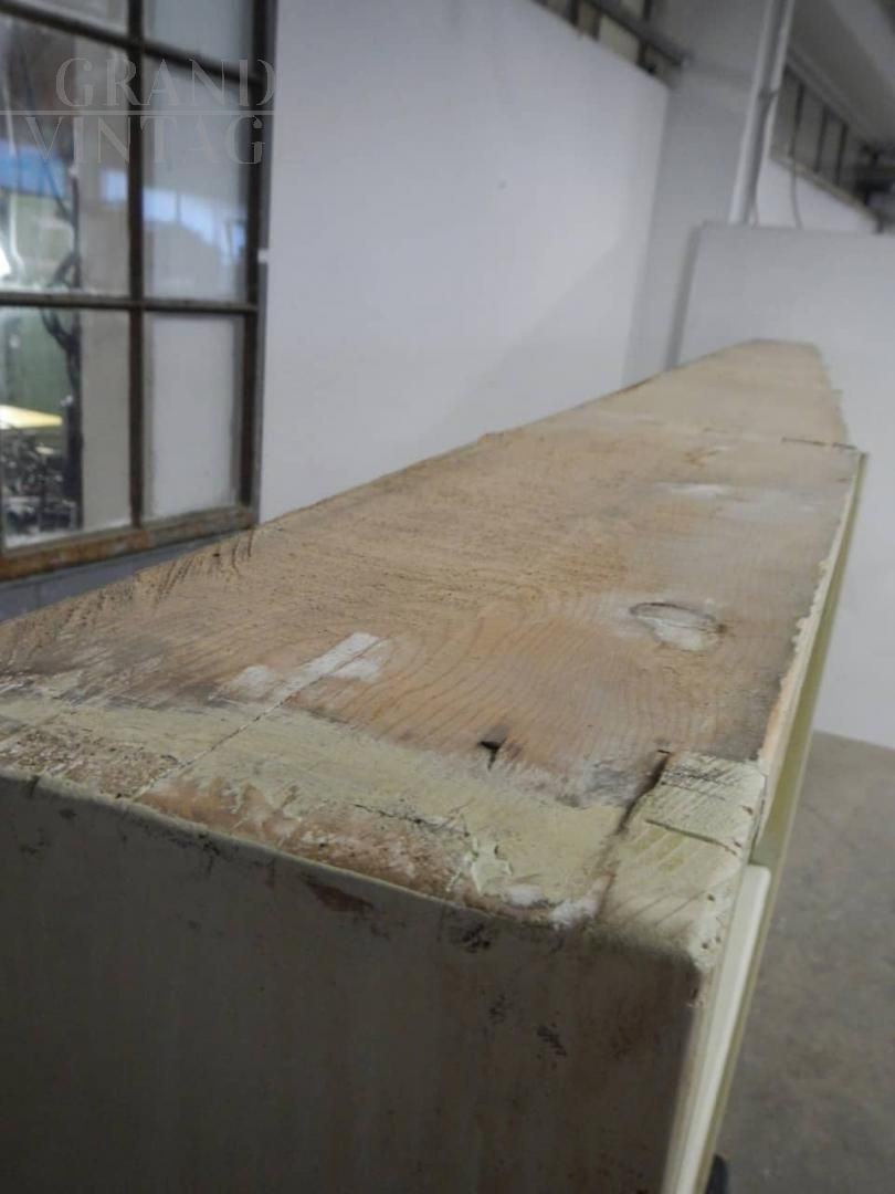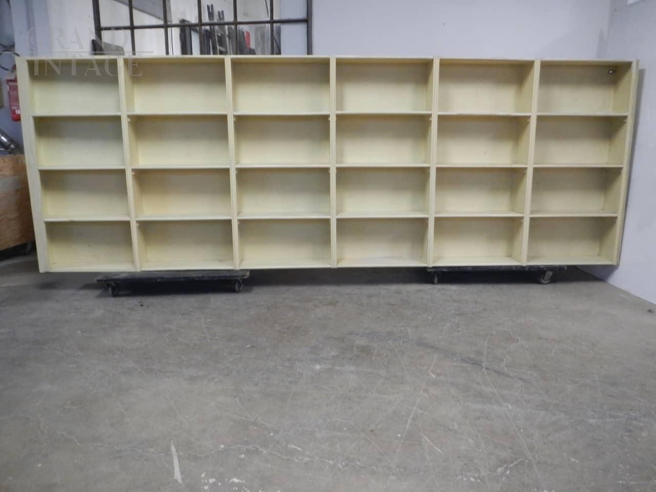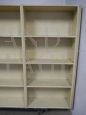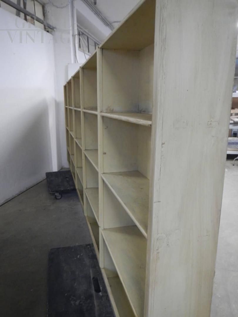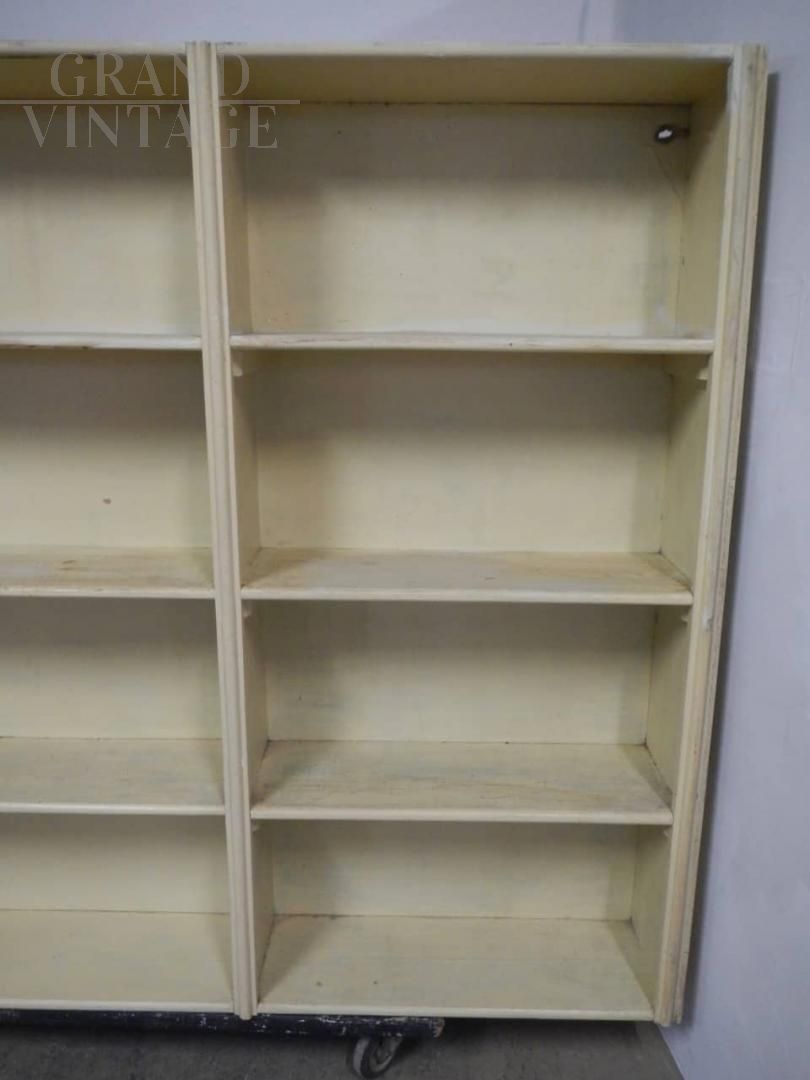 Grande scaffale vintage per negozio, in abete e faesite, laccato e restaurato, anni '50.