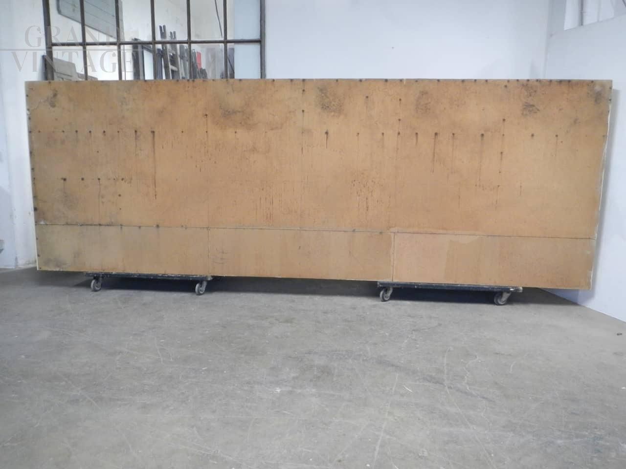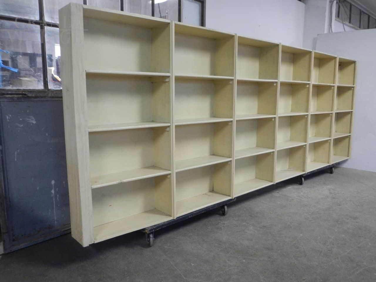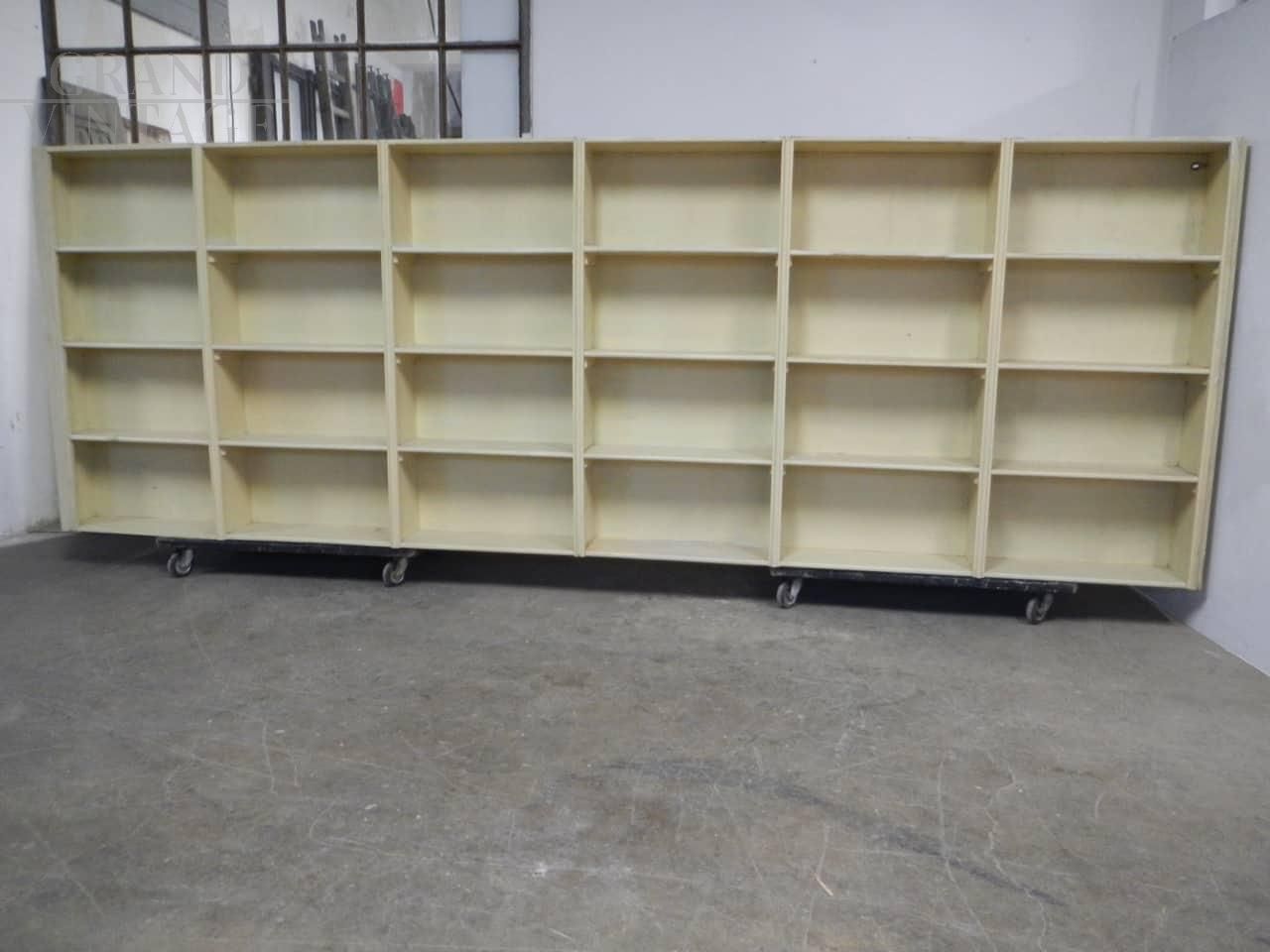 Grande scaffale vintage per negozio, in abete e faesite, laccato e restaurato, anni '50.