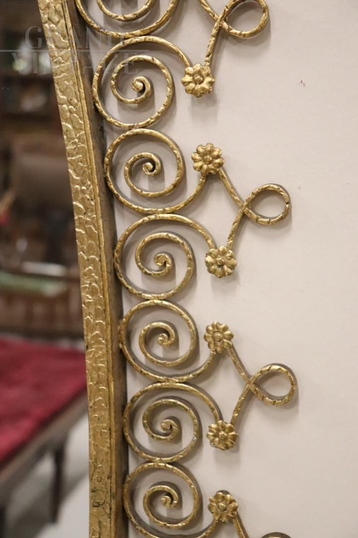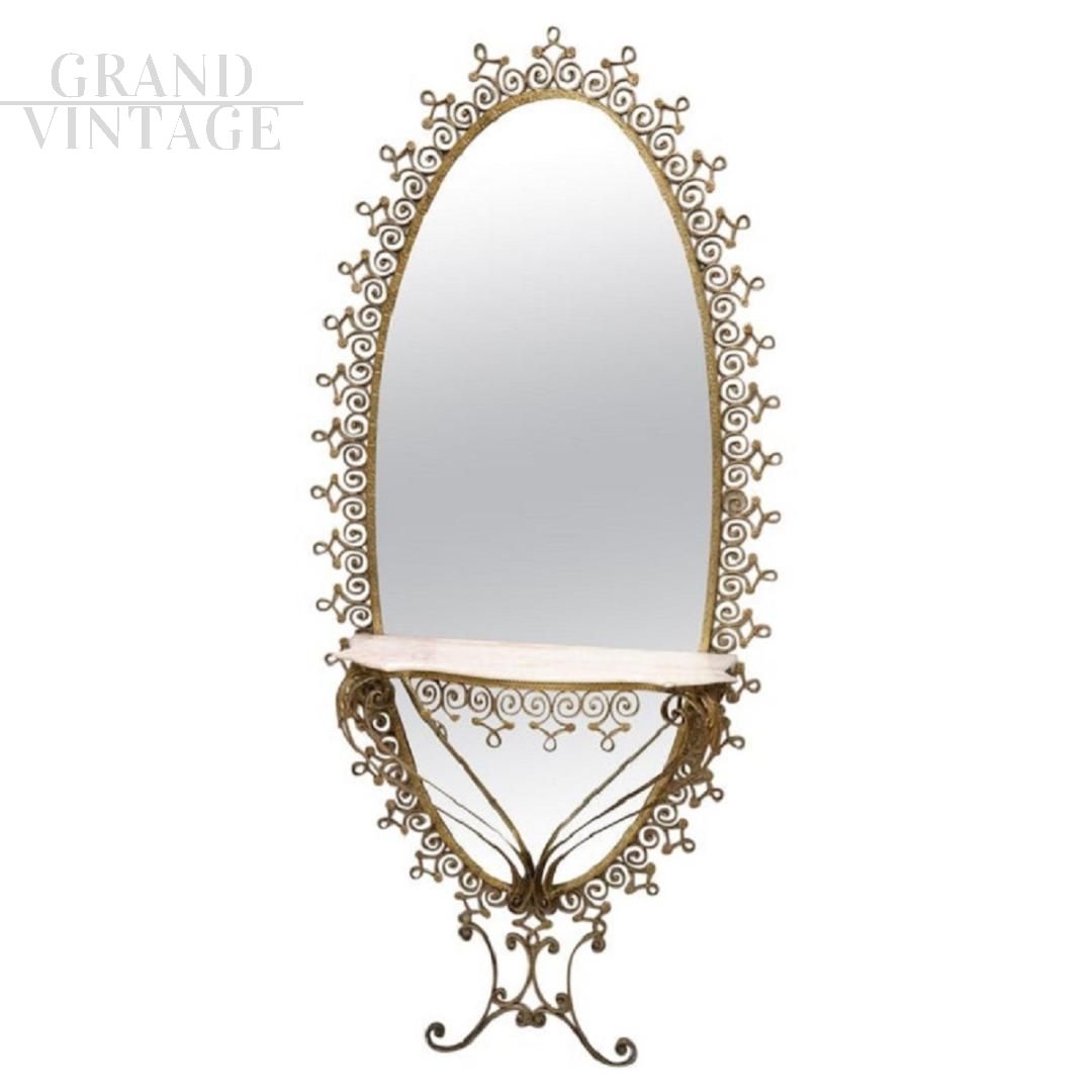 Splendido specchio ovale da terra, uno squisito pezzo di design italiano della metà del secolo scorso, attribuile al designer Pier Luigi Colli. Questo maestoso specchio presenta una cornice in ferro battuto splendidamente dorata, con un'accattivante decorazione ondulata ornata da riccioli e spirali che si susseguono elegantemente in un disegno armonioso, intervallato da delicati motivi floreali. La doratura esalta l'intricato disegno, creando un perfetto equilibrio tra opulenza e sobria eleganza. Questo specchio non è solo un elemento visivo di grande impatto, ma è anche un funzionale tavolo consolle, completo di un raffinato piano in marmo chiaro con venature rosa tenue. In eccellenti condizioni, prezzo trattable.