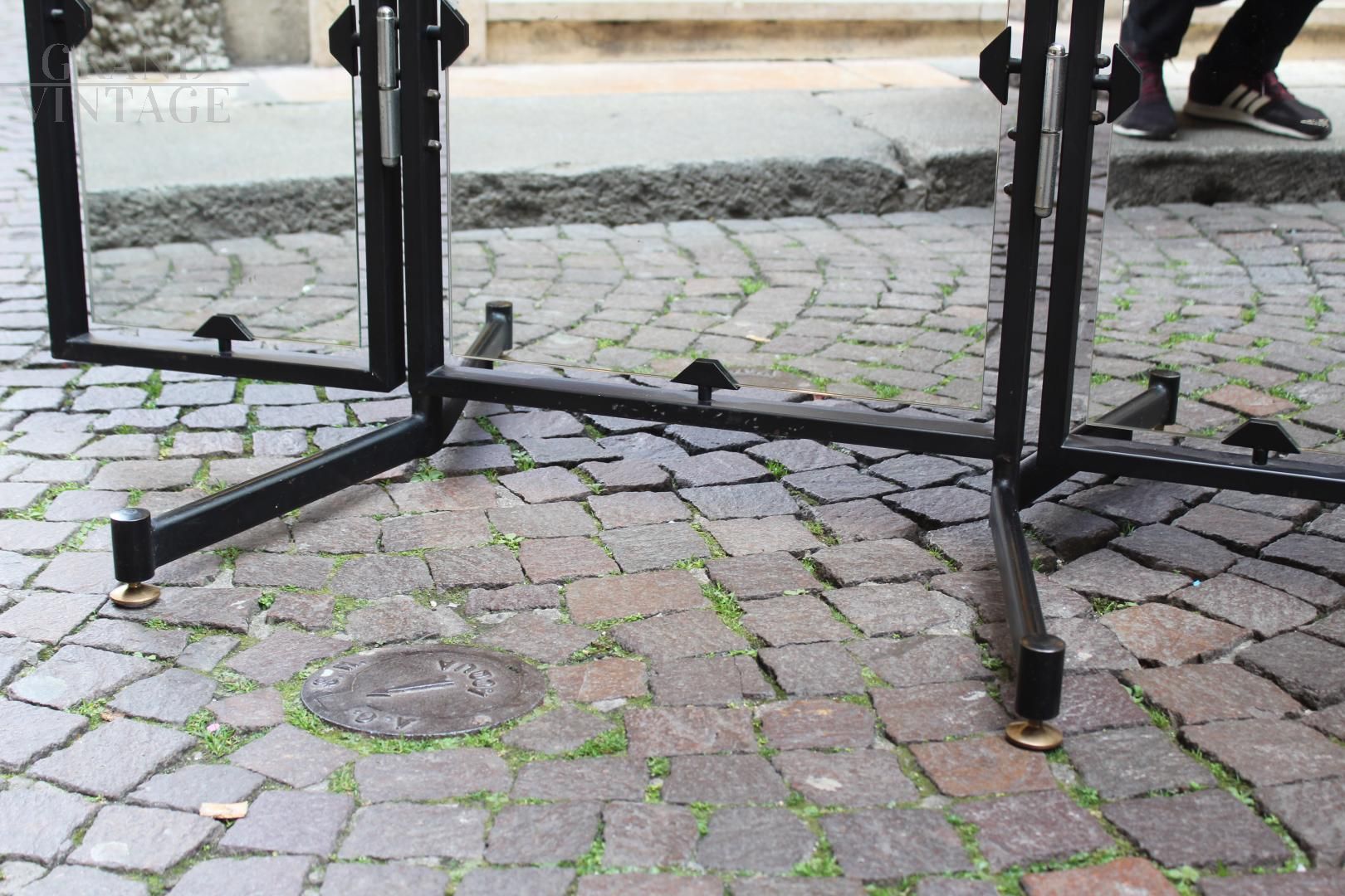 Specchio da atelier vintage pieghevole, Italia anni '70, composto da 3 specchi separati direzionabili su struttura in metallo laccato nero con piedini in ottone, apparteneva ad un importnte atelier della città di Verona. In ottimo stato di conservazione.