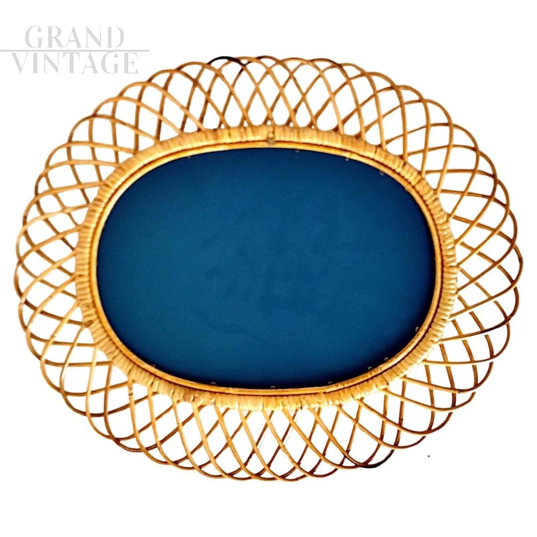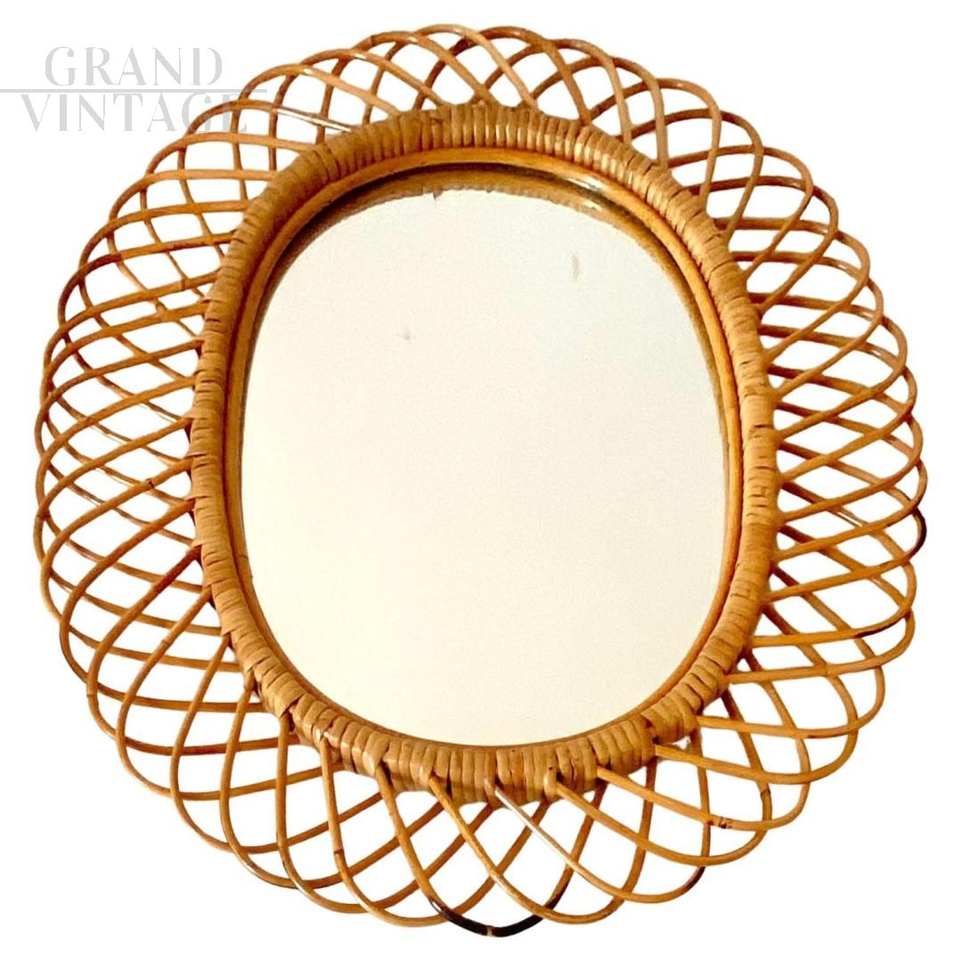Grande specchio modello Sunburst in bambù e rattan nello stile di Bonacina, Italia anni '60. Elegante specchio da parete in bambù e rattan prodotto in Italia negli anni '60 e disegnato nello stile di Franco Albini e Bonacina. Modello di grandi dimensioni (quelli medi sono 67 cm x 56 cm). Pezzo di design artigianale finemente rifinito con cornice curva in bambù e rattan. Piccoli segni di ossidazione sulle parti in bambù (pezzi neri). Specchio originale, senza danni o rotture. Ottime condizioni con solo pochi segni di usura e utilizzo.