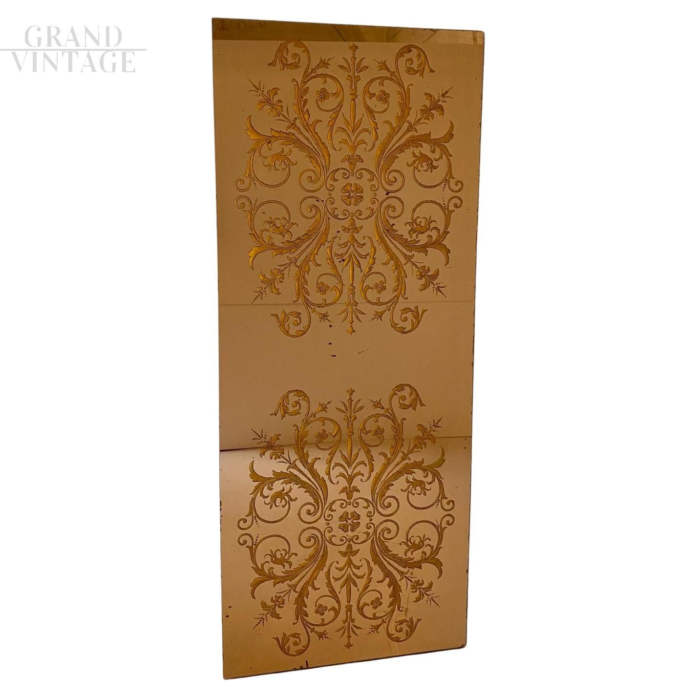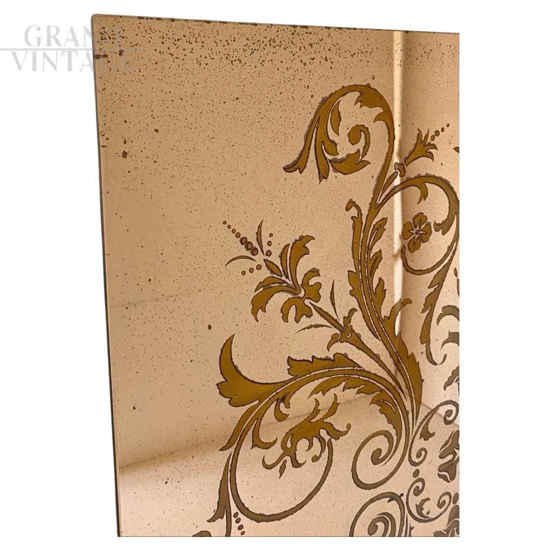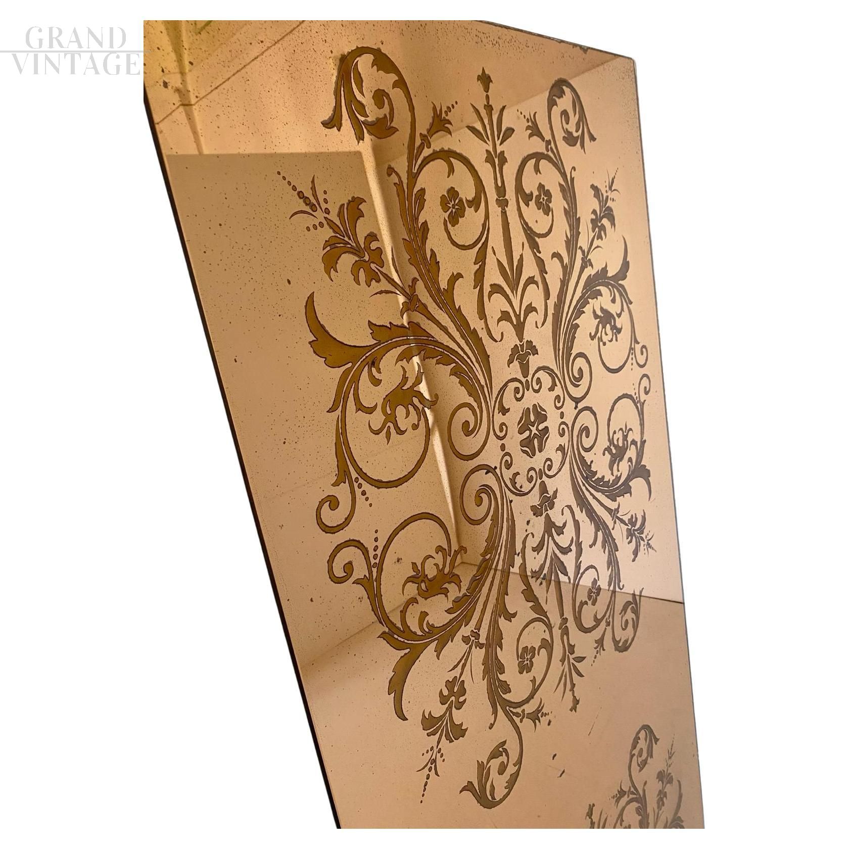 Magnifico raro specchio da parete degli anni '60 a figura intera con vetro leggermente fumé finemente decorato all'interno del vetro con motivi floreali. Lo specchio è Integro e con bellissimi segni di ossidazione, in buone condizioni.