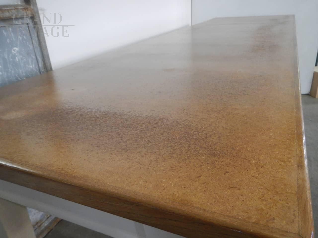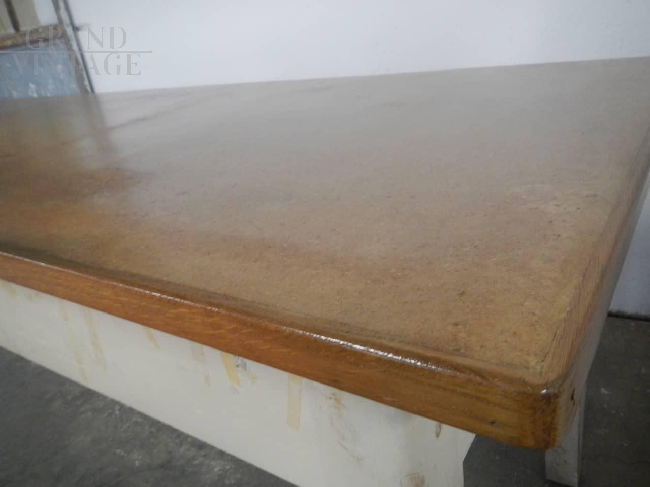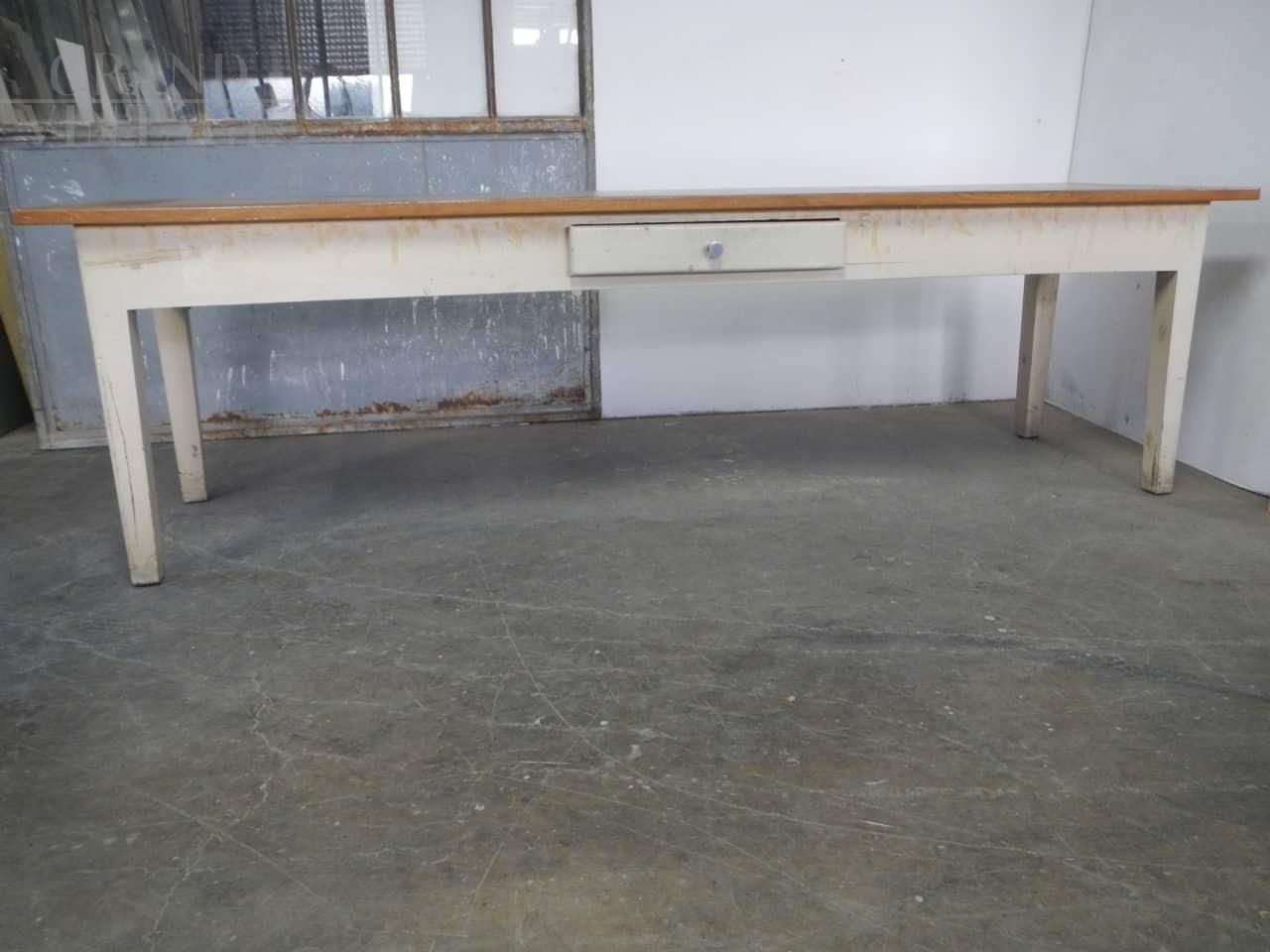 Tavolo da lavoro da industria tessile in legno di abete laccato bianco con piano in legno compresso e cassetto centrale. Trattato con vernice da legno, in buone condizioni, presenta i naturali segni dell'uso e del tempo.