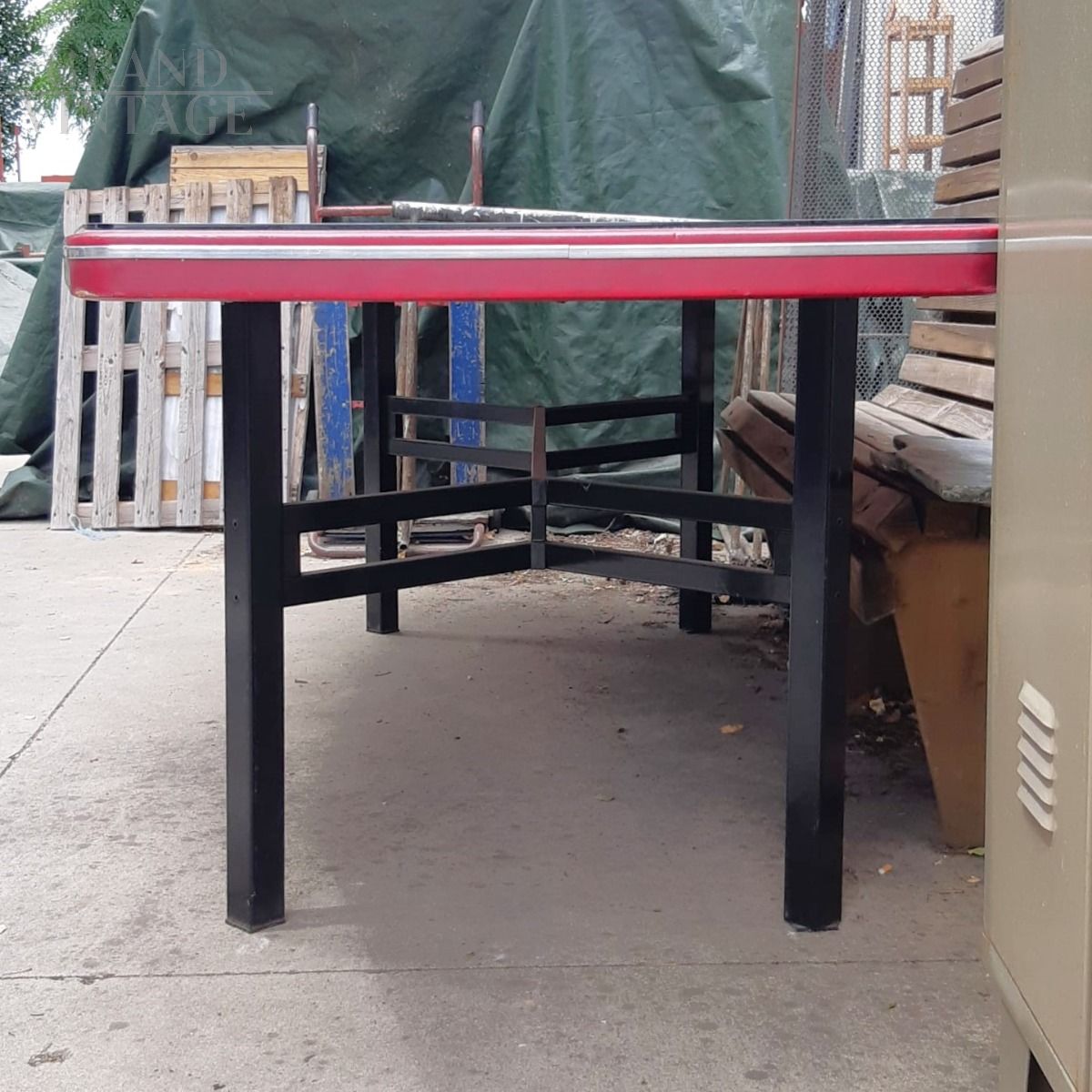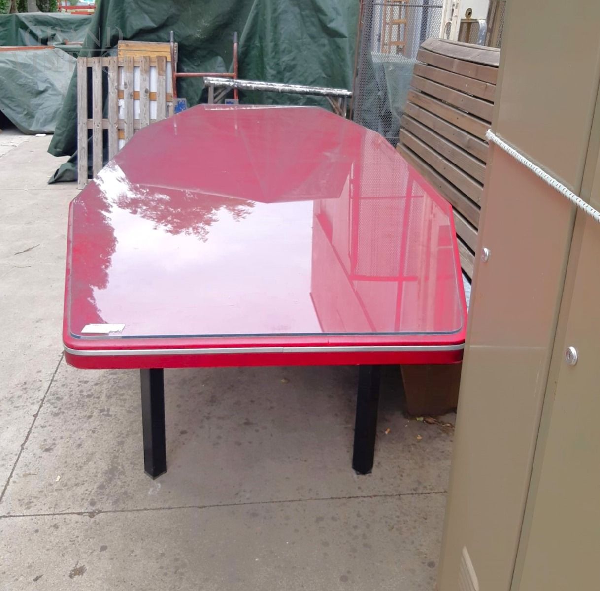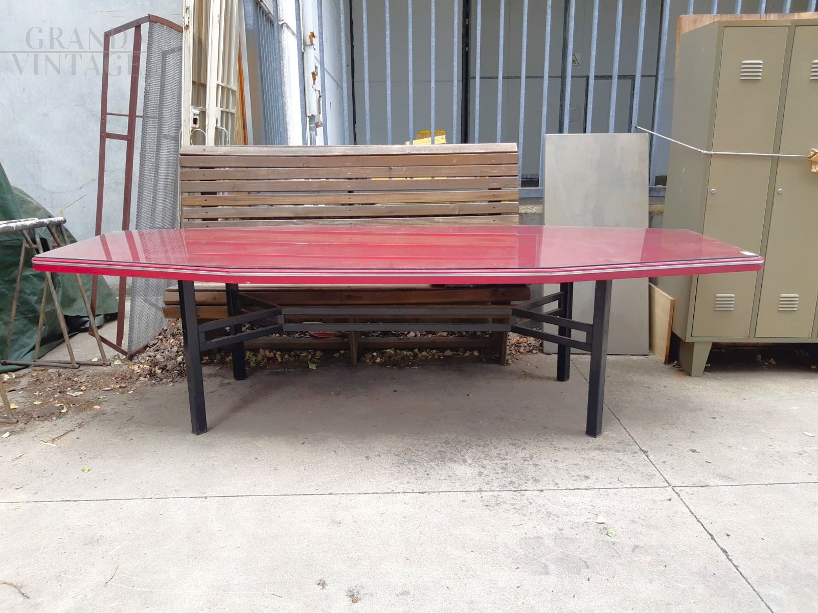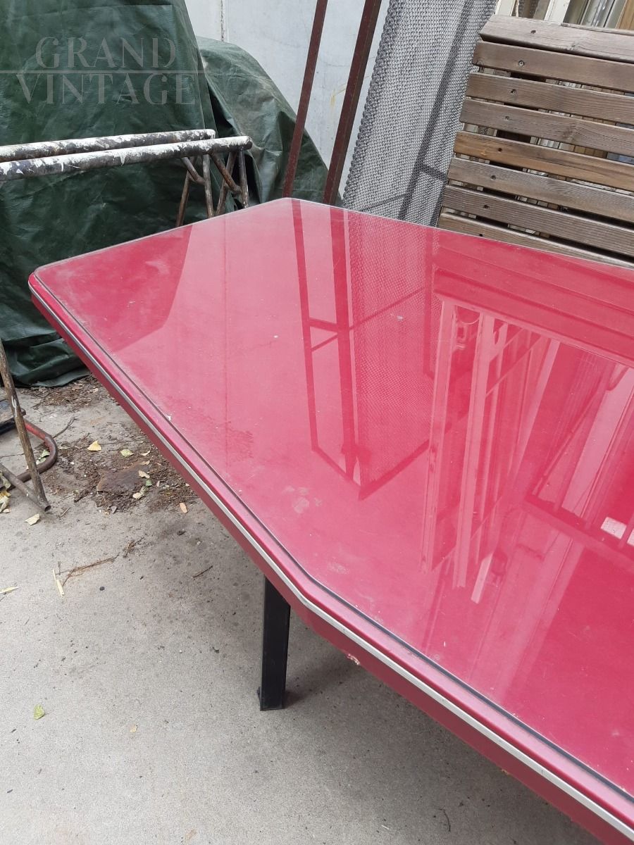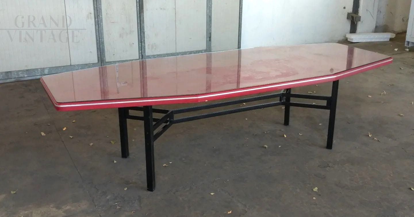 Grande tavolo da riunioni design vintage di fine anni '50 con struttura in ferro nero, piano dalla particolare forma smussata in legno laccato bordeaux con top in vetro, lunghezza 3 metri. In ottime condizioni.