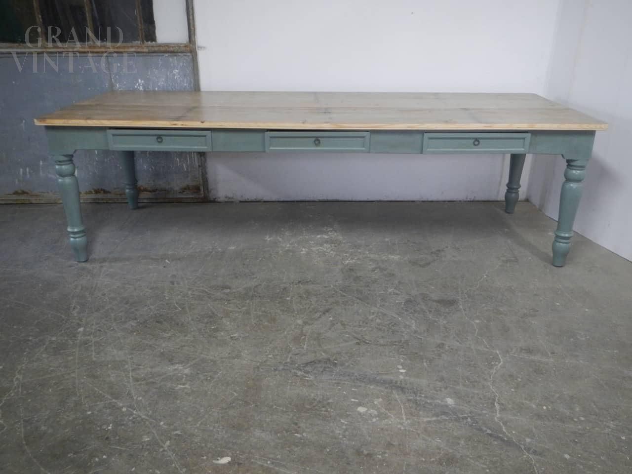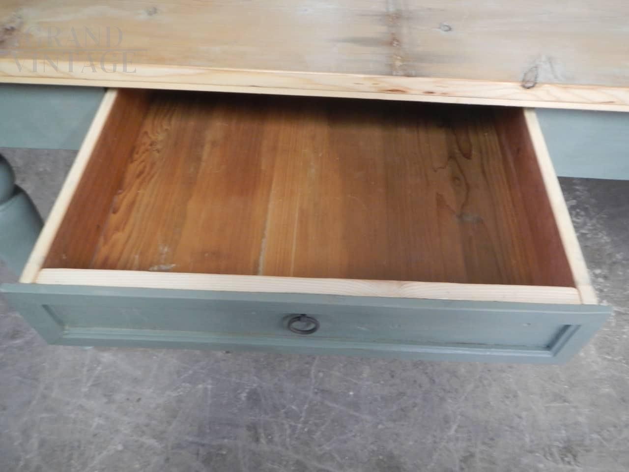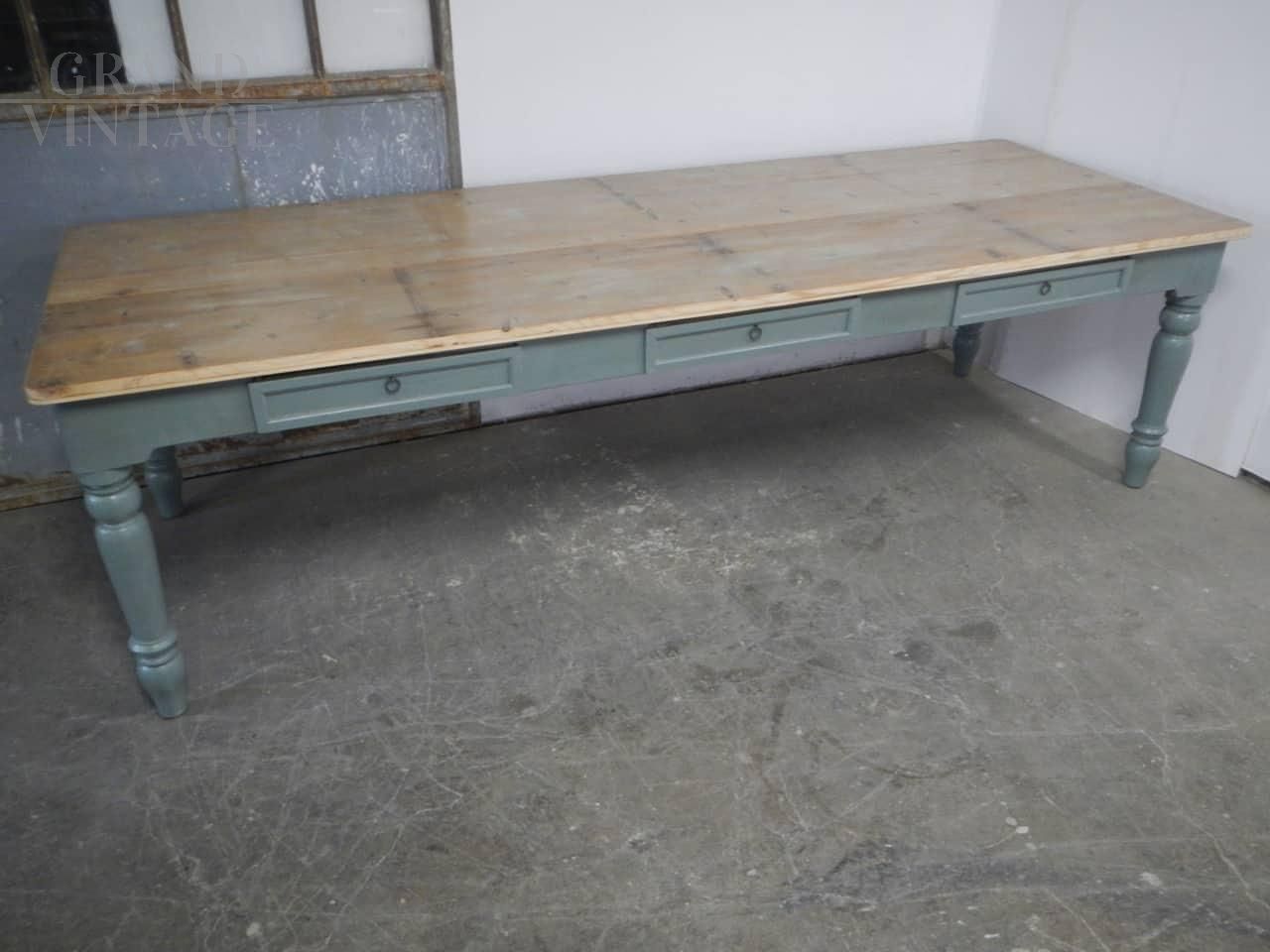 Grande tavolo vintage in abete in pittura verde - grigia con belle gambe tornite, dotato di 3 cassetti ricostruiti a nuovo e di un piano in abete naturale in patina.